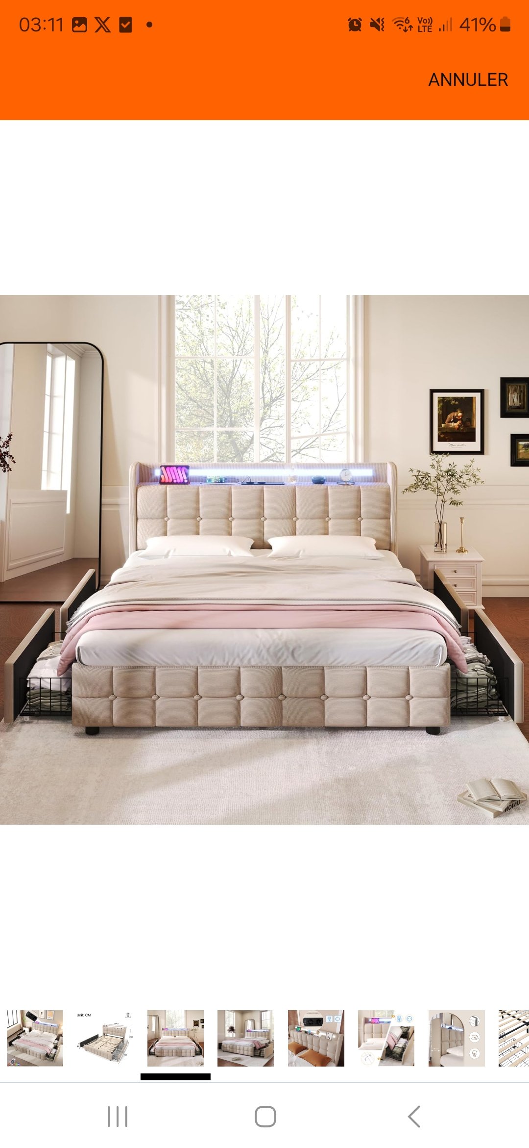 Ensemble lit, sommier à lattes et cadre de lit rembourré avec prises USB et LED intégrées pour la lumière. Celui-ci possède 4 tiroirs en guise d'espaces de rangement pour y mettre du linge (draps, coussins etc) ou des effets personnels. Look moderne avec carré rembourré et de couleur crème / beige.