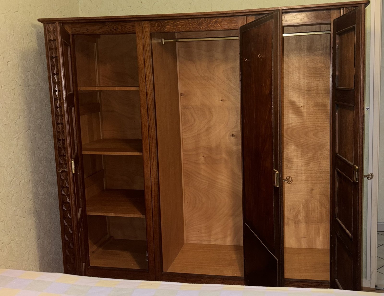 Jolie penderie / armoire / dressing en chêne, à motifs en reliefs avec miroir, composée d'un côté comprenant 4 étagères pour rangement ainsi que 2 autres côtés séparés afin de pendre sur cintre les vêtements. Très bien conservé, pièce rare