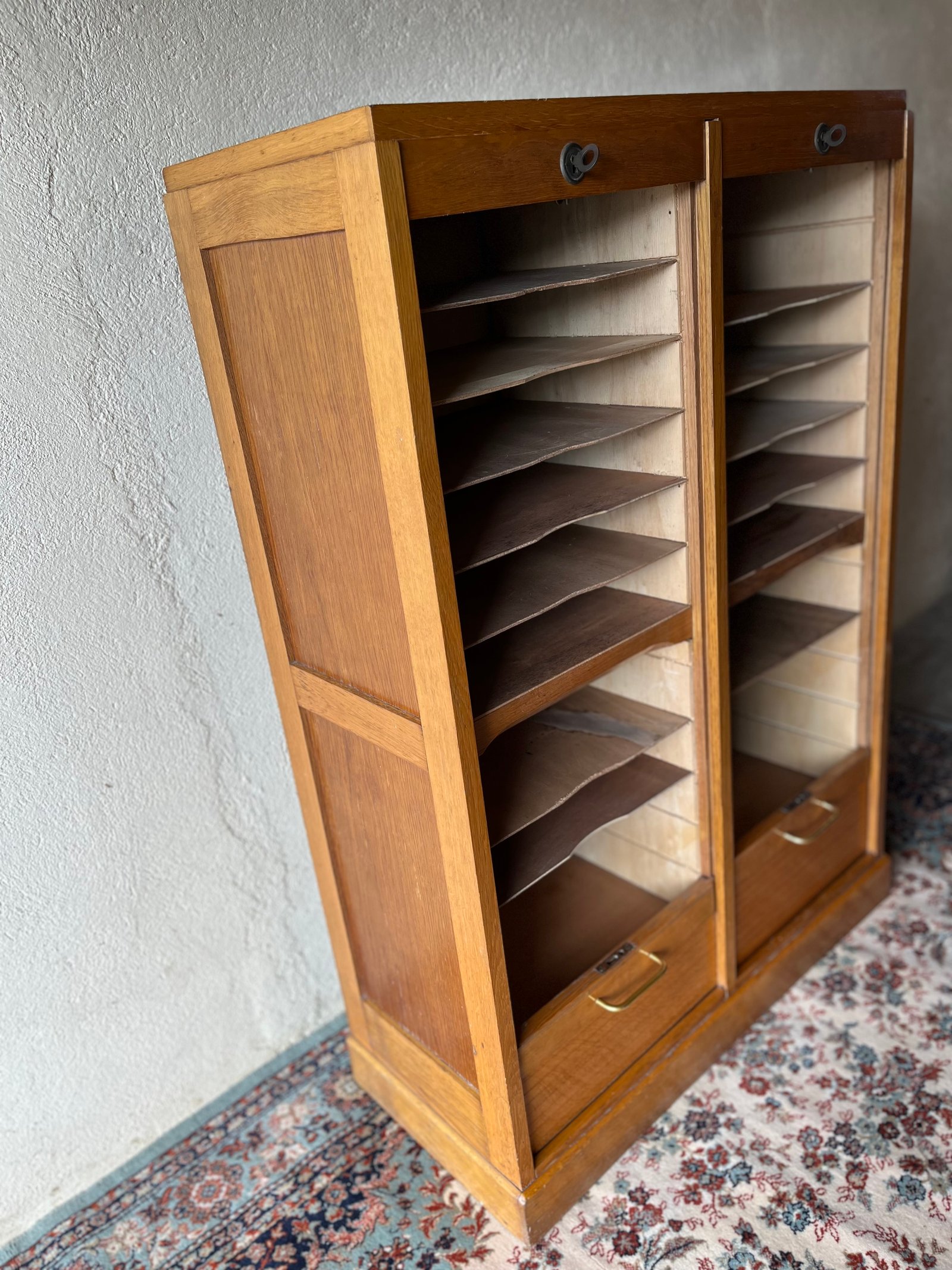 Meuble classeur à rideaux doubles vintage des années 70, de couleur miel. Doté de nombreuses étagères que vous pouvez positionner comme vous le souhaitez. Séparation entre les 2 compartiments qui se ferment avec les clés d’origine. Les rideaux se coulissent très bien. En bel état général malgré une tache d’encre sur le dessus et quelques traces du temps. Très pratique dans un bureau, il ajoutera une belle touche vintage.