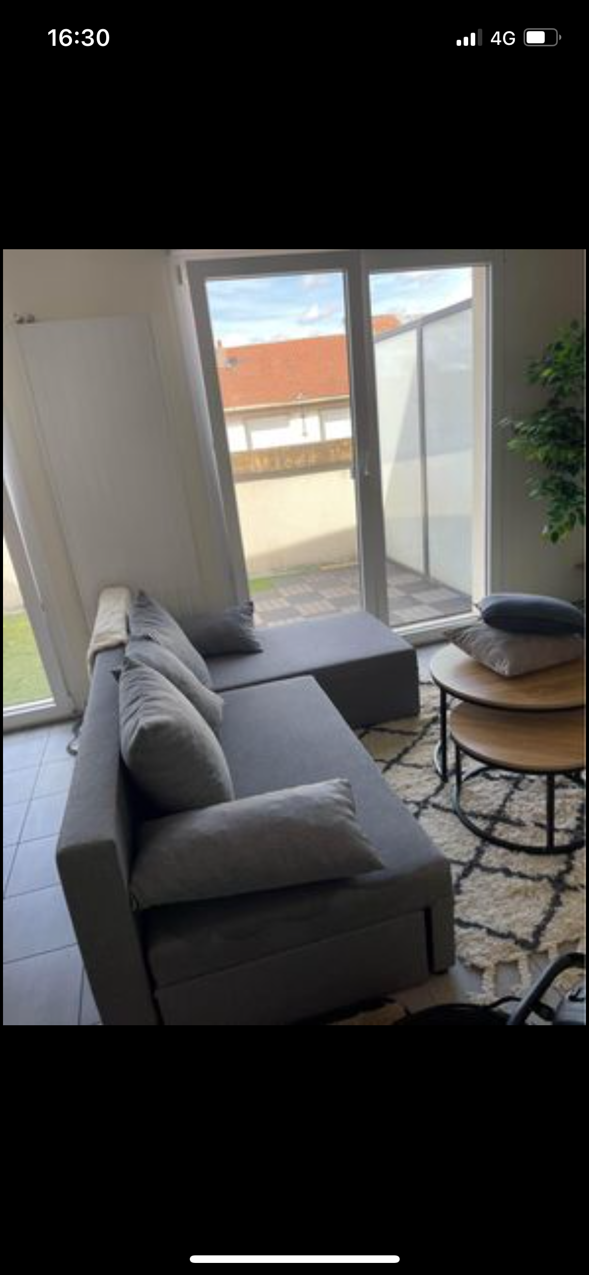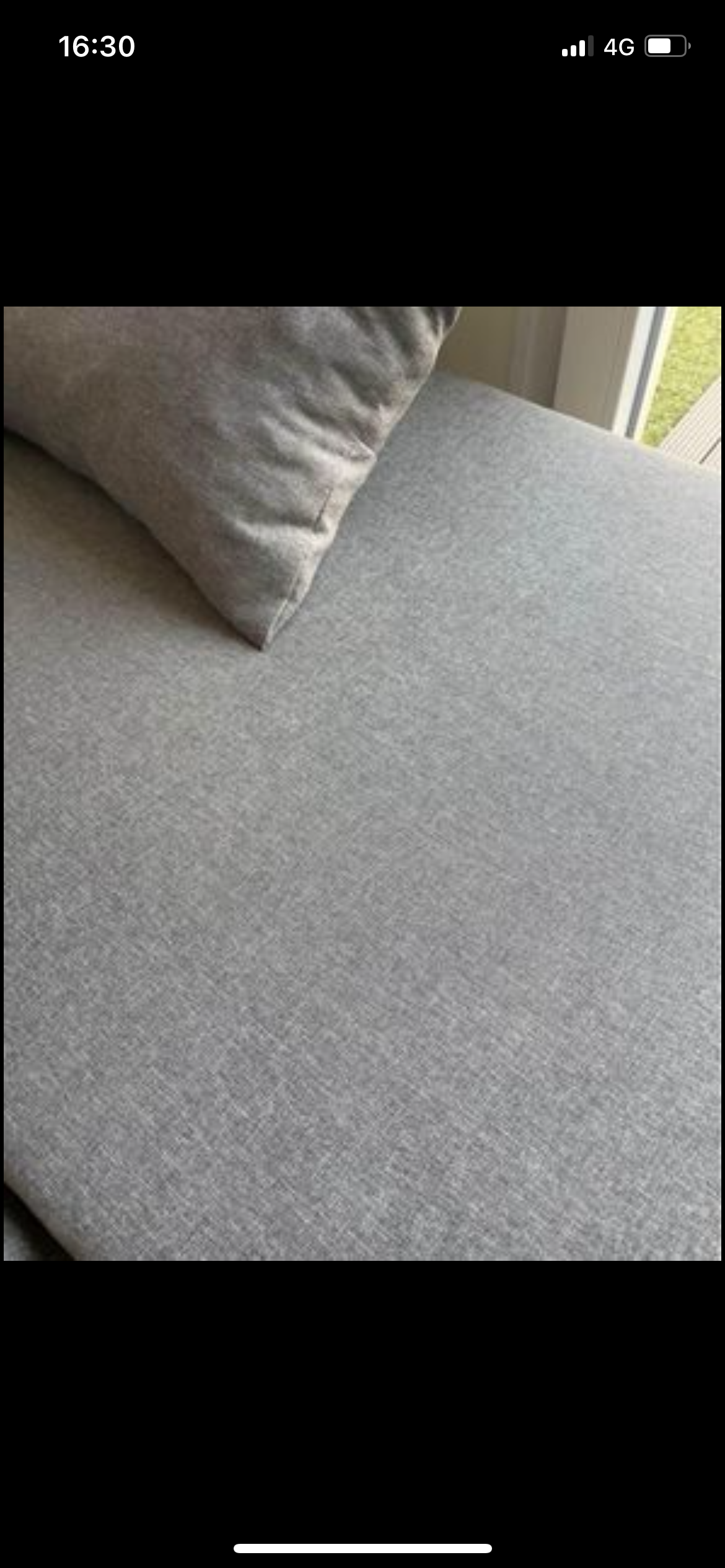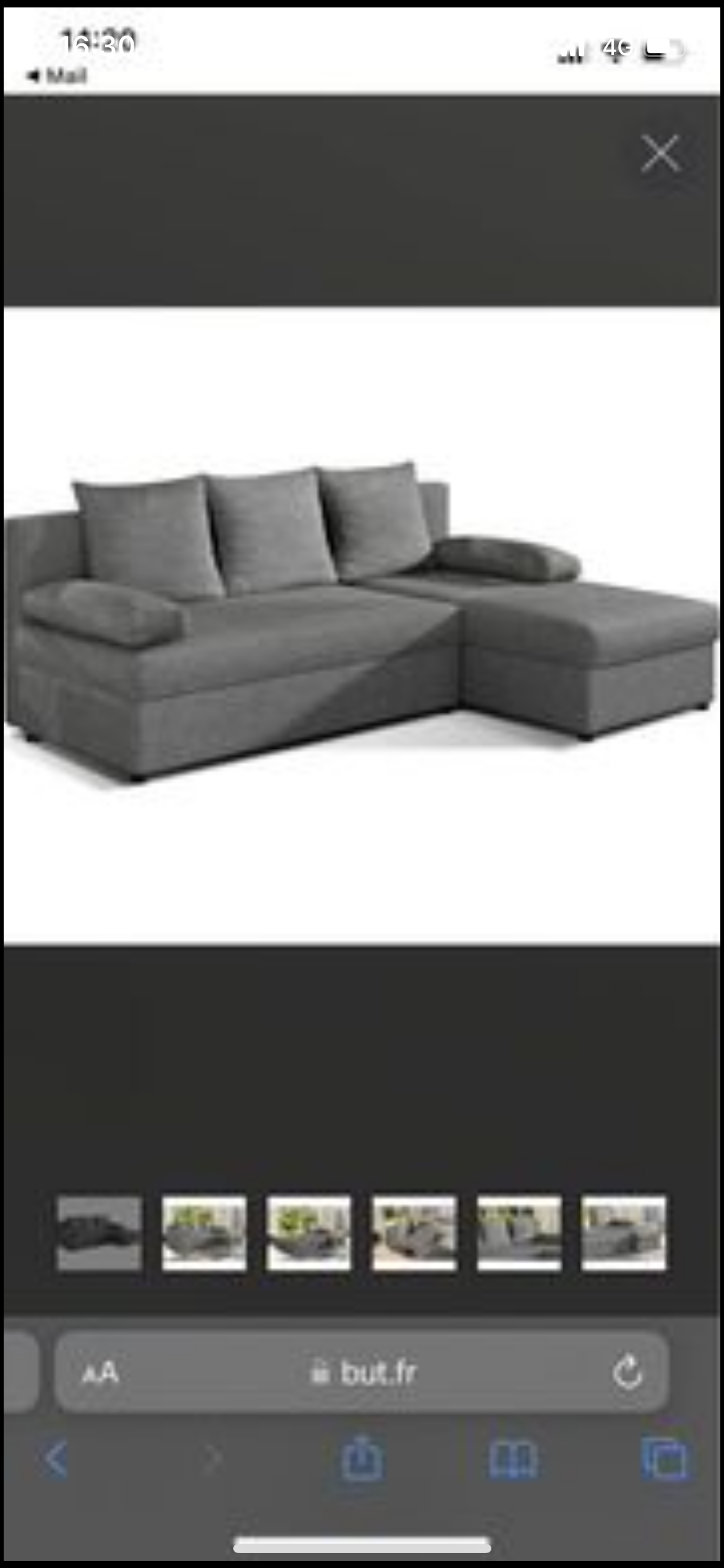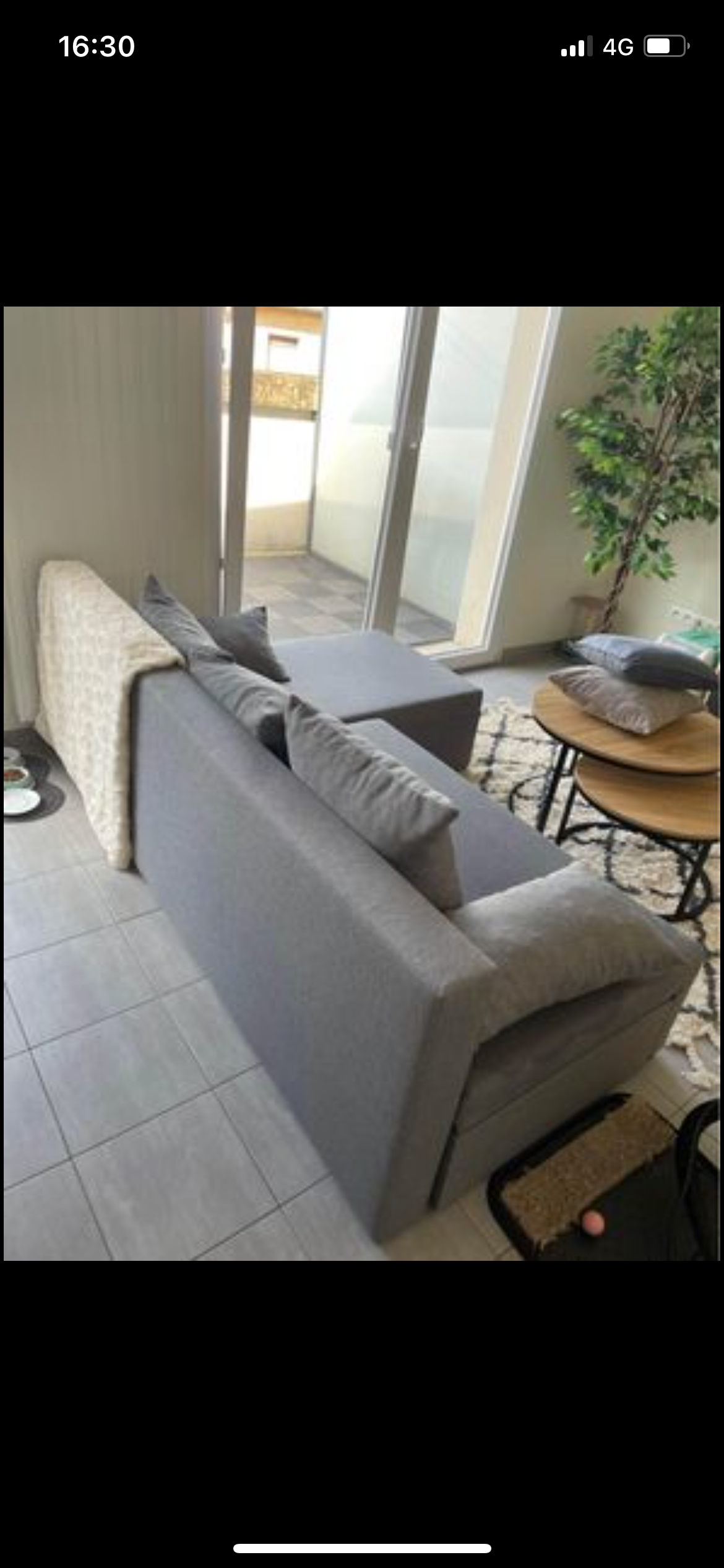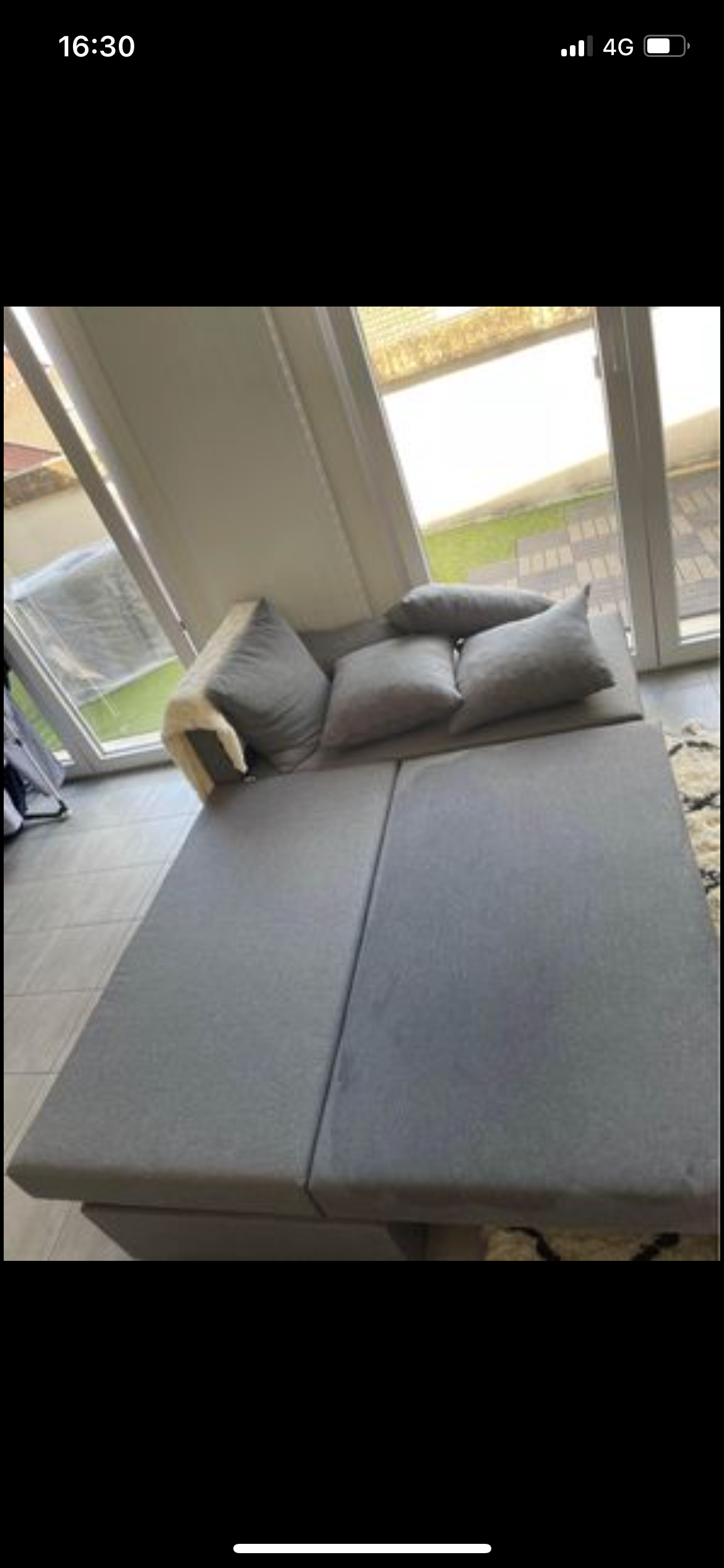 Canapé en excellent état, moins d’un an. Il est convertible et en très bon état, n’a aucune traces d’usure ni de tache. Sur la photo où le canapé est déplié, une partie est plus grise que l'autre car je venais de le nettoyer mais c'est uniforme. Pour information, lors de la réception du canapé, j’ai eu des pièces manquantes qui permettait de maintenir le dossier donc j’ai fais à ma manière en mettant du bois plus solide en dessous des lattes de bois d’origine, en vissant des tires fonds. Du scotch est mis dessus pour protéger le tissu du canapé contre le frottement.