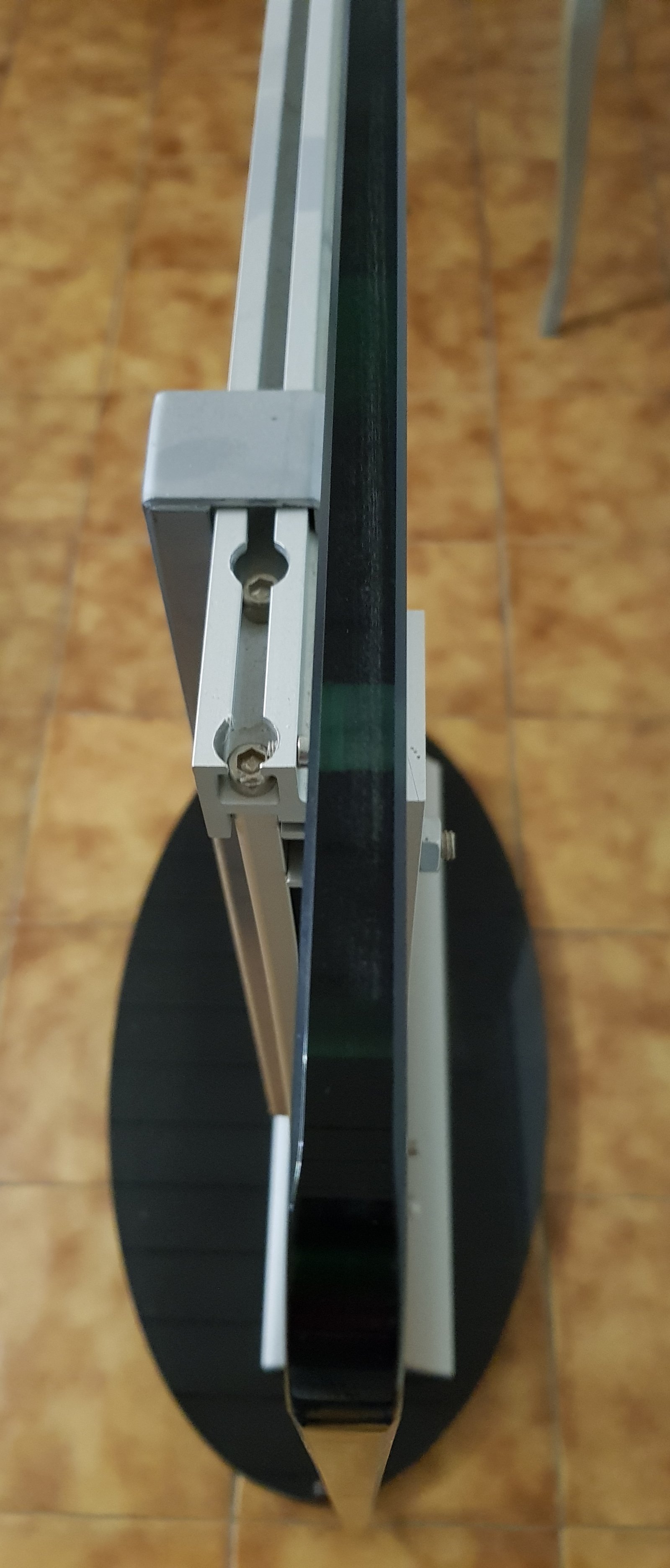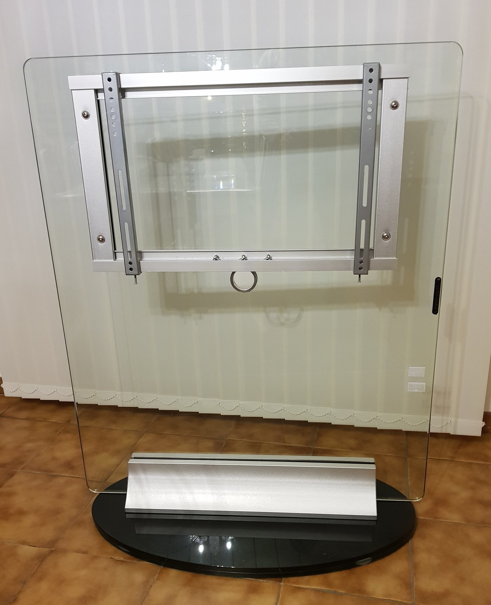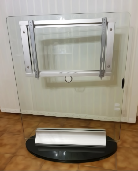Structure tout en verre design matériaux : Support en verre translucide trempé épaisseur 15 mm base en verre noir trempé épaisseur 15 mm . Incrustations et rack d accrochage en aluminium. Liaison socle et structure en alliage d aluminium. Convient aux écrans plats de 32 à 75 pouces.