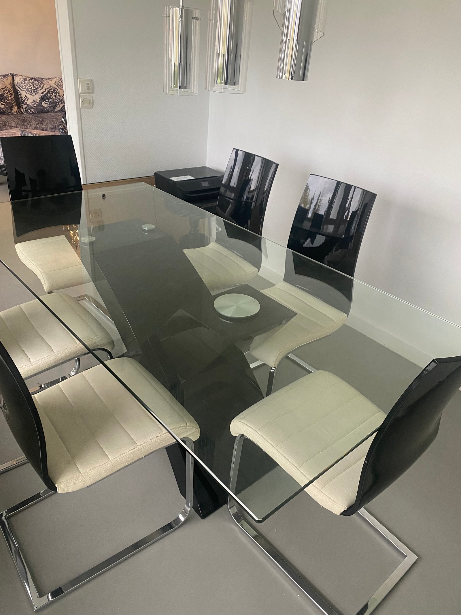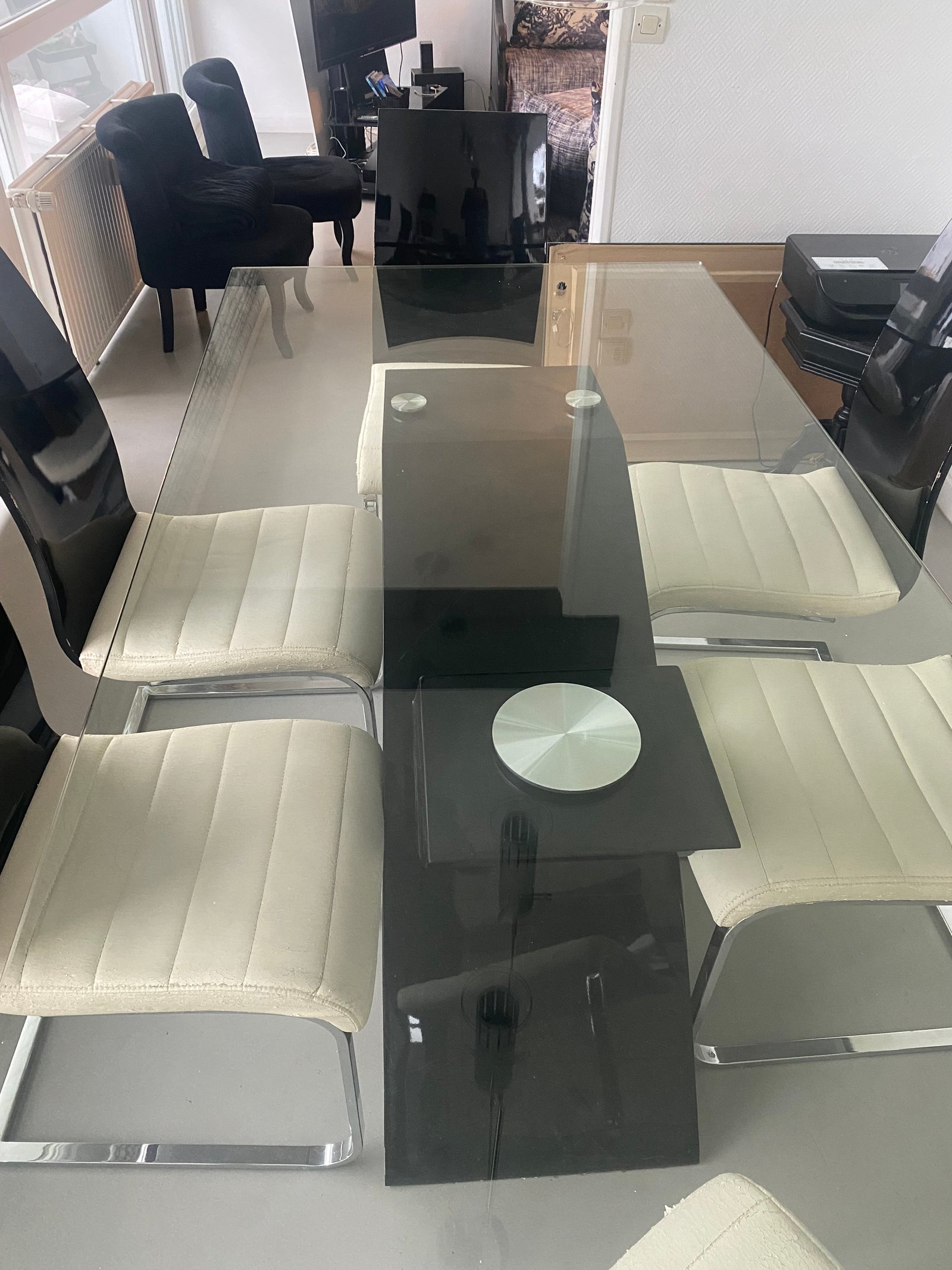 Vends ma table à manger en verre noir sans les chaises, très bon état.