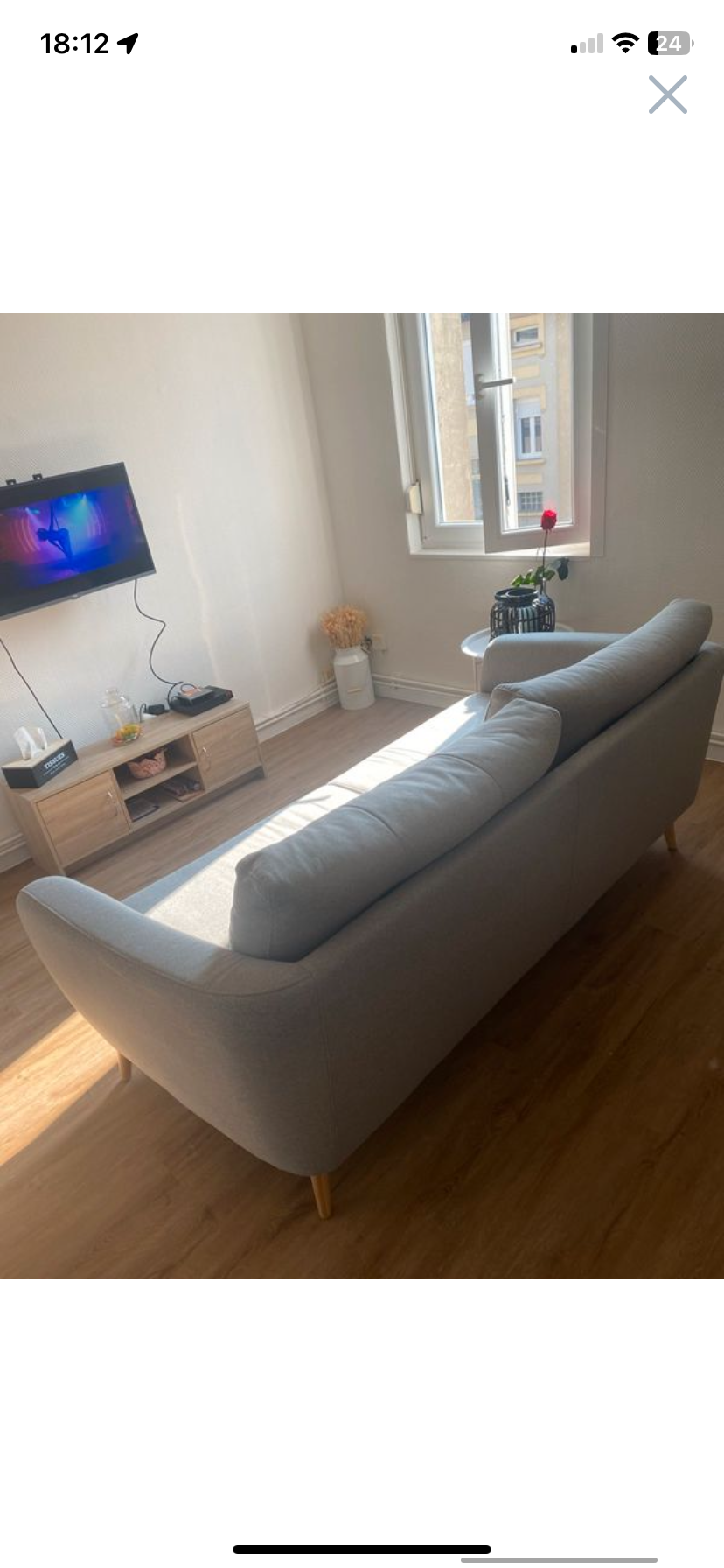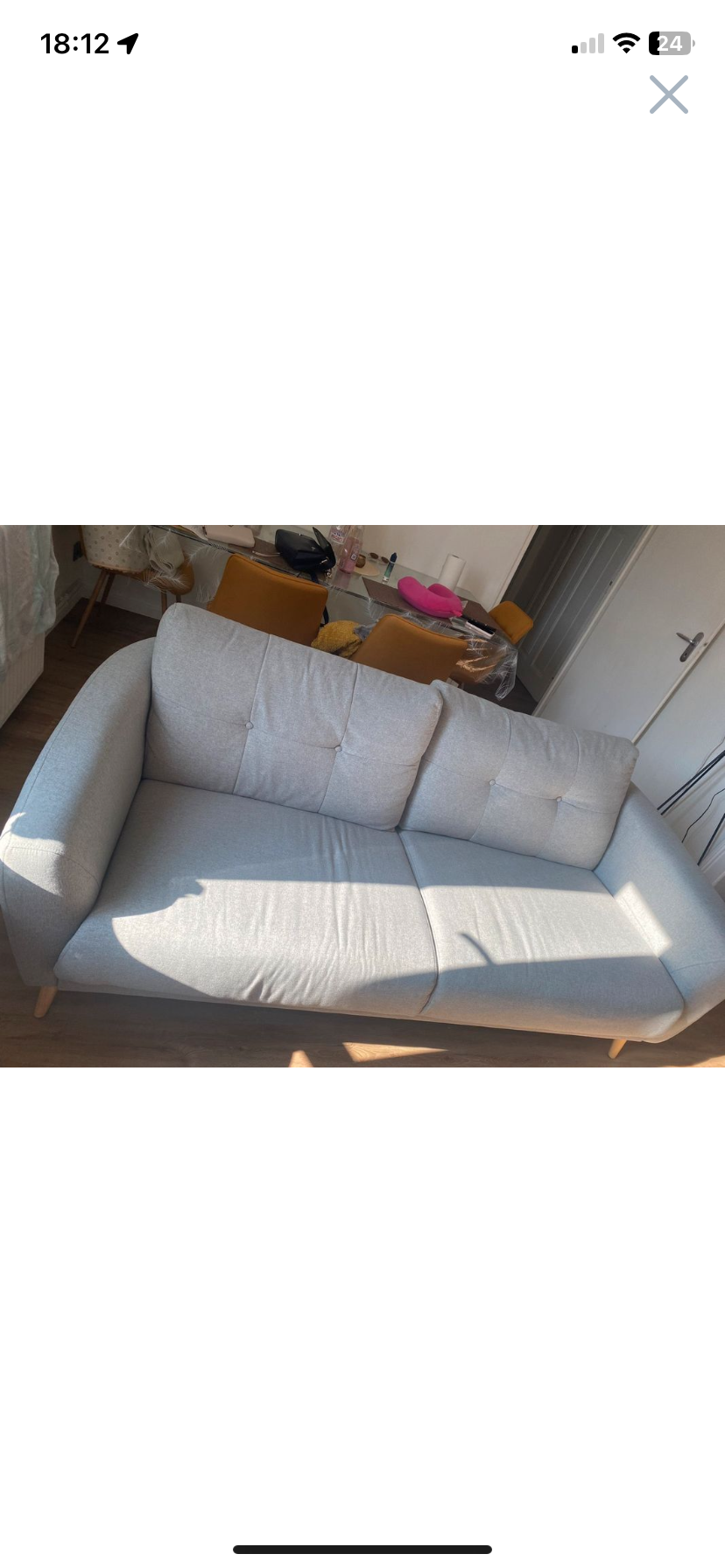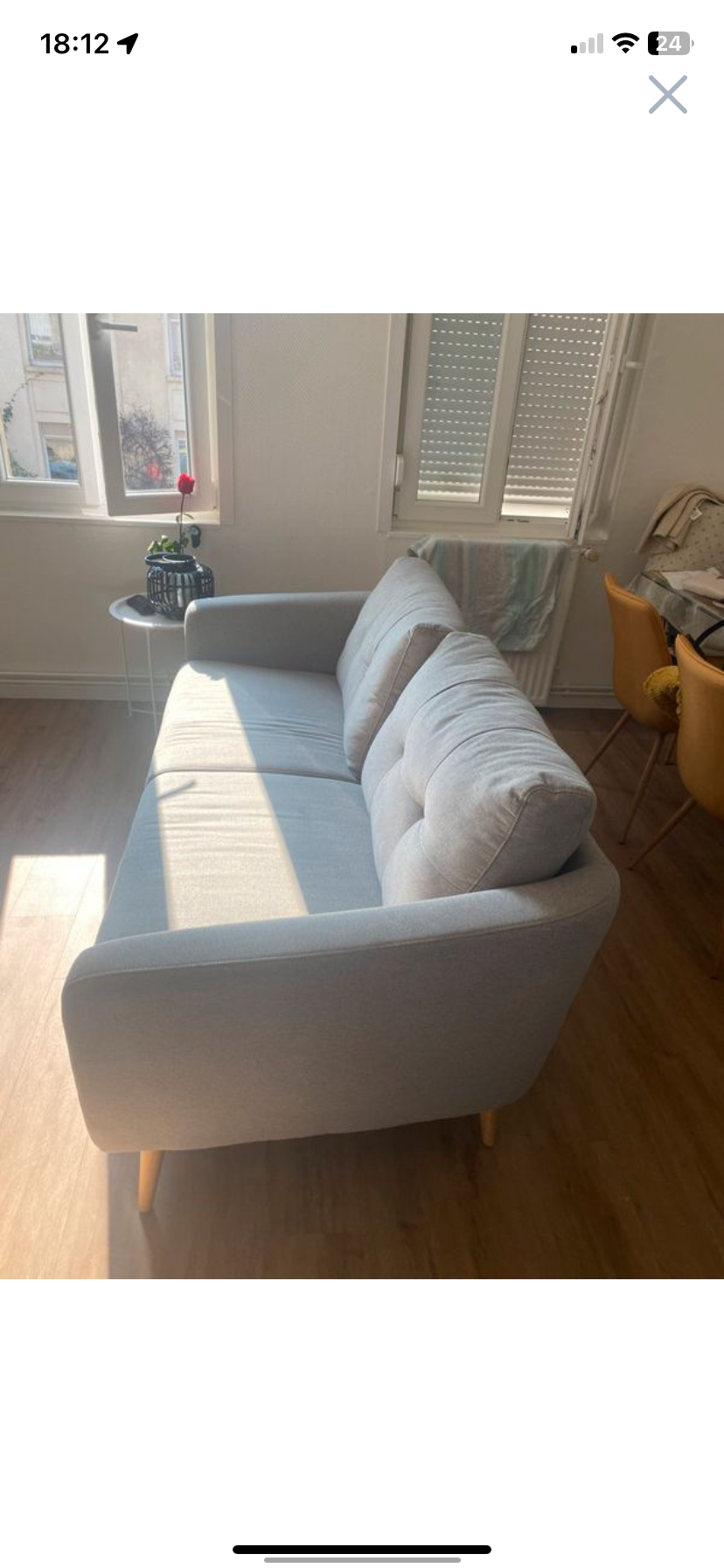 Canapé en tissu gris de type scandinave en très bon état, pas de trous ni de décoloration comme en témoignent les photos.