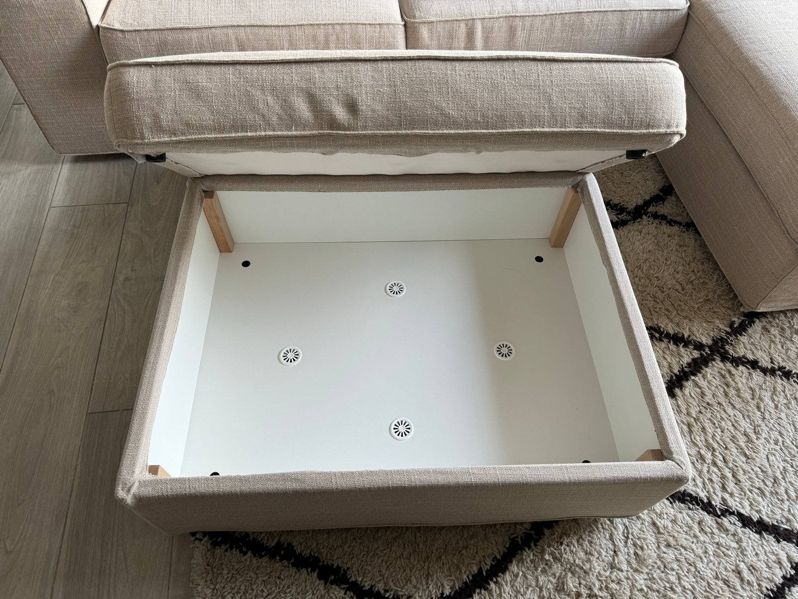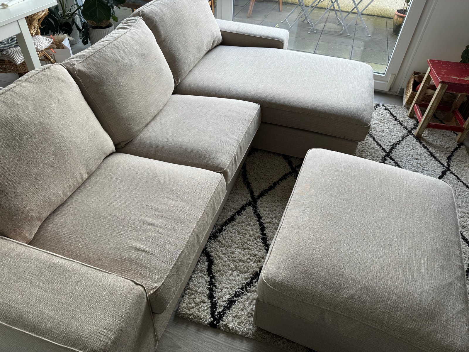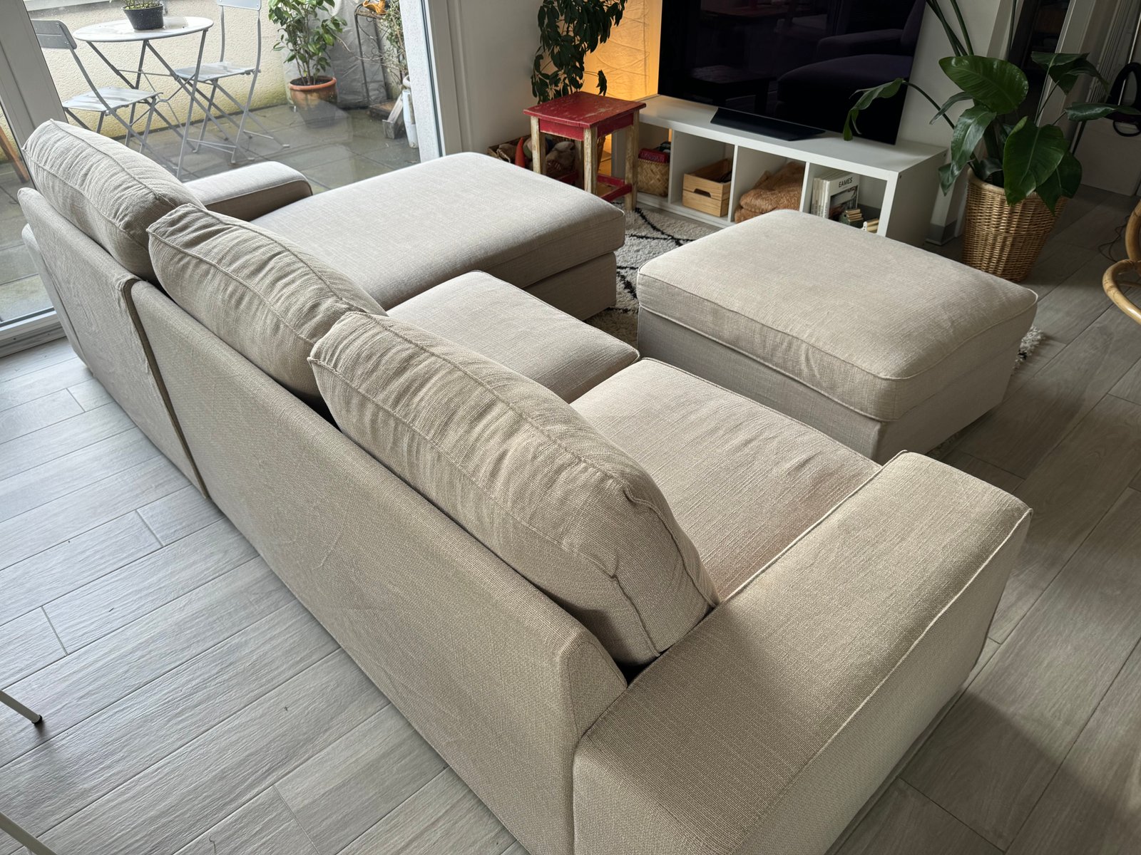 Canapé avec méridienne et pouf IKEA avec rangements modèle KIVIK. En tissus beige. Entièrement déhoussable et lavable en machine. État comme neuf. Dimensions du repose-pieds : 90x70x46 cm. Le tout coûte 1250€ en magasin.