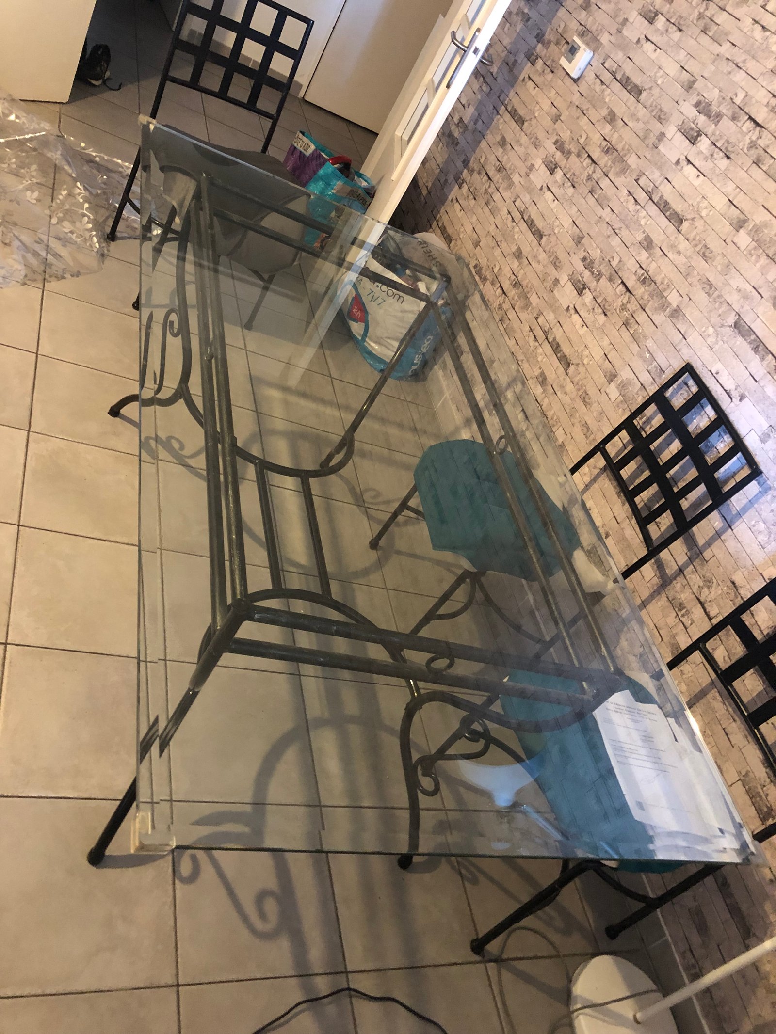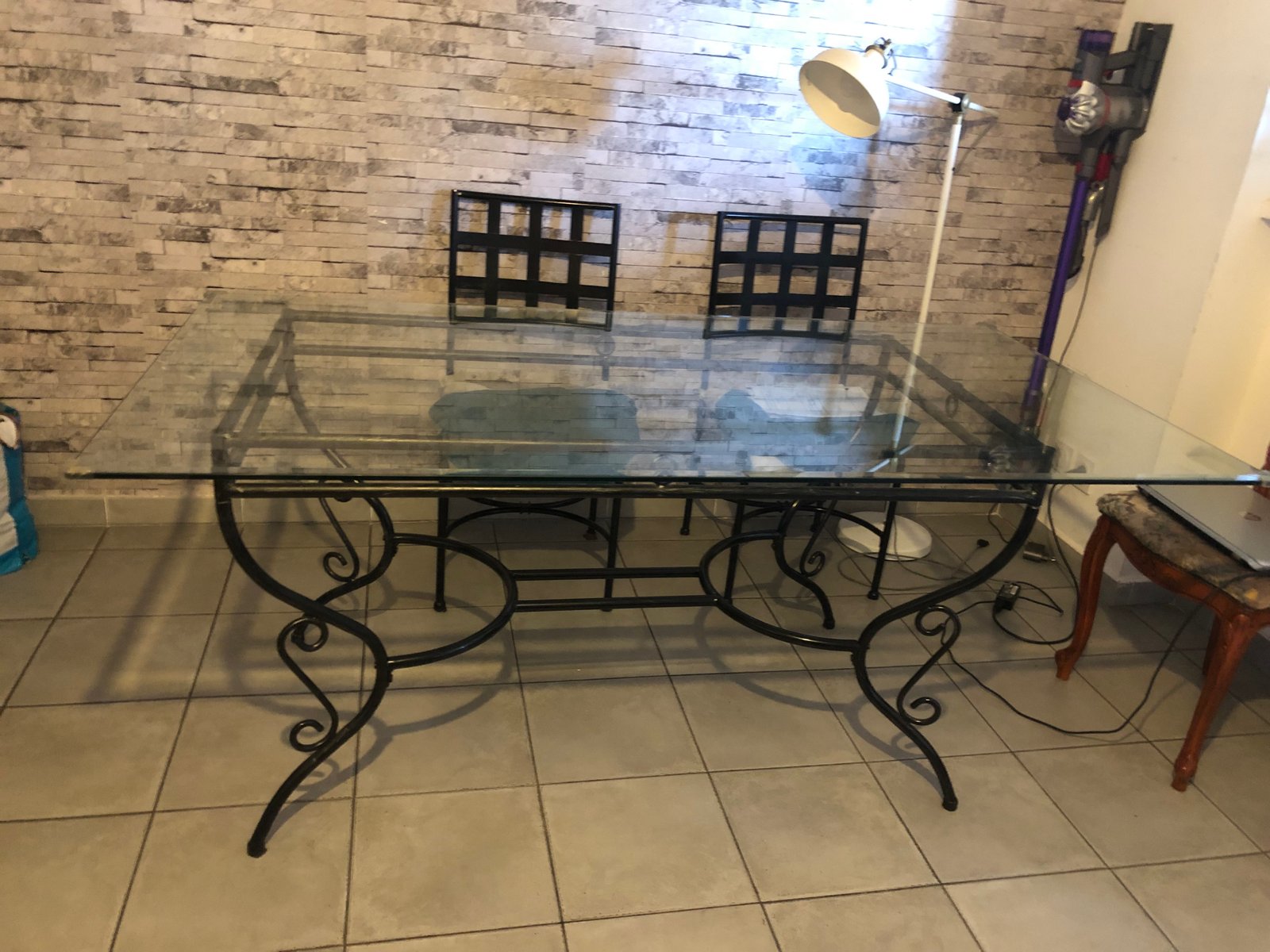 Je vend ma table + 4 chaises (1 chaise avec l'assise cassée) , car je change toute la salle à manger . Très bon état