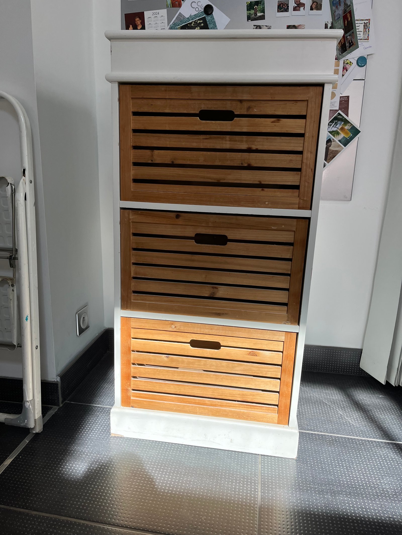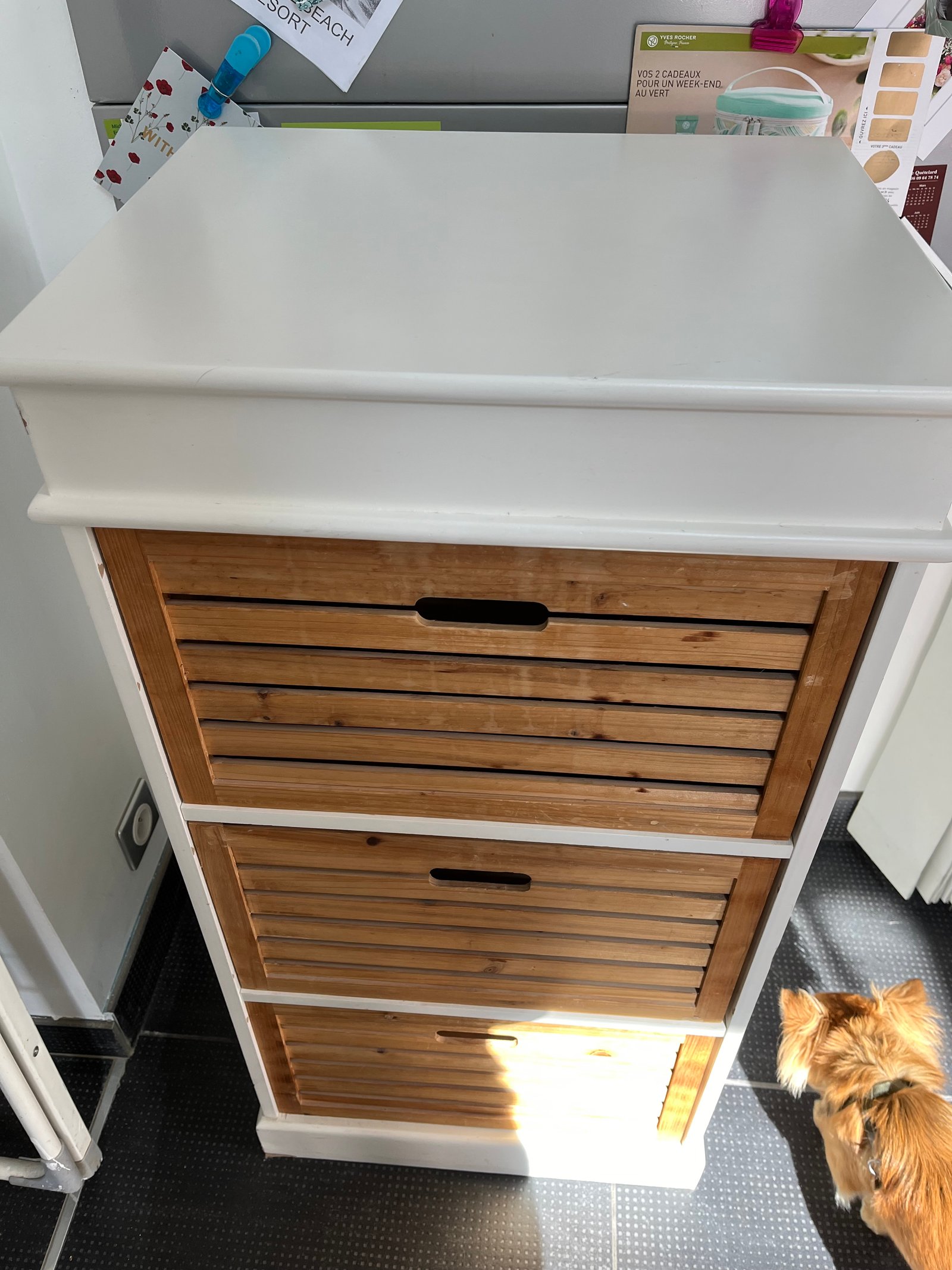 Meuble à rangements pour cuisine ou salle de bain, 3 tiroirs en bois de la marque Jisk. Bon état, quelques traces d'usures sur les bords, peu visible. Facilement camouflable avec du tipex ou de la peinture blanche si c'est préférable.