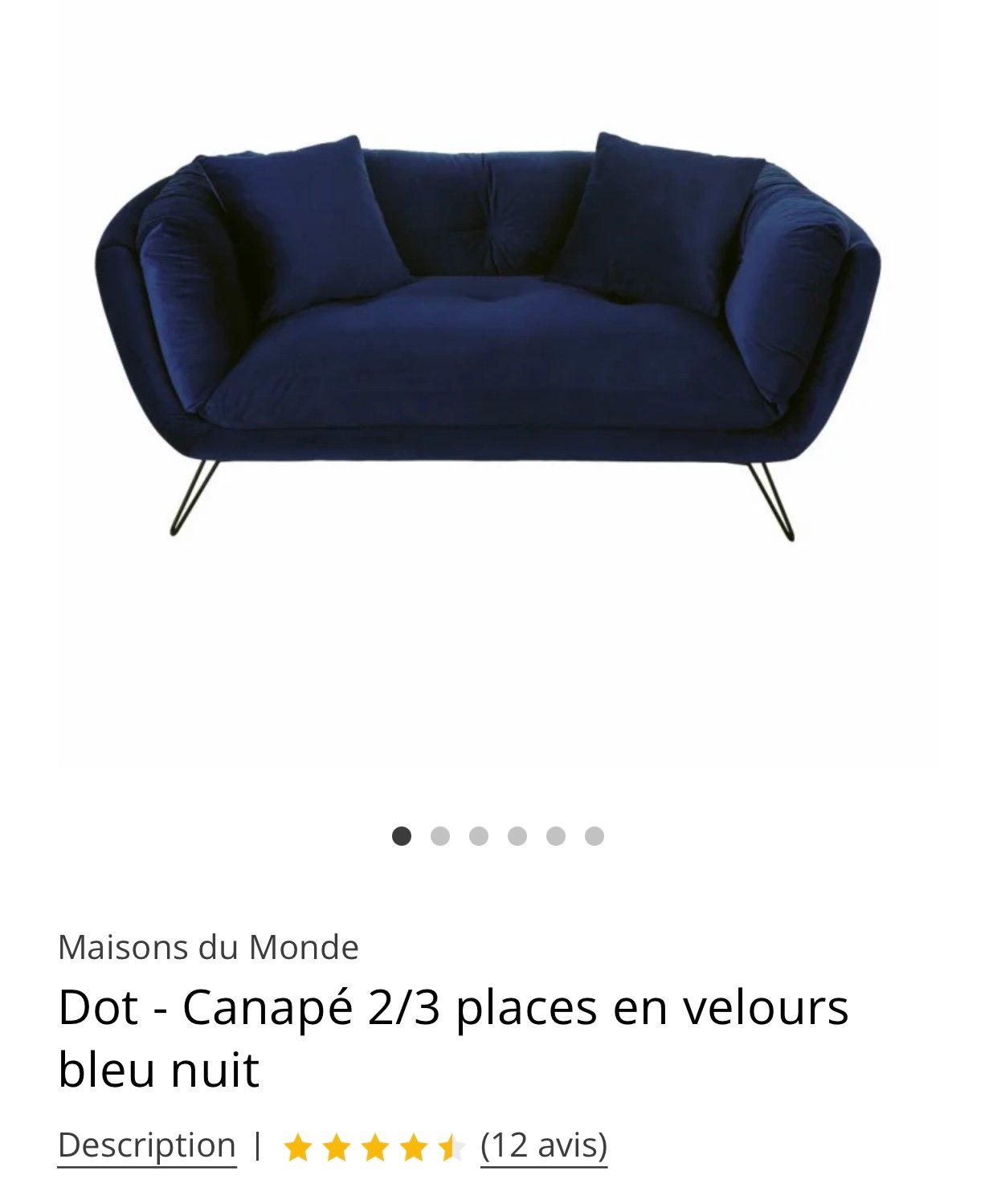 Canapé bleu nuit Maison du monde. Velours véritable. En parfait état. Acheté il y a 3 mois