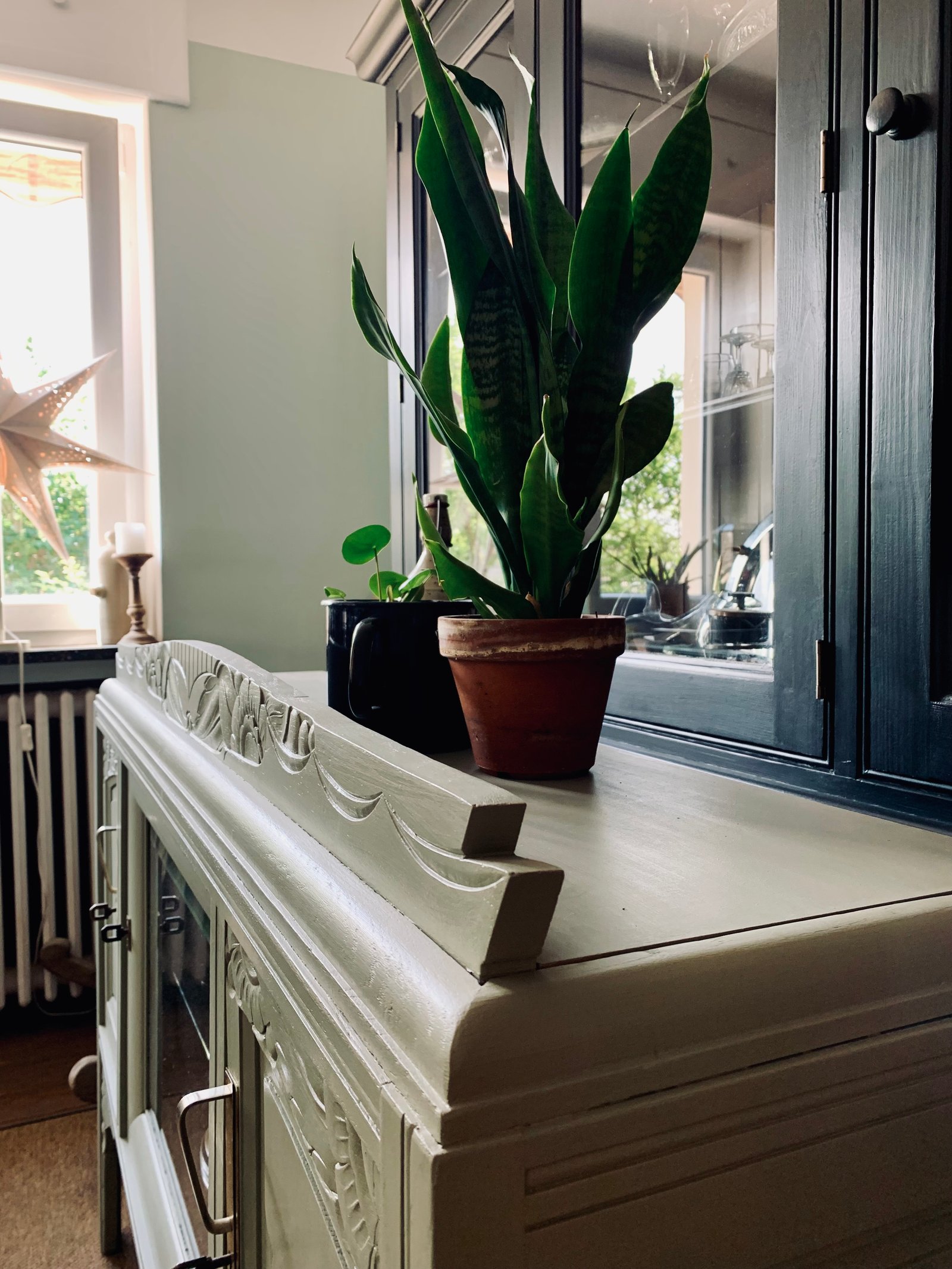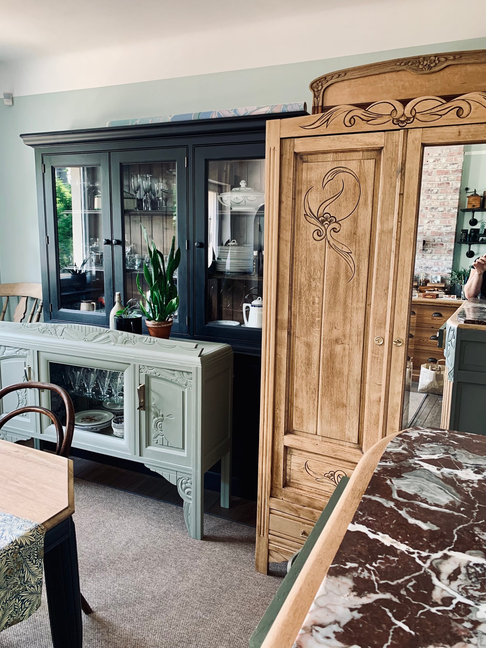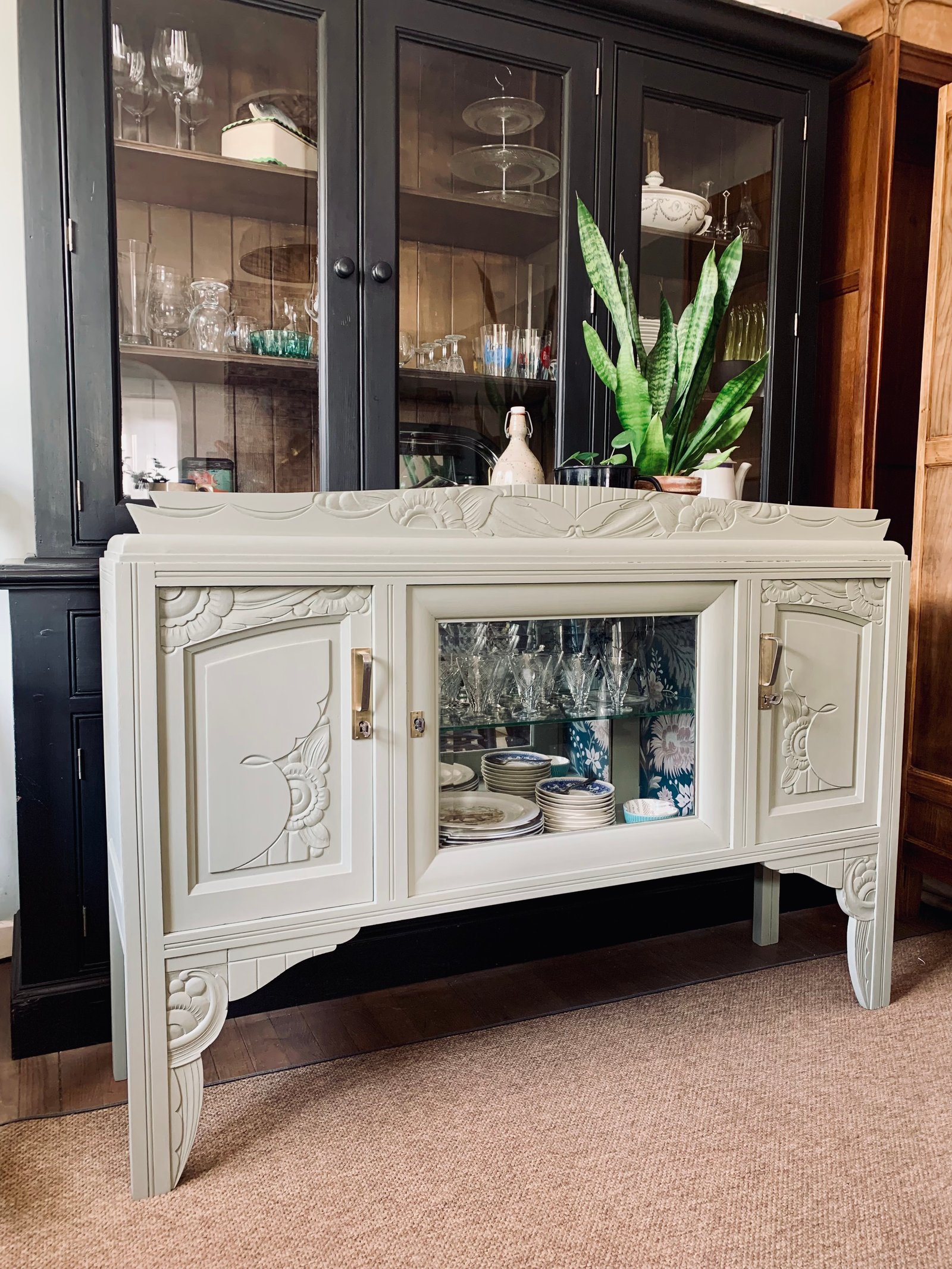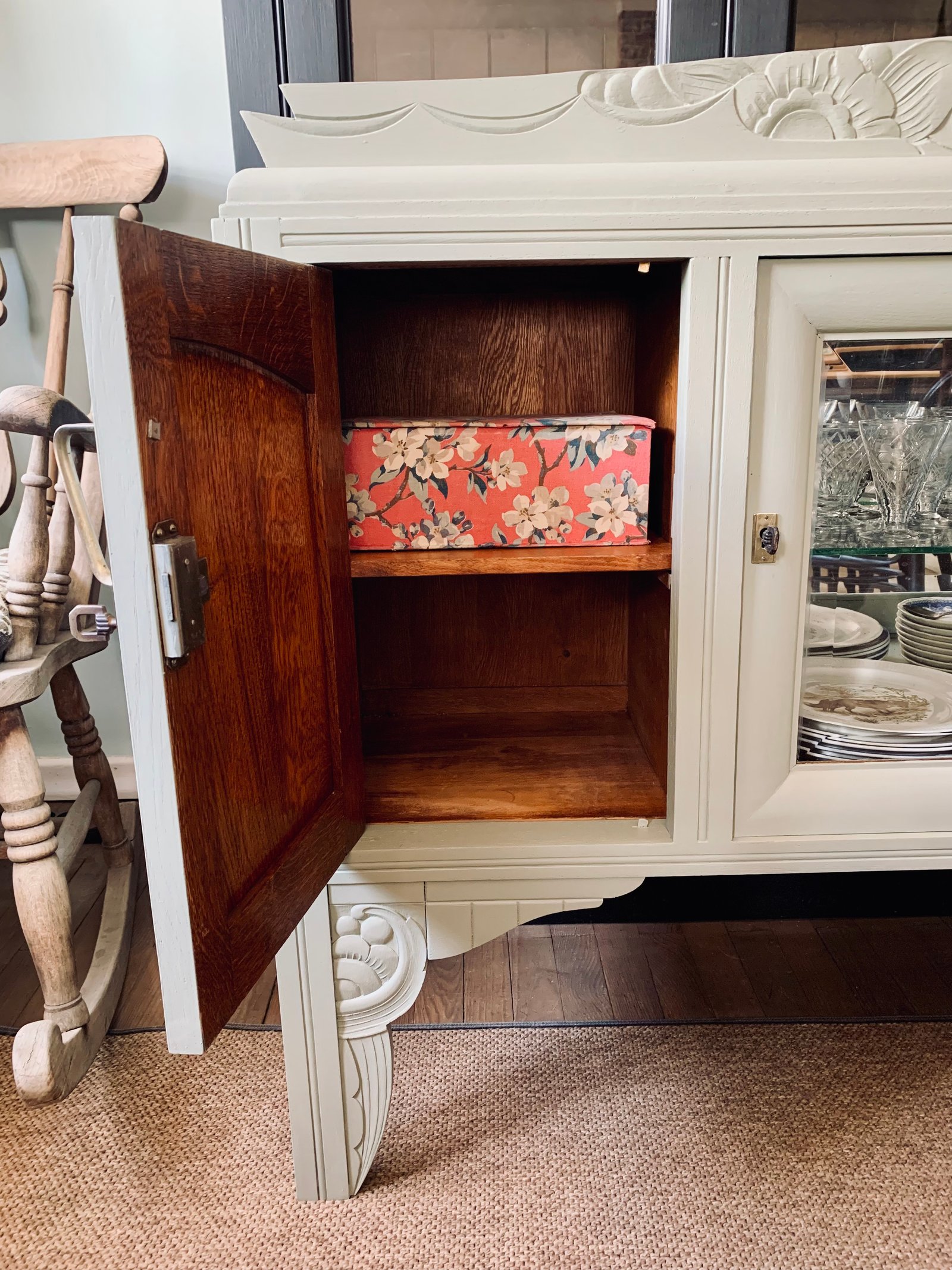 Haut de vaisselier art deco détourné en buffet bas. Idéal pour en faire une bibliothèque dans un salon ou dans une chambre d'enfant. Ou y mettre sa vaisselle comme moi ☺️ La porte centrale est dotée d'une vitre biseautée très épaisse, et d'une étagère en verre pour y exposer des petits trésors. J'ai habillé la niche du sublime papier Ava Sandberg. Les deux espaces de rangements disposent d'une étagère amovible. Les poignées laiton sont d'origine et ferment à clé. J'ai ajouté un plateau mdf au dessus pour une plus jolie finition. Couleur glaise mat Karold et vernis mat Libéron. Meuble en chêne massif. 140 / 98 / 35 cm