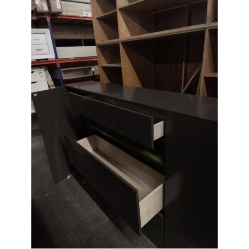Le Buffet bas smart laq est un meuble moderne avec une finition laquée. Il présente une couleur principale gris foncé avec des accents verts visibles à l'intérieur d'une ouverture horizontale sur le devant. Le design est minimaliste et épuré, avec des lignes droites et une surface lisse.