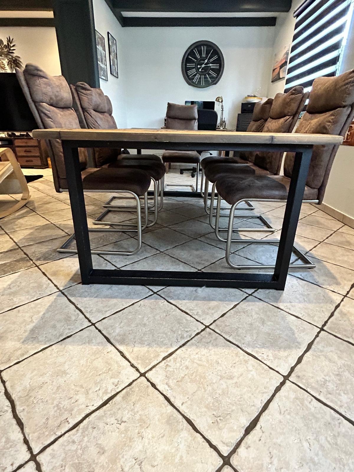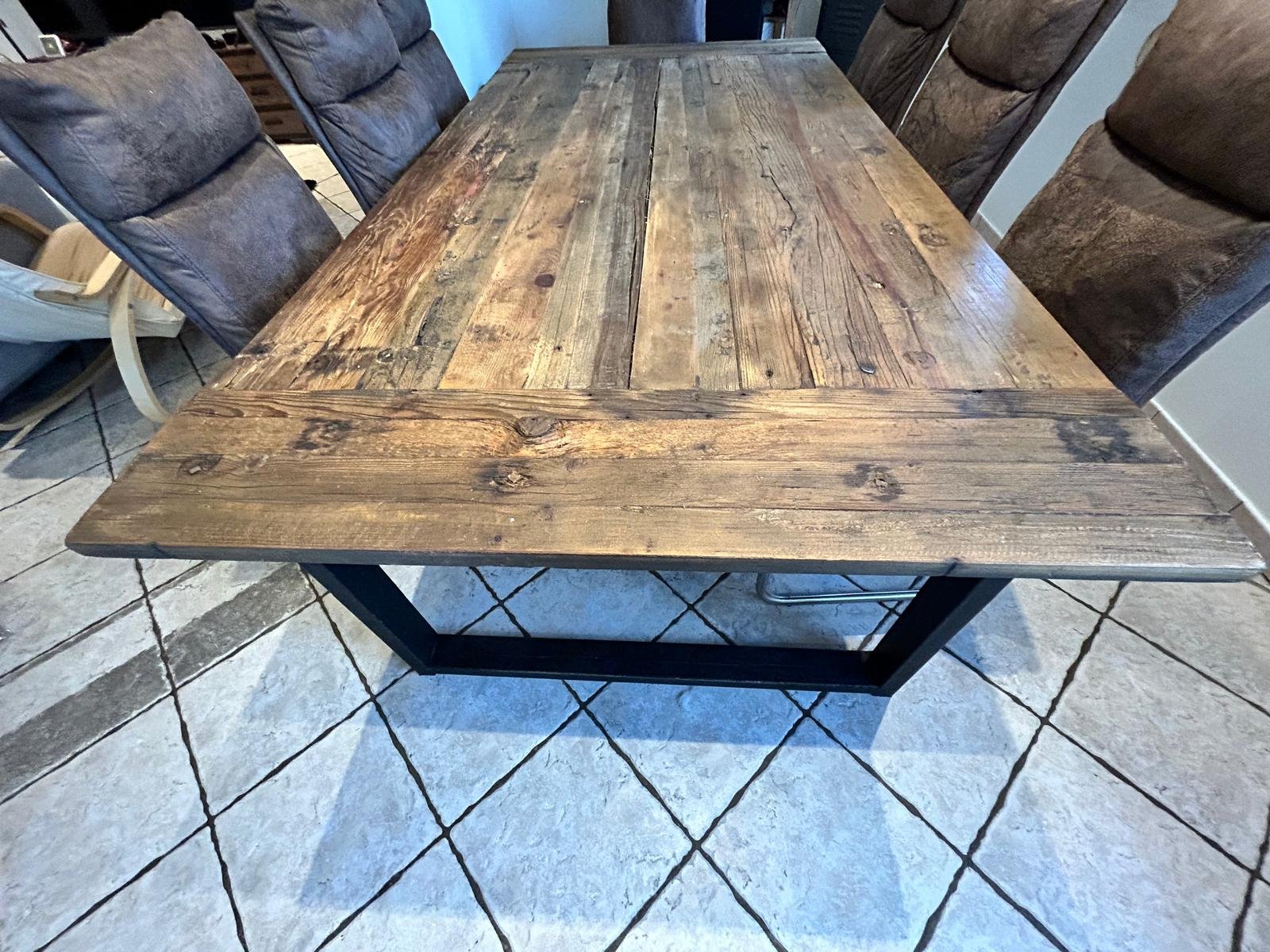 Table de salle à manger 8-10 personnes faite à partir d'une porte de grange. 2 pieds en acier noir.