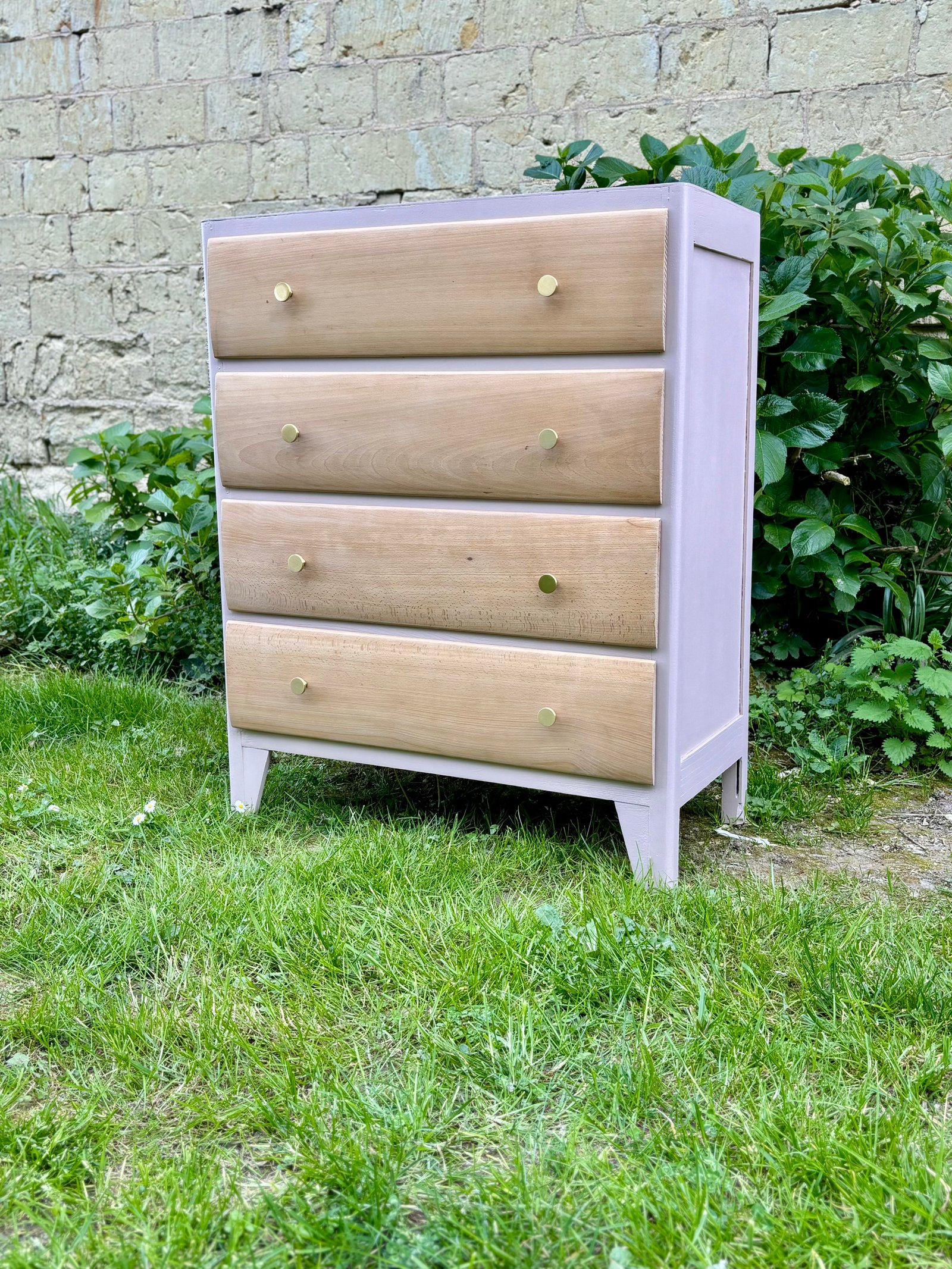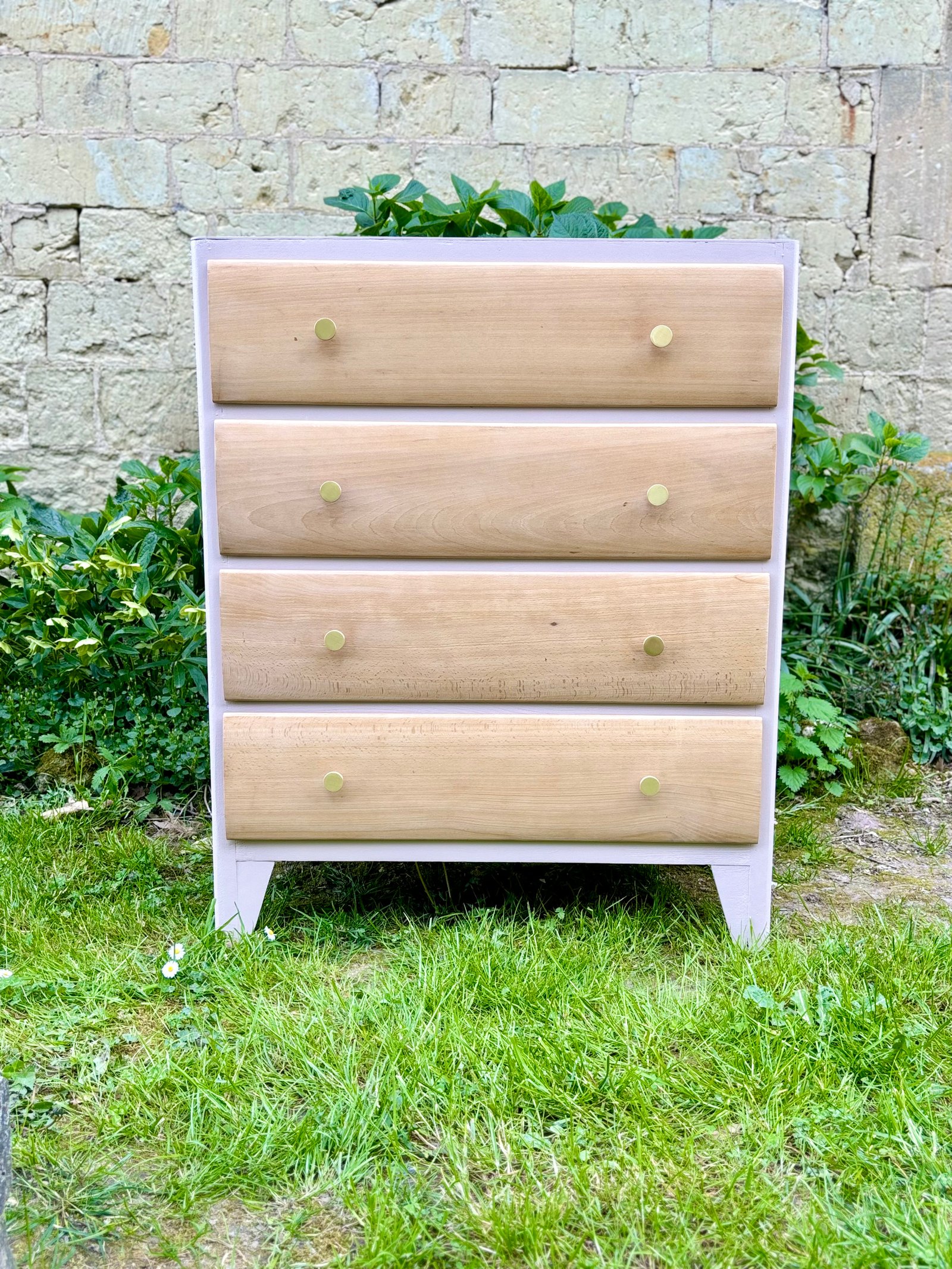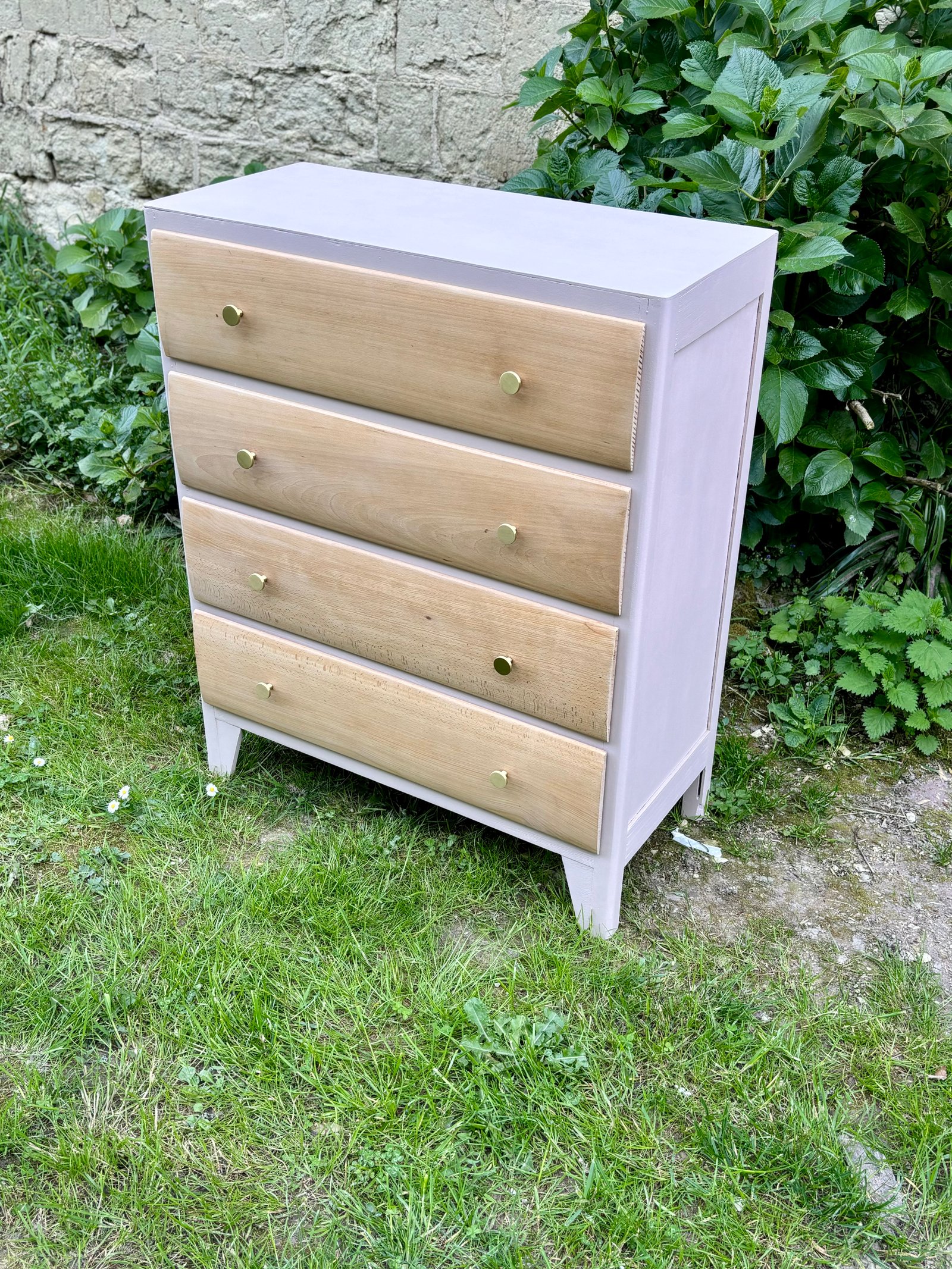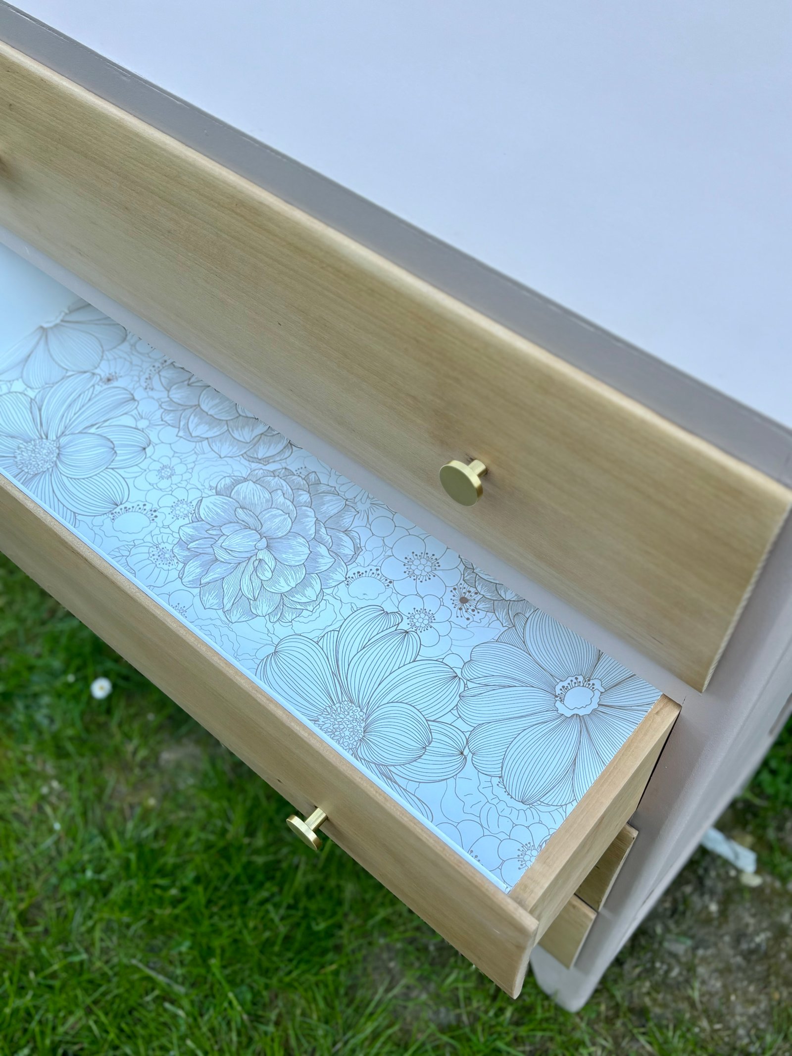 Commode entièrement décapée. La peinture et le bois sont protégés avec un vernis mat incolore. L'intérieur est tapissé avec du papier peint.