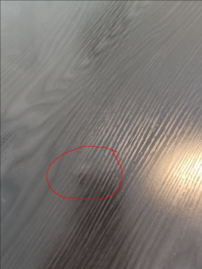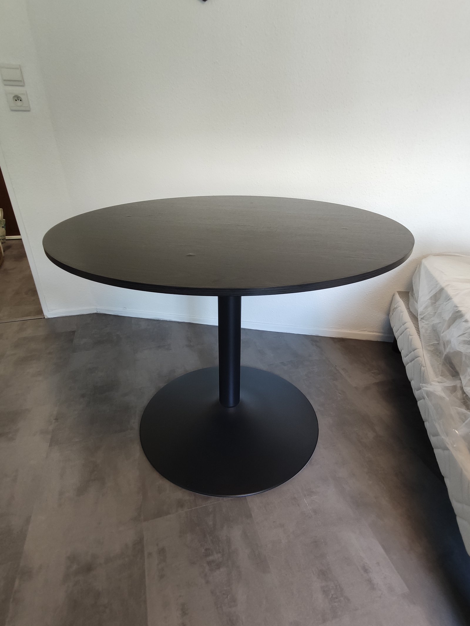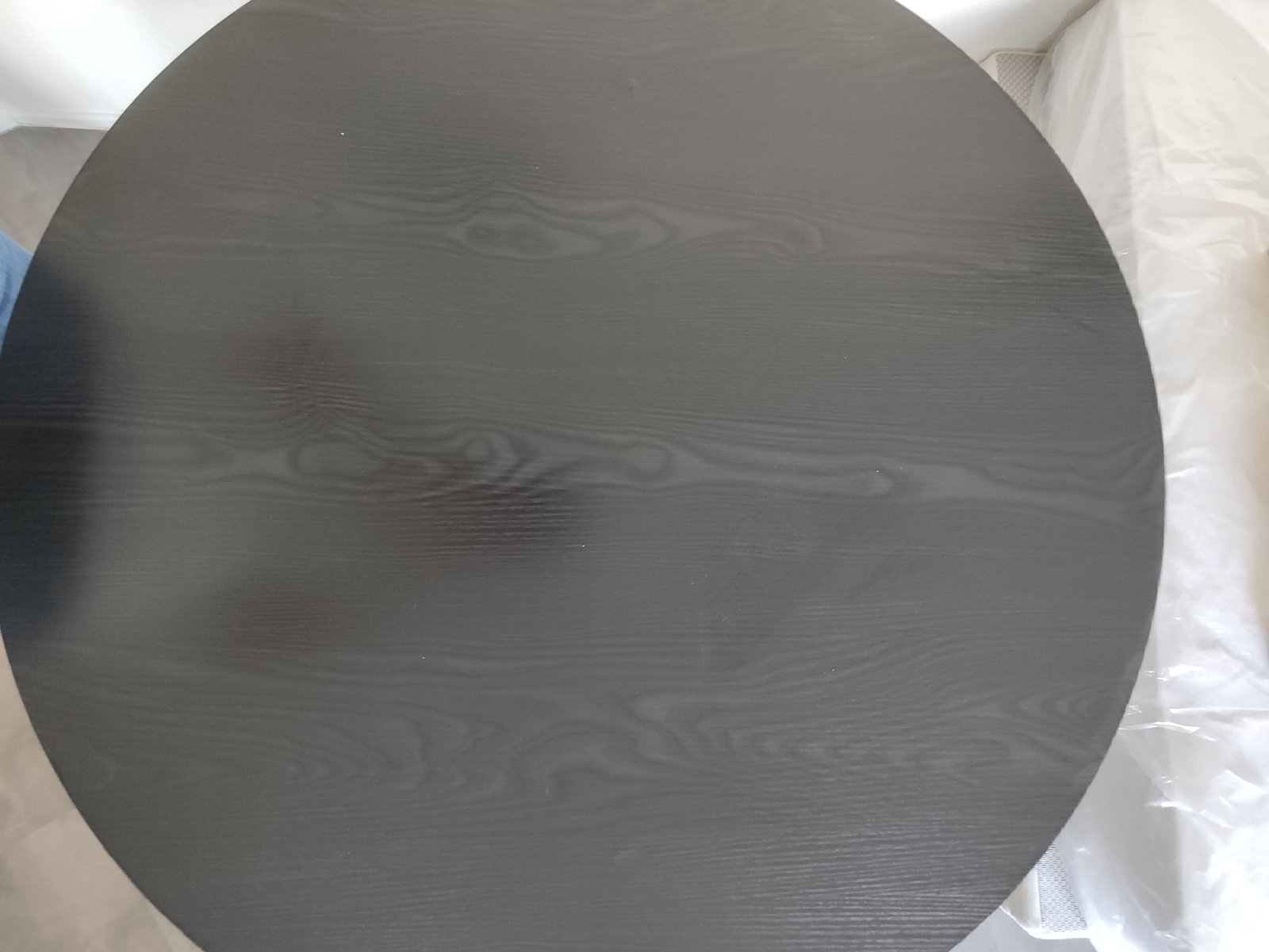 Table ronde MALICE noire jamais utilisée. Cependant le revêtement a été un peu abîmé lors du montage (à 4 endroits). Ces imperfections ne sont pas très visibles et il faut vraiment les chercher pour les voir (voir photos).