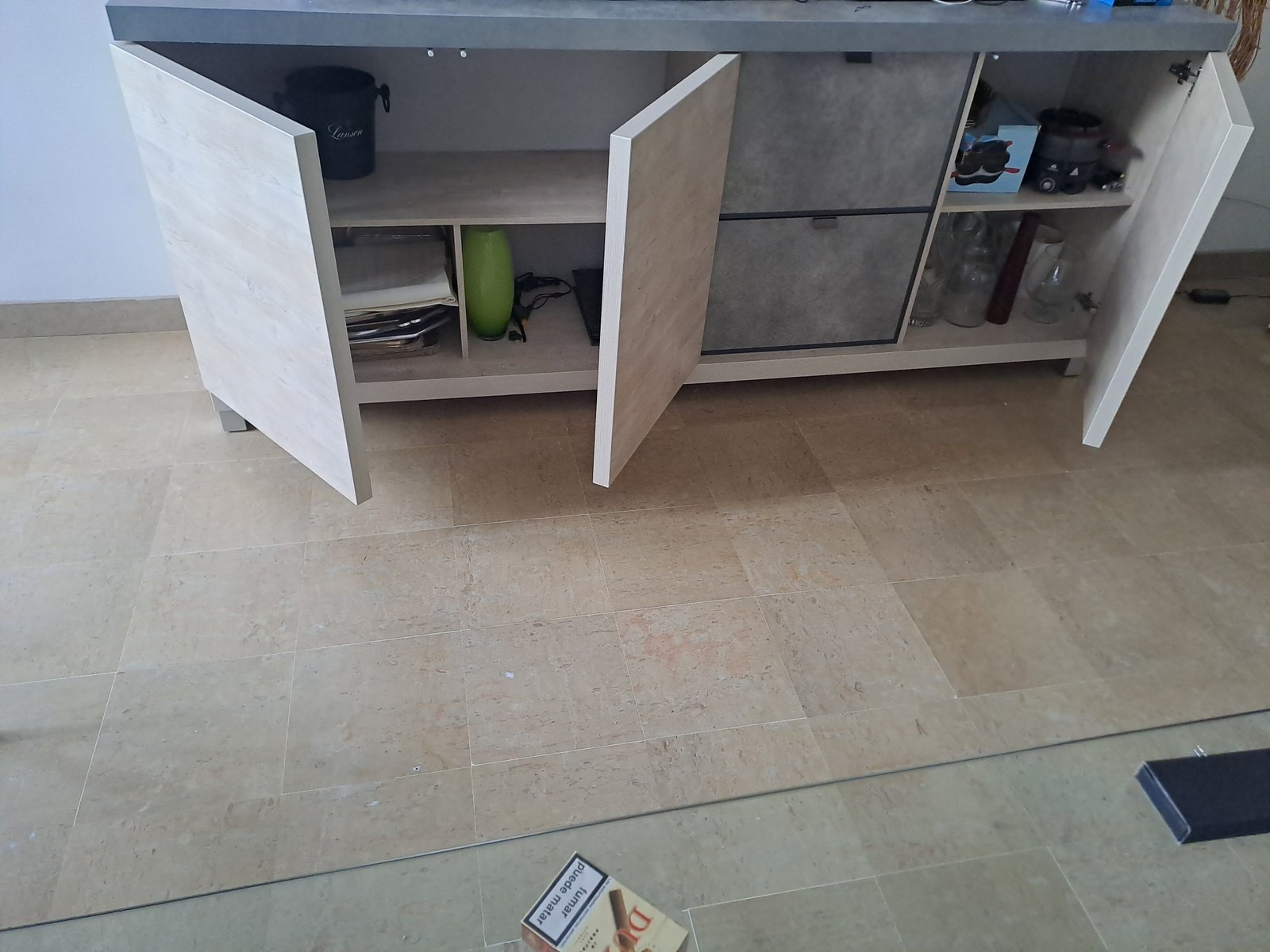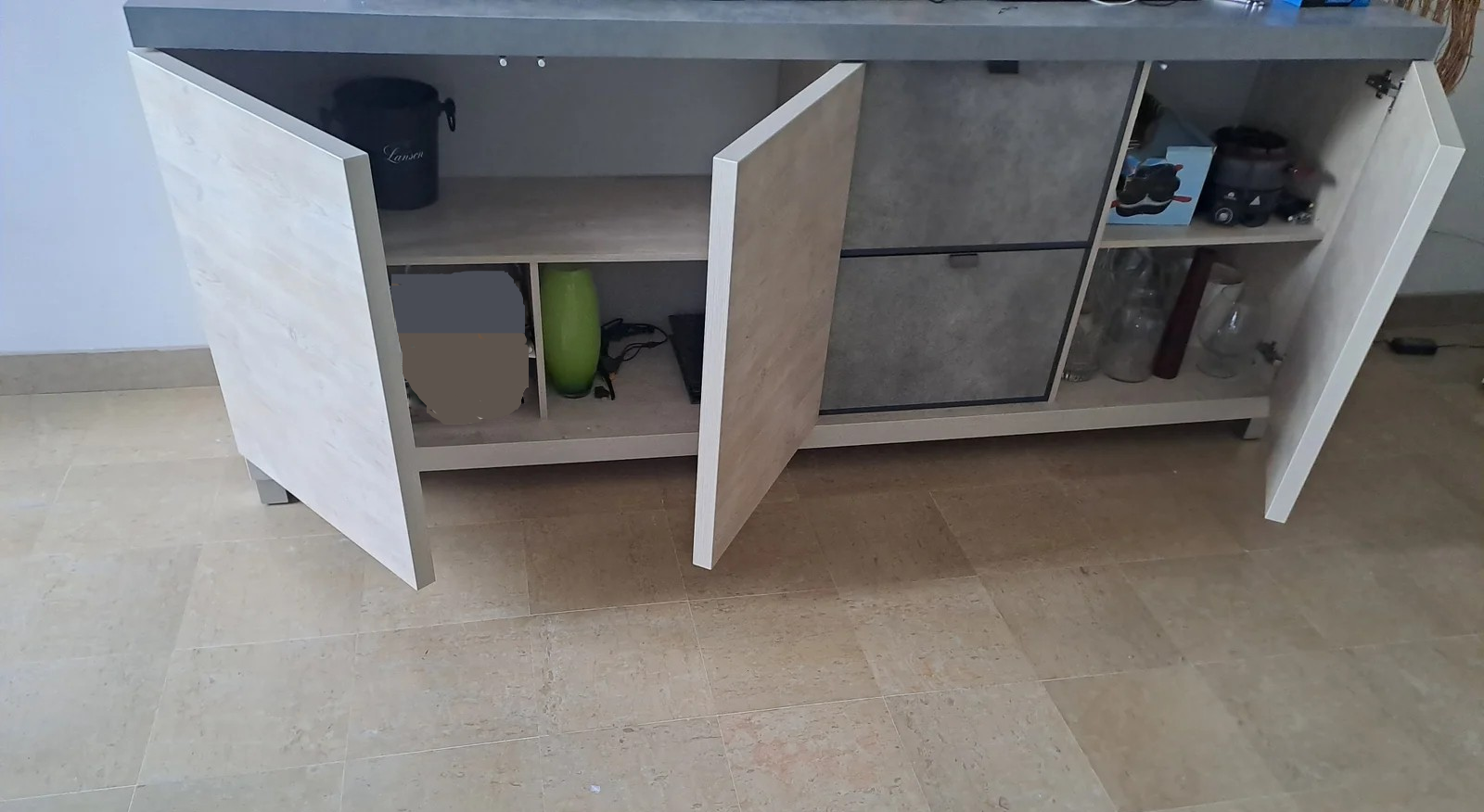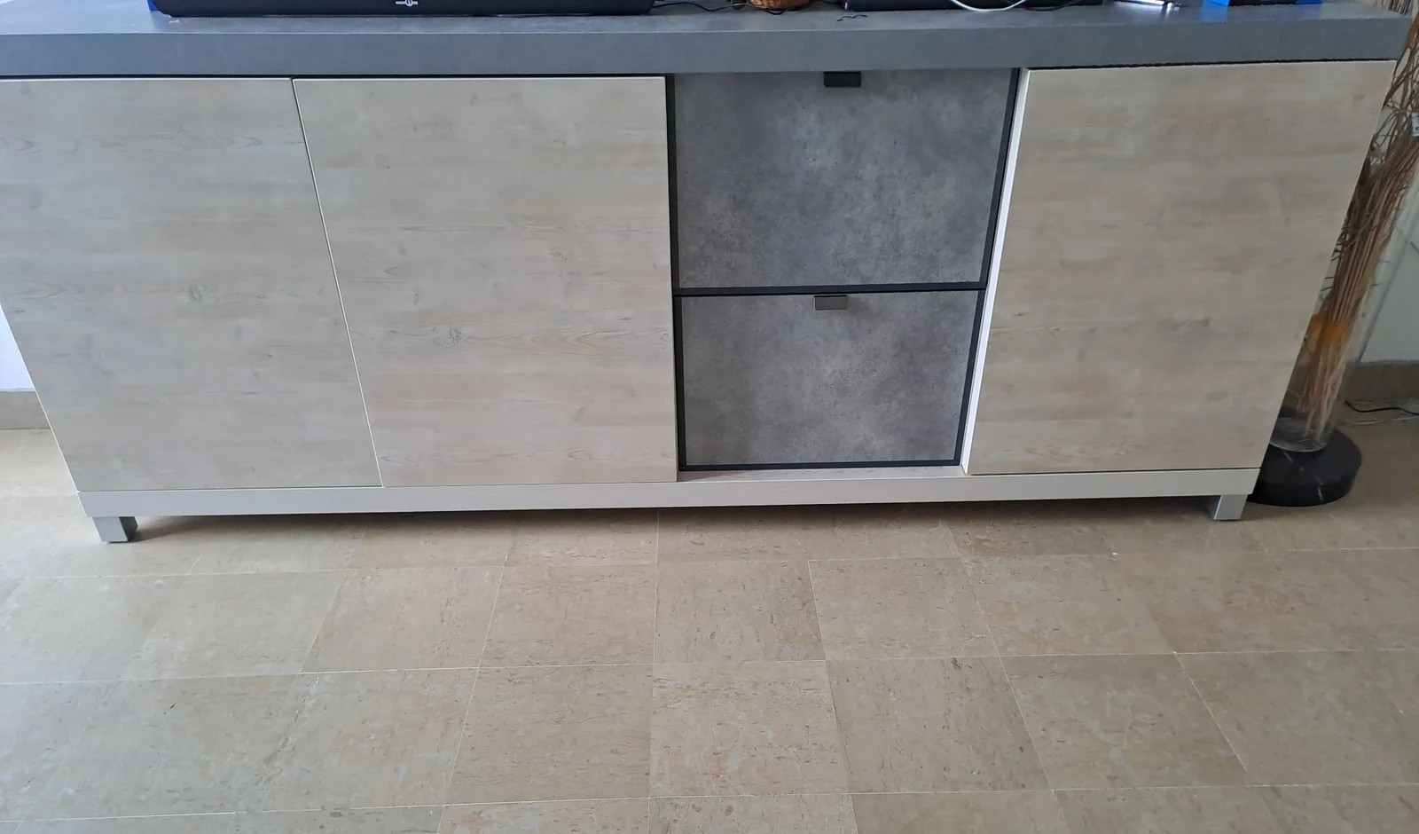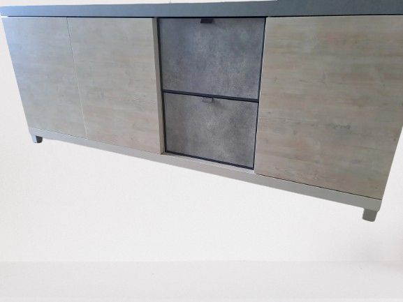 Bahut bas moderne au matériau et couleurs de chêne, de céruse et de béton. Le bahut comporte 2 tiroirs et 2 placards. L'un a 2 portes et 2 étages dont un séparé en 2 parties, l'autre a une porte et 2 étages.