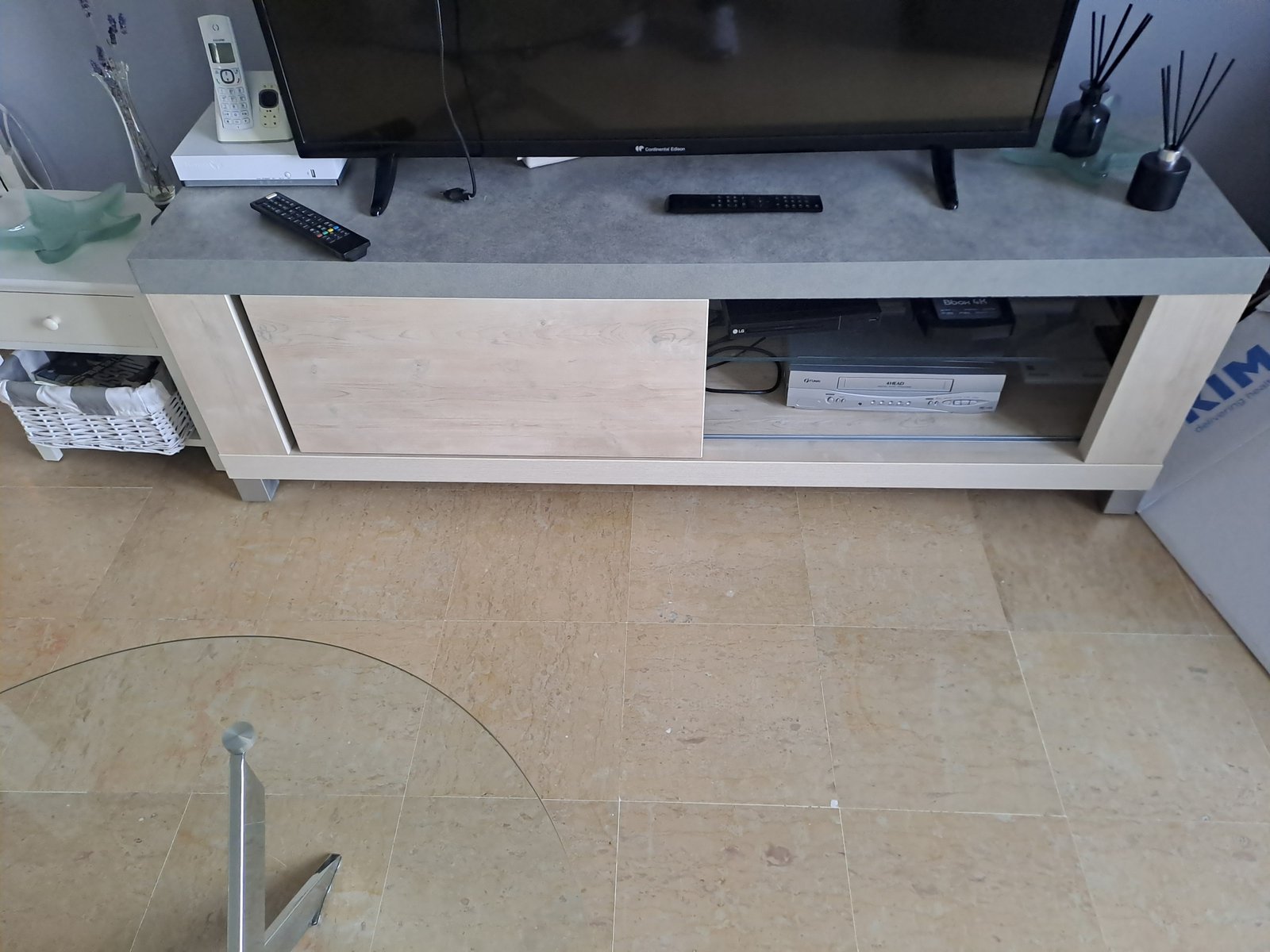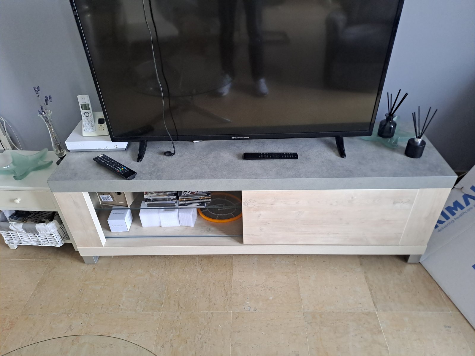 Meuble TV composé d'une porte coulissante. Le plateau est couleur béton et la base du meuble couleur céruse / bois clair.