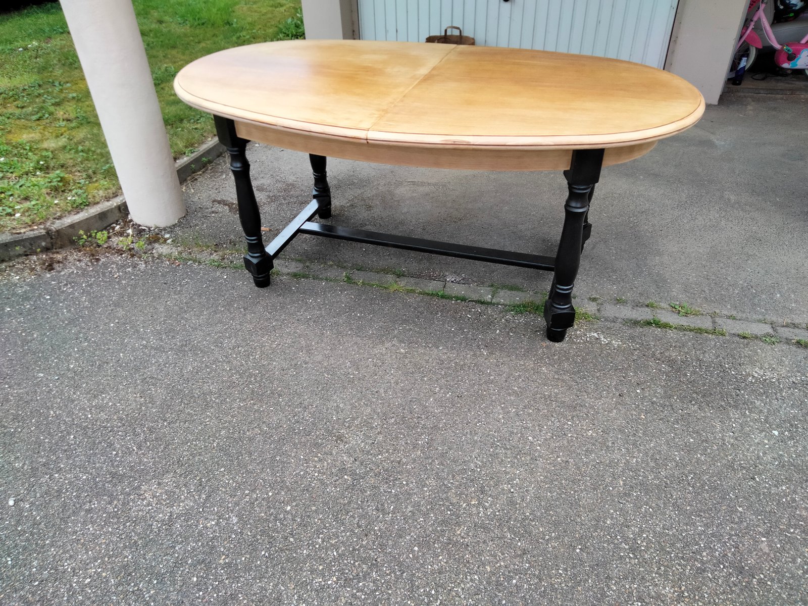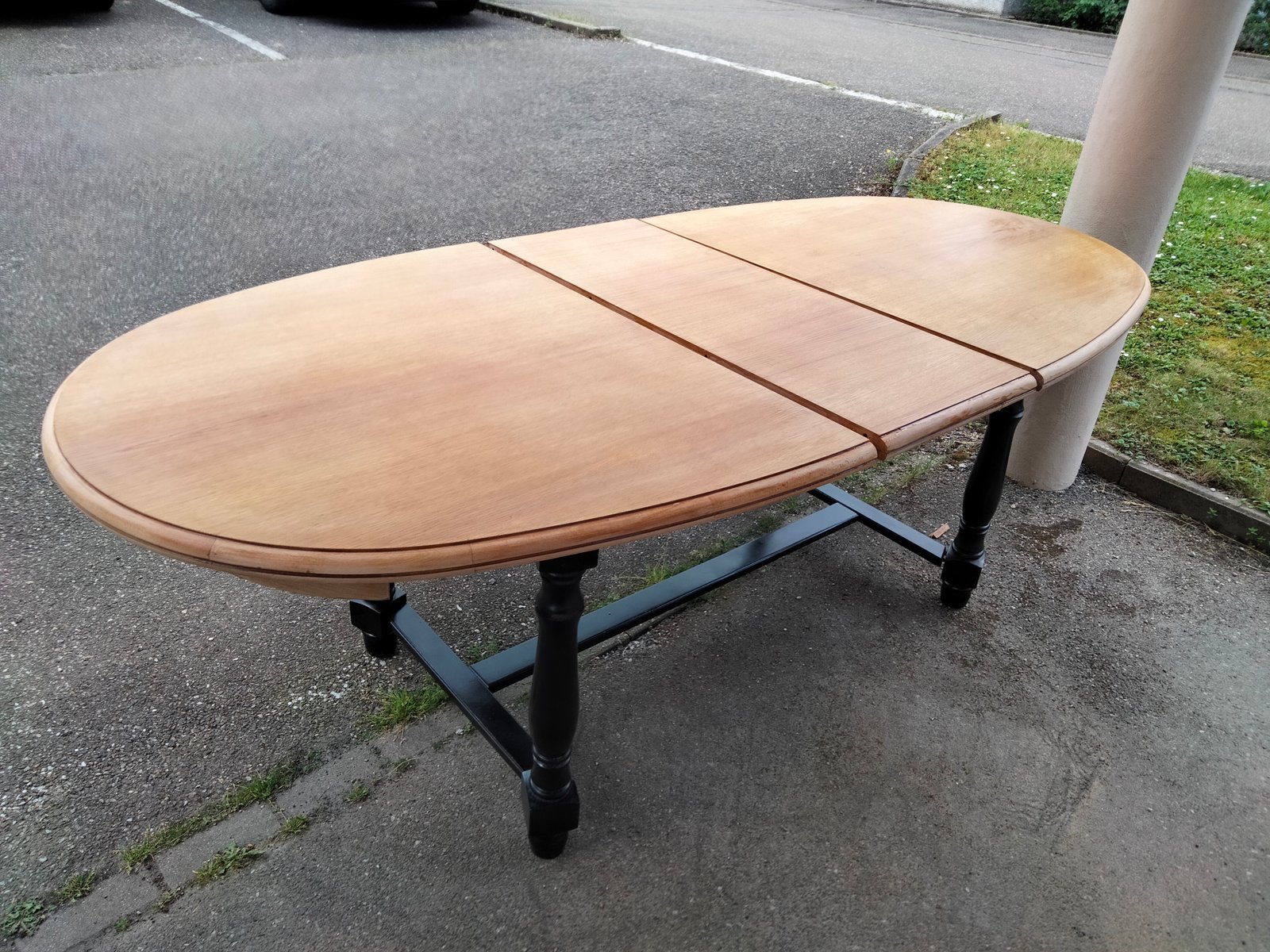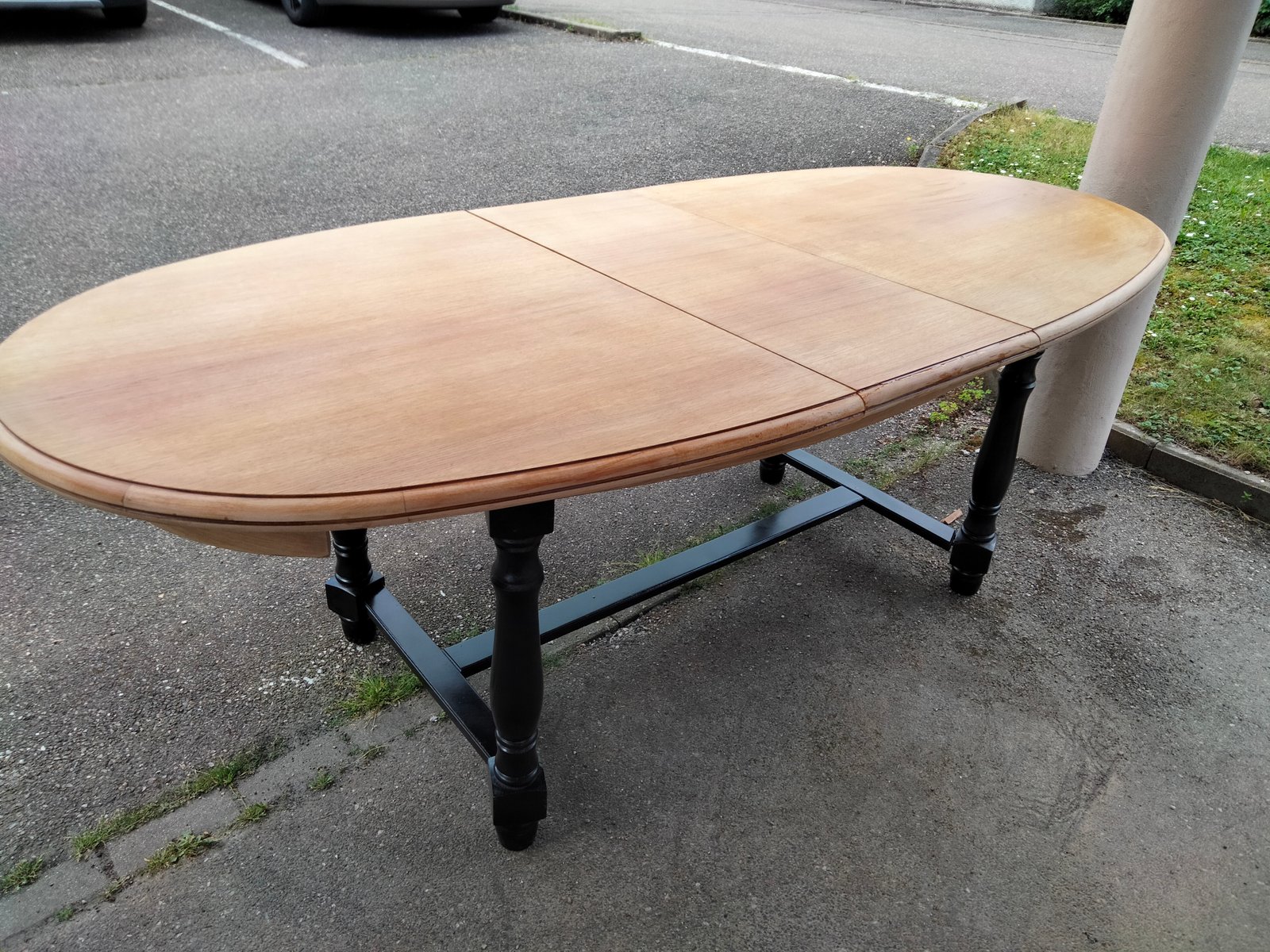 Table de salle à manger ovale en chêne massif, structure noire métal. Elle est protégée par un vernis marin haute tolérance et possède une rallonge de 40cm.
