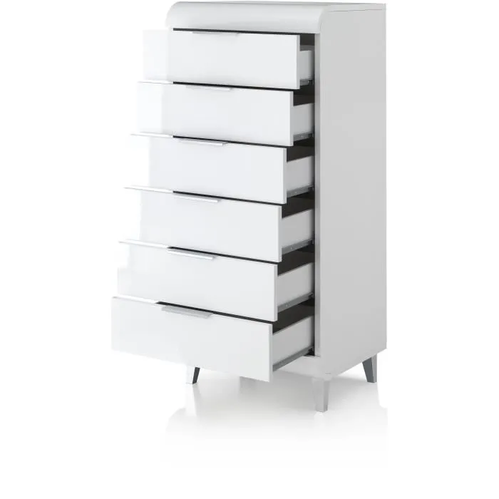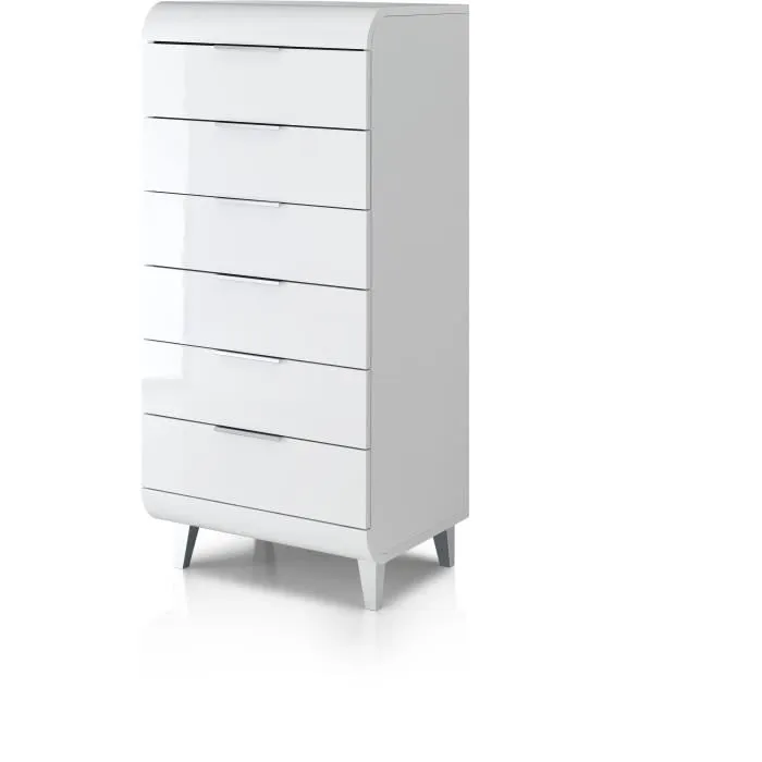 Chiffonnier contemporain à 6 tiroirs, en bois blanc laqué, alliant élégance et praticité. Compact et fonctionnel, il s’intègre facilement dans tous les intérieurs modernes.