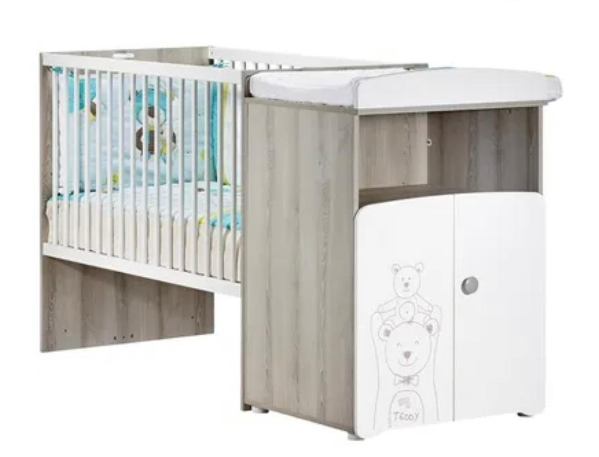 Lit bébé évolutif en très bon état, surélevé par rapport au sol. Le bout du lit est composé de 2 placards et d'une étagère. Possibilité d'installer un matelas à langer.