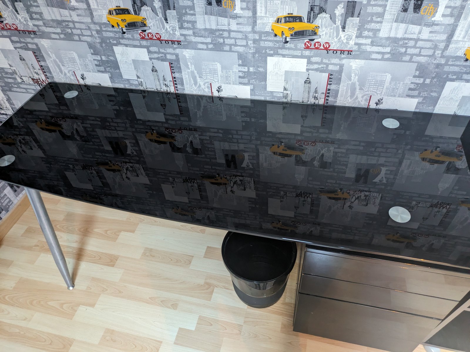 Bureau moderne noir avec ses tiroirs laqués et un plateau en verre. Quelques défauts sont visibles sur les tiroirs, comme le montre la photo.
