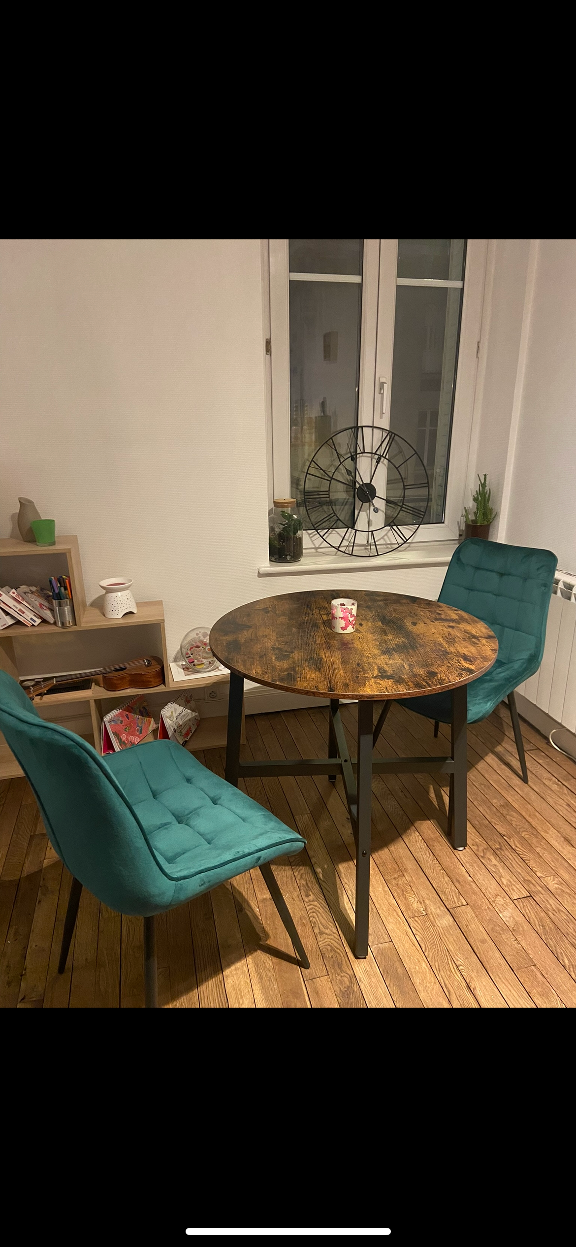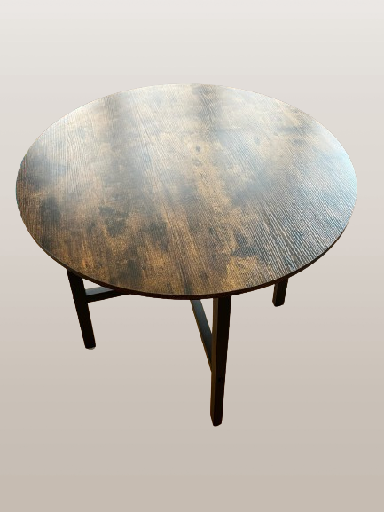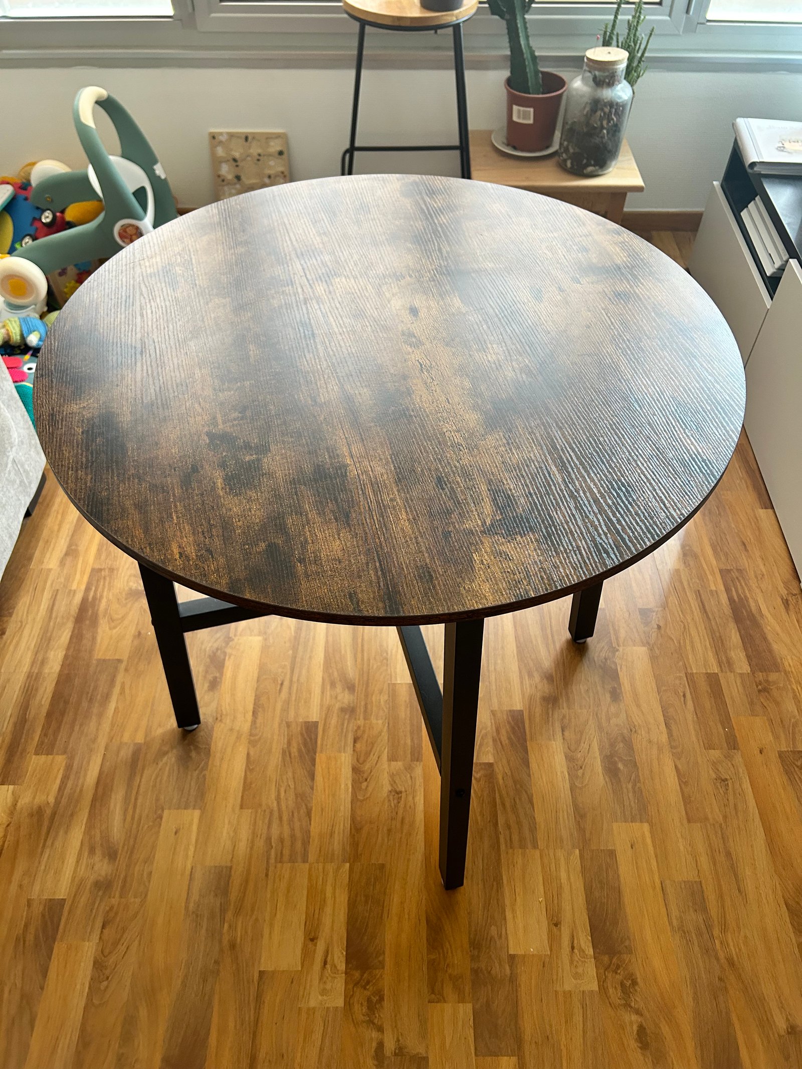 Table ronde en très bon état, comportant un plateau en bois et des pieds en métal noir mat. Convient très bien aux intérieurs modernes, industriels et contemporains.