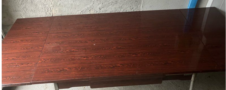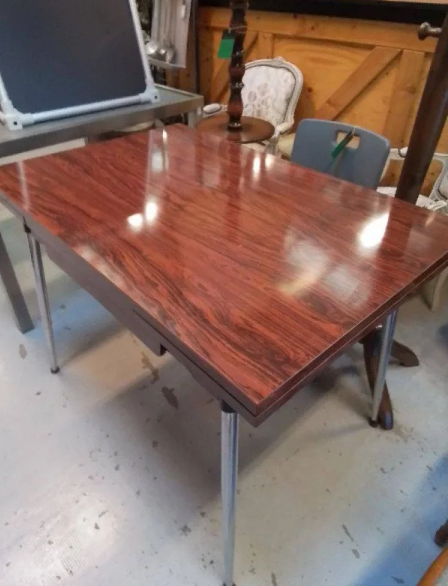 Table vintage en formica avec 2 rallonges et 1 tiroir. Pratique et rétro, parfaite pour une cuisine stylée et fonctionnelle !