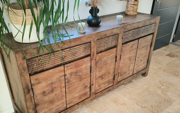 Ce grand buffet en bois massif patiné allie charme rustique et robustesse. Doté de 5 portes et 3 tiroirs, il offre un espace de rangement généreux pour votre vaisselle, linge de maison ou objets du quotidien. Son style authentique et sa finition patinée en font une pièce de caractère, idéale pour une déco campagne chic, classique ou bohème. Très bon état.