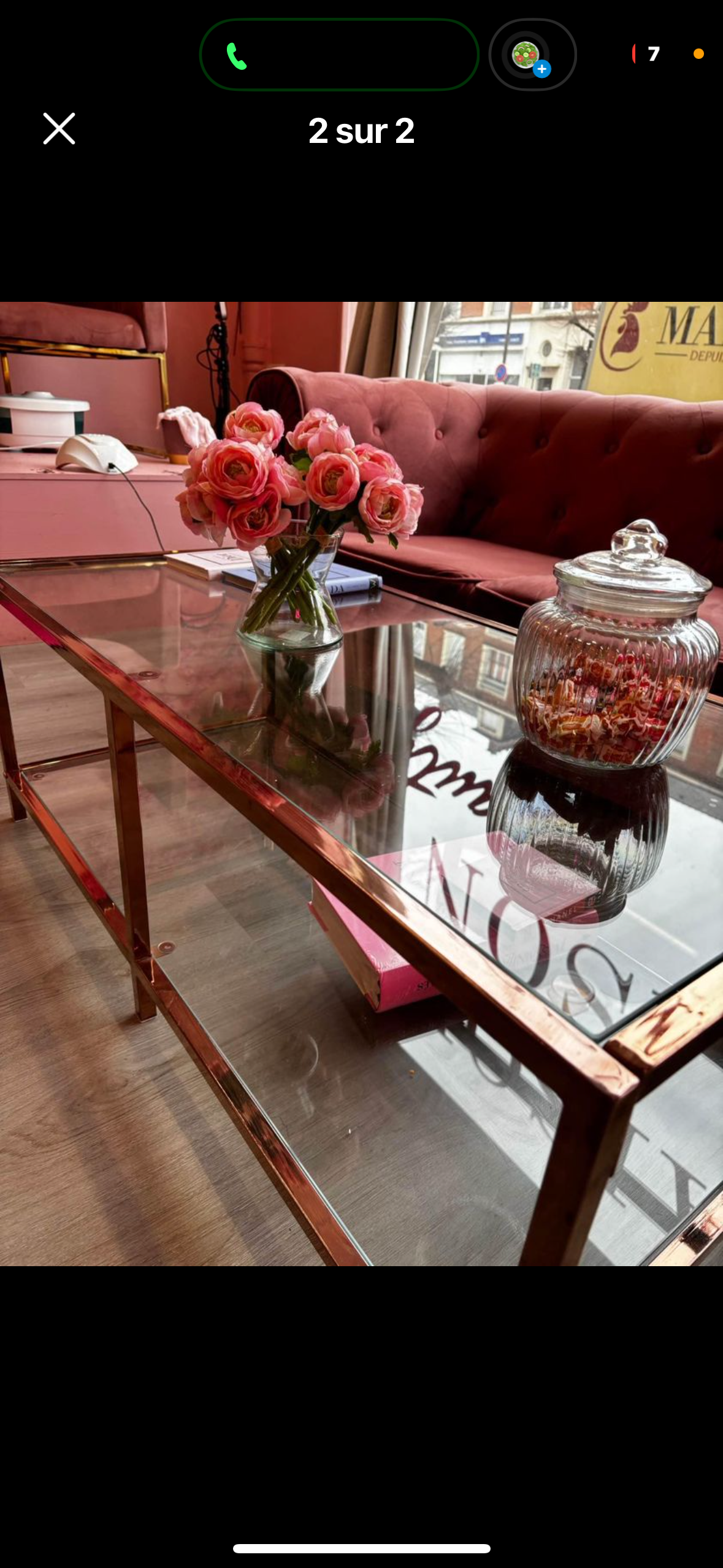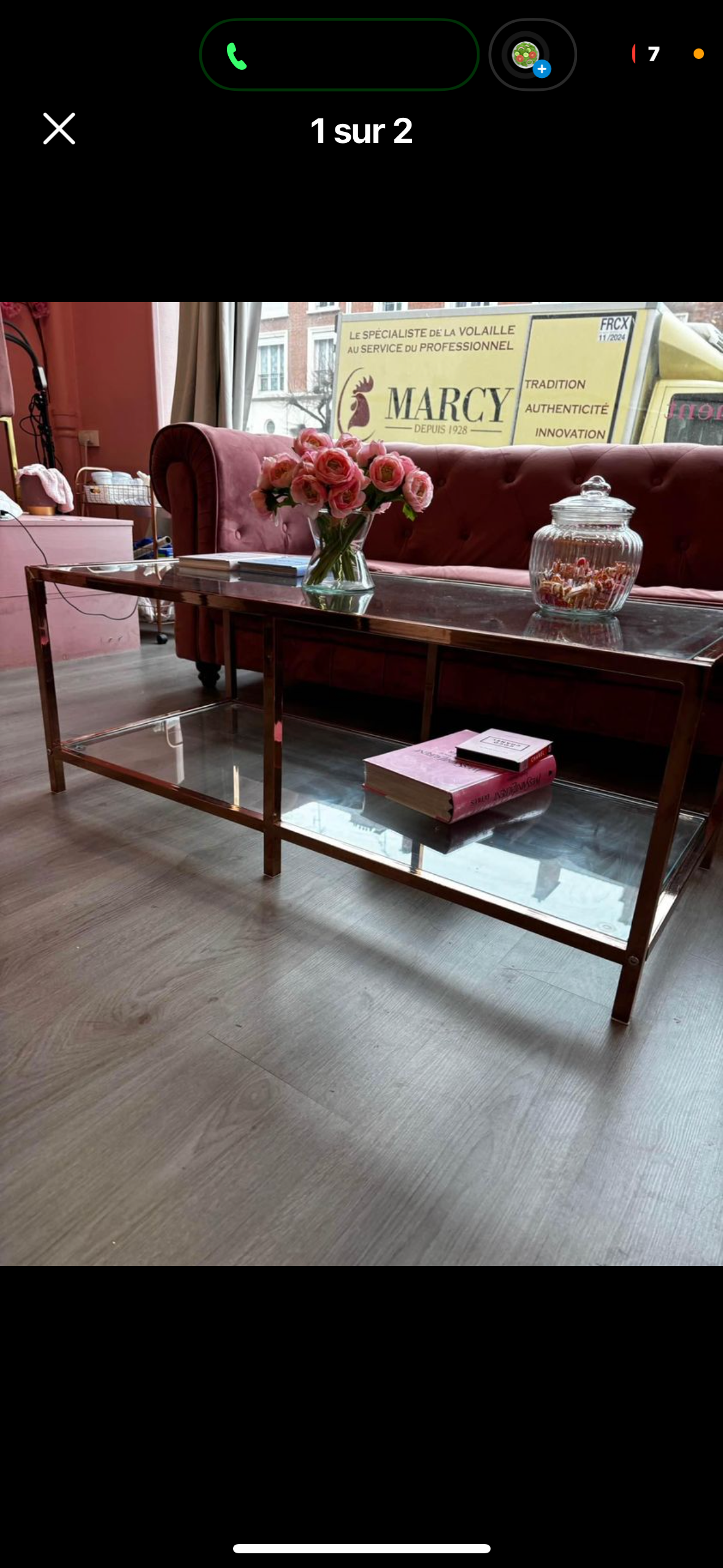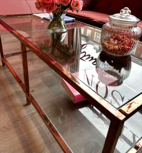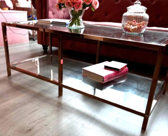 Table basse rectangulaire qui se compose de 2 étages vitrés et d'une structure en métal rose gold. Elle est comme neuve, ne présente aucune trace d’usure/de défaut.