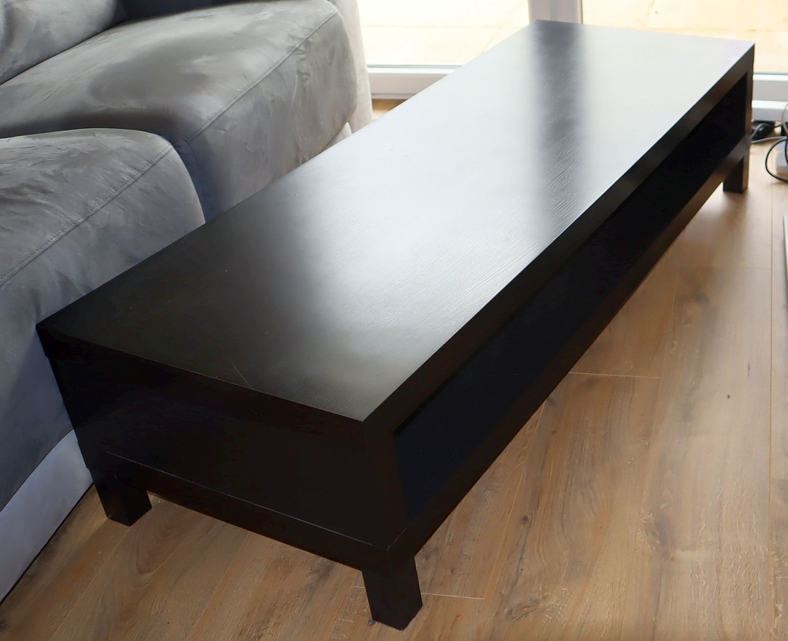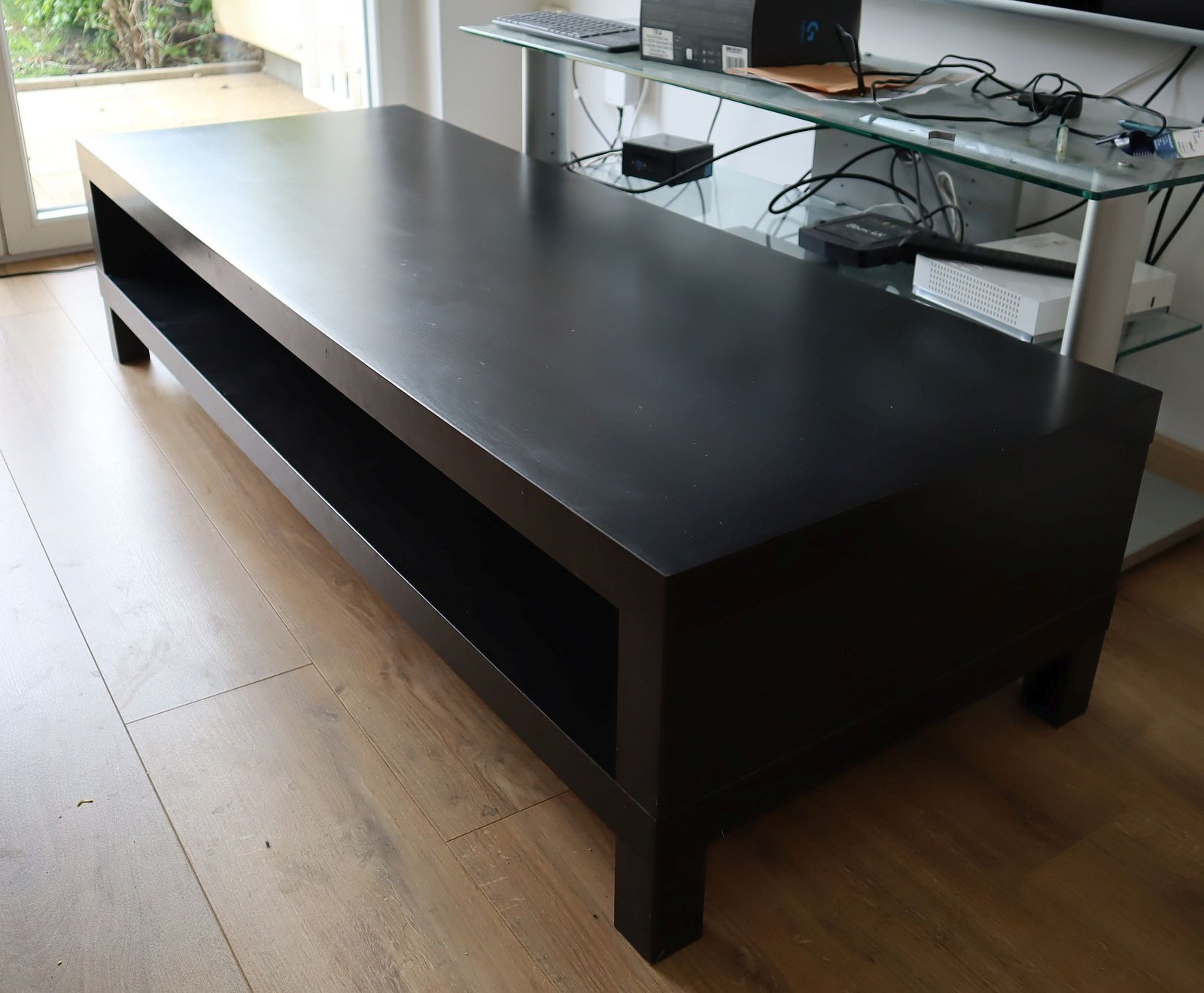 Table de salon de couleur noire satinée, fabrication résistante, l'espace de l’étagère est de 15 cm. Table en très bon état, le prix neuf est de 139 €.