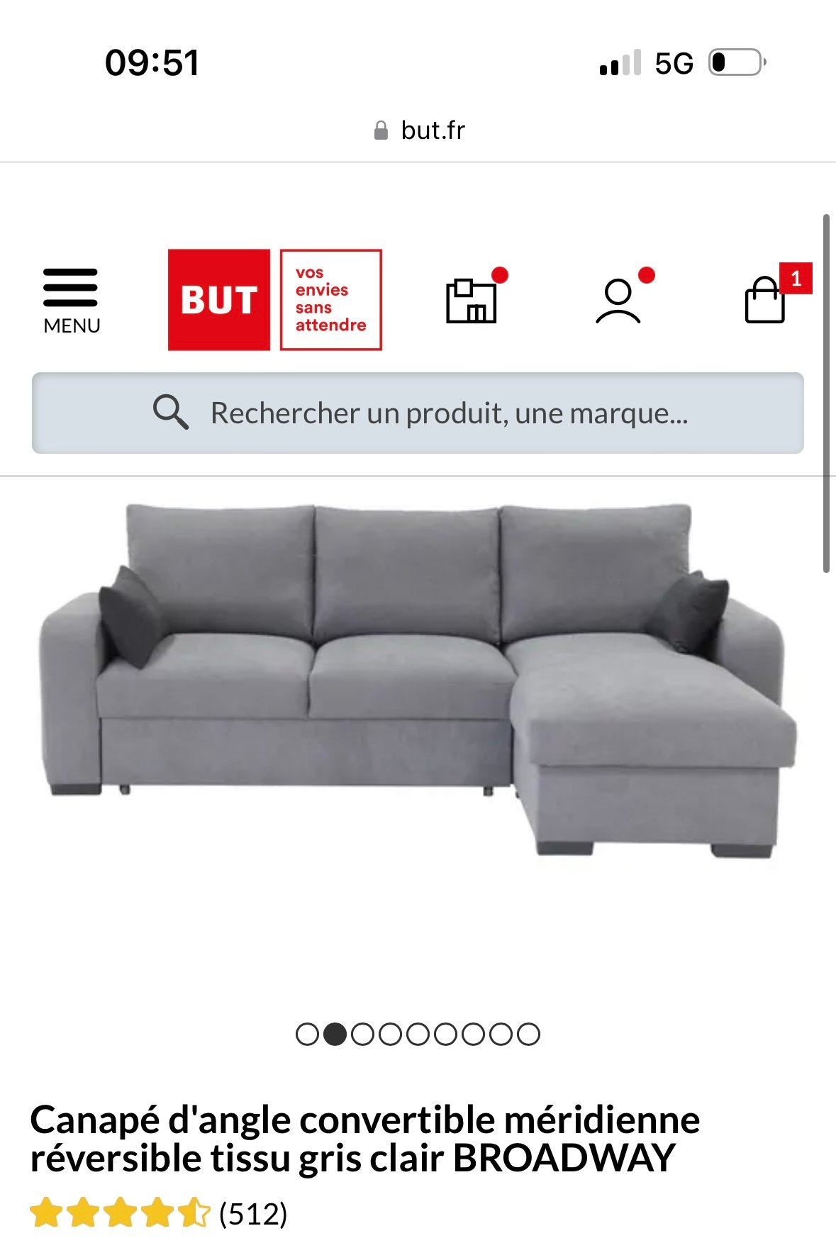 Canapé d’angle convertible, acheté il y a à peine un an, encore sous garantie chez BUT. En très bon état, avec un tout petit trou sur un des coussins (photo disponible sur demande).