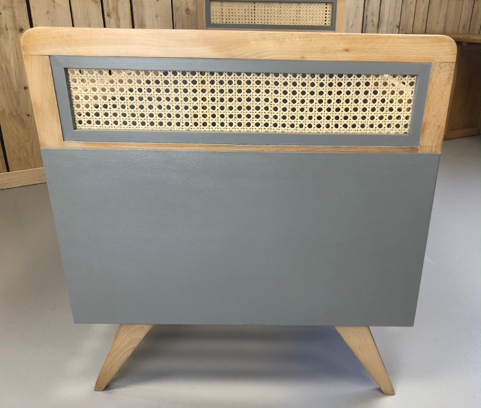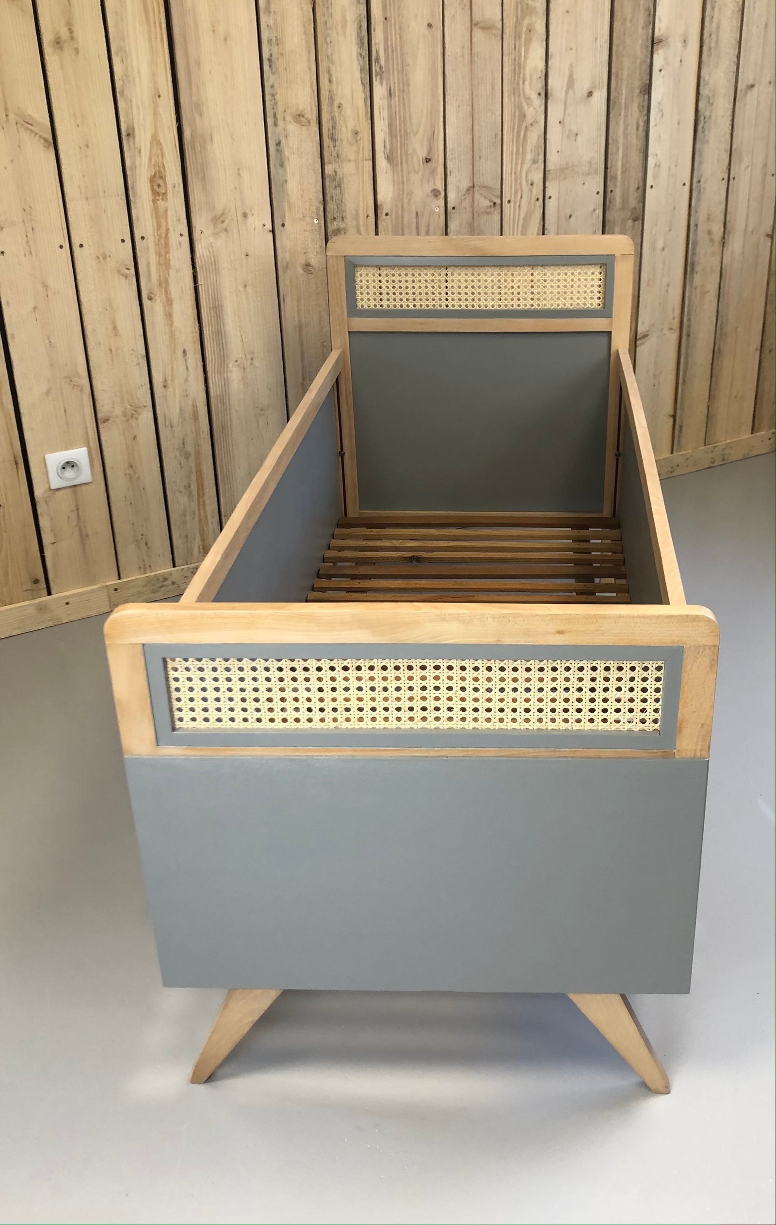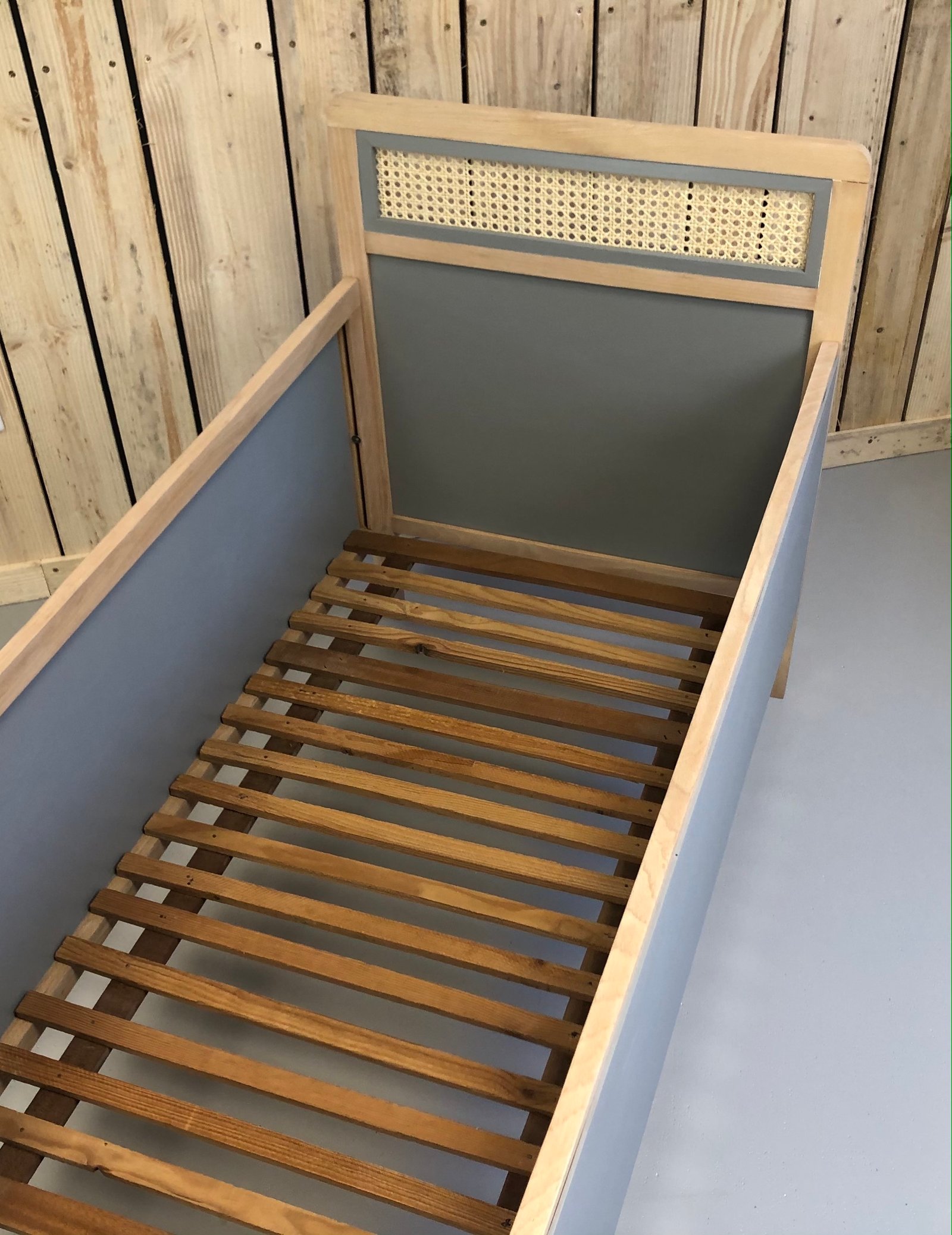 Craquez pour ce joli petit lit enfant vintage Il apportera une touche originale dans la chambre de votre enfant, ses lignes sobres, sa couleur toute douce, le bois naturel s'intégrerons facilement dans différentes d'ambiances. Il a été entièrement décapé Sa mise en couleur: gris LITTLE LAMB et sur les parties restées en bois clair une huile incolore mate Ajout d'insert en rotin pour remplacer le rotin tressé manquant qui existait à l'origine. Ce meuble a déjà vécu une première vie, même si le plus grand soin à été apporté à sa rénovation, des traces du temps peuvent encore être visibles, ce qui le rend unique. Dimension matelas : 140 X 62
