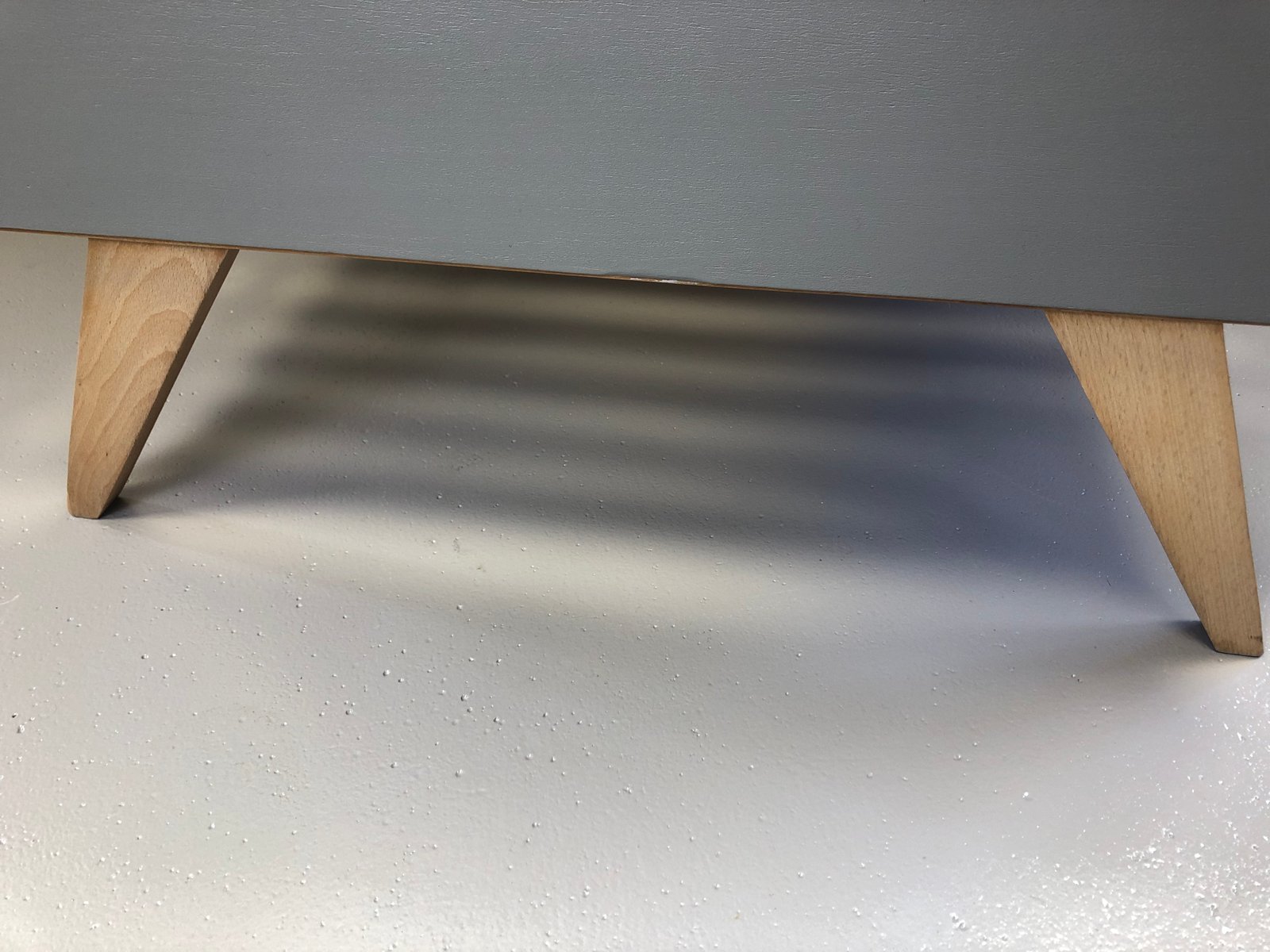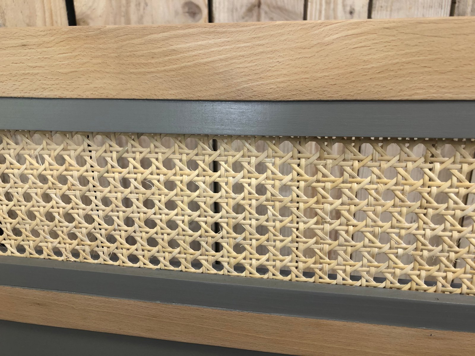 Jolie petite enfilade Elle a été entièrement décapée afin de retrouver son bois clair. Sa mise en couleur: COAL BLACK et sur les parties restées en bois clair un vernis incolore mat Les poignées d'origine ont été nettoyées et peintes en noir mat Les portes ont été retravaillées avec un ajout de rotin Idéale pour les petits espaces, elle pourra servir d'enfilade TV et s'intégrer facilement dans votre séjour ou votre chambre Ce meuble a déjà vécu une première vie, même si le plus grand soin a été apporté à sa rénovation, des traces du temps peuvent encore être visibles, ce qui le rend unique.
