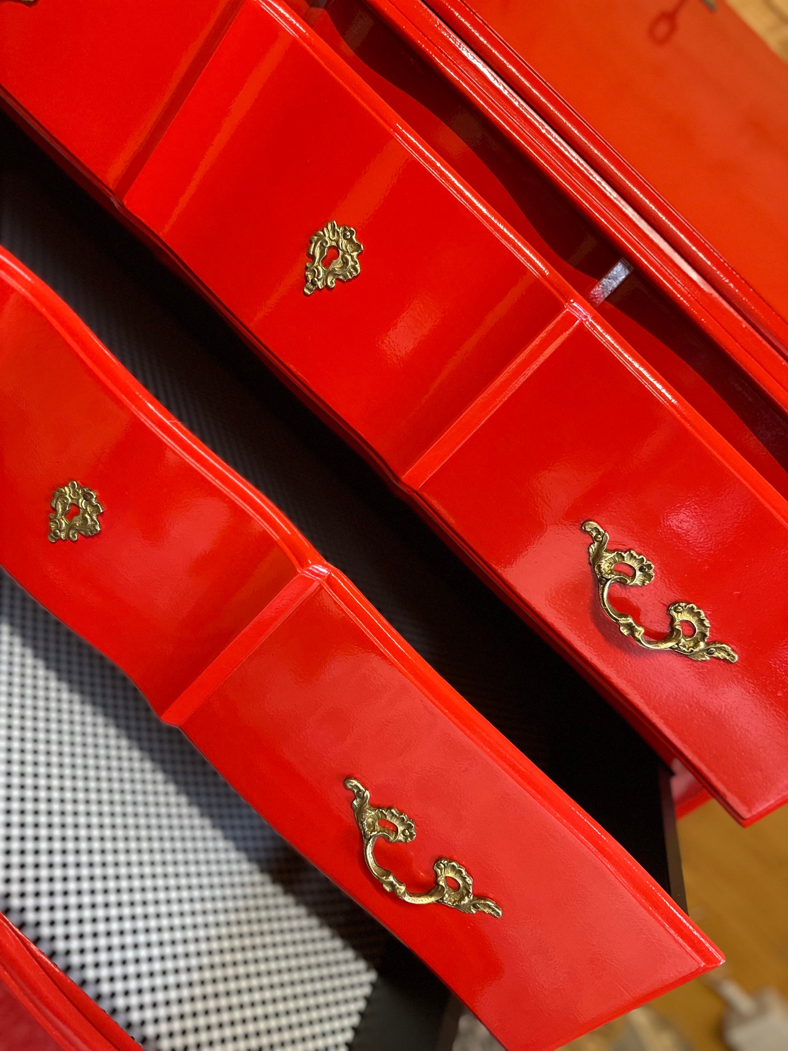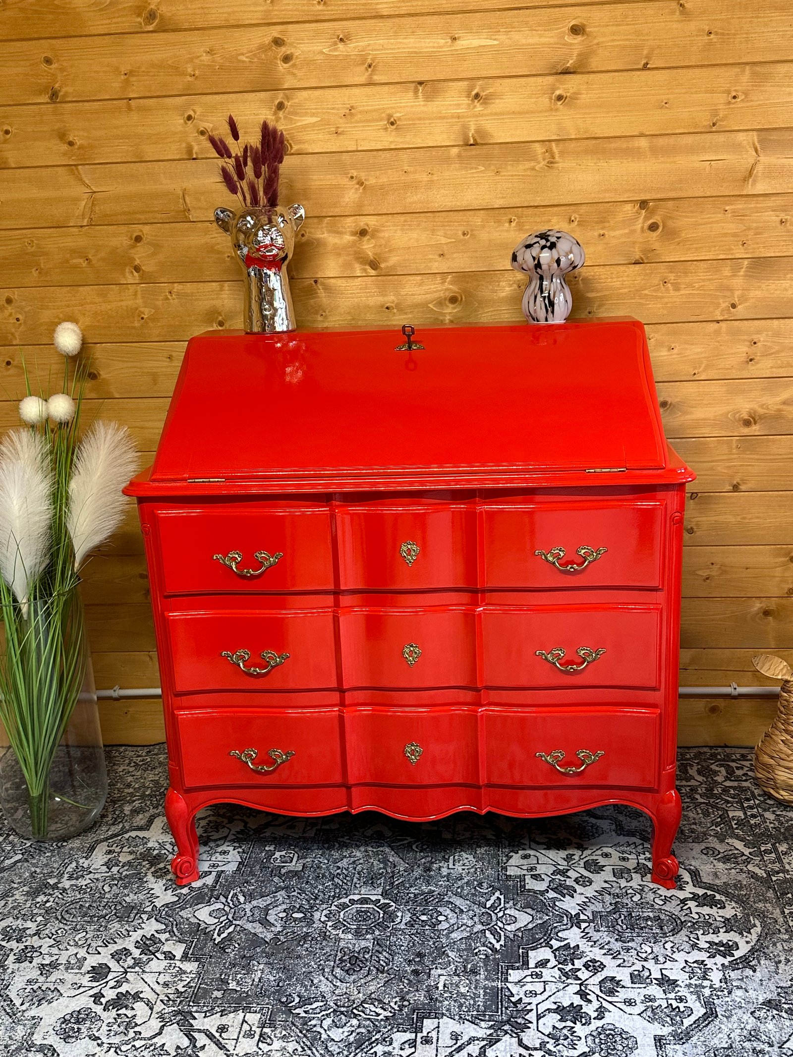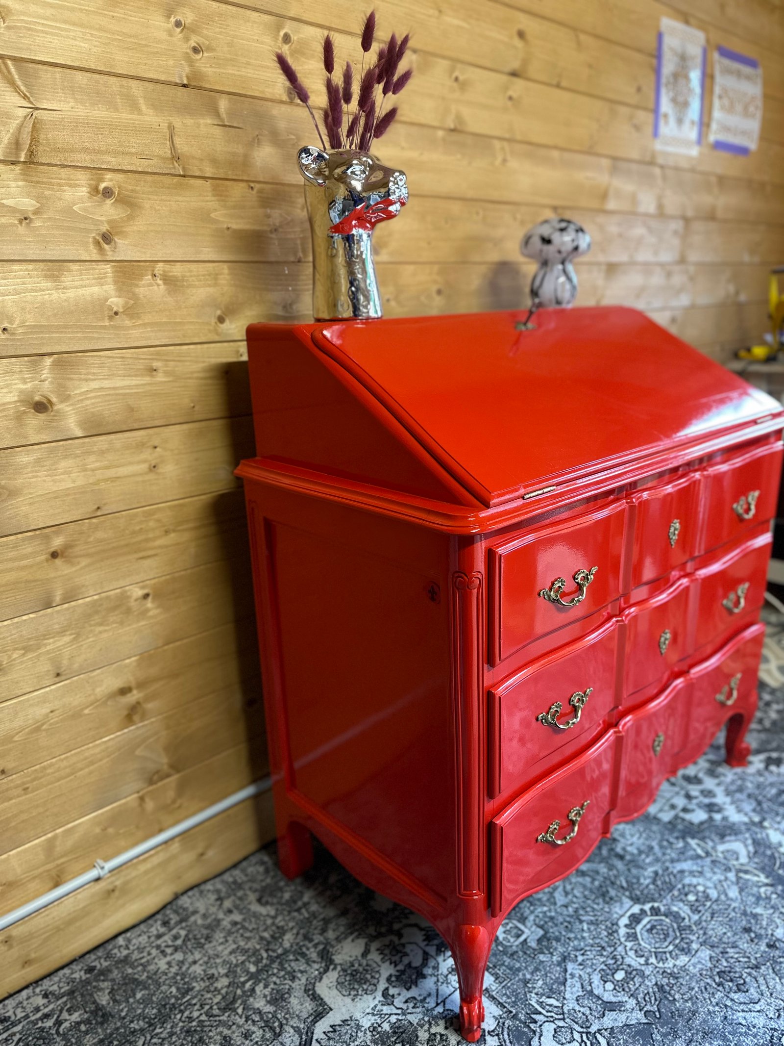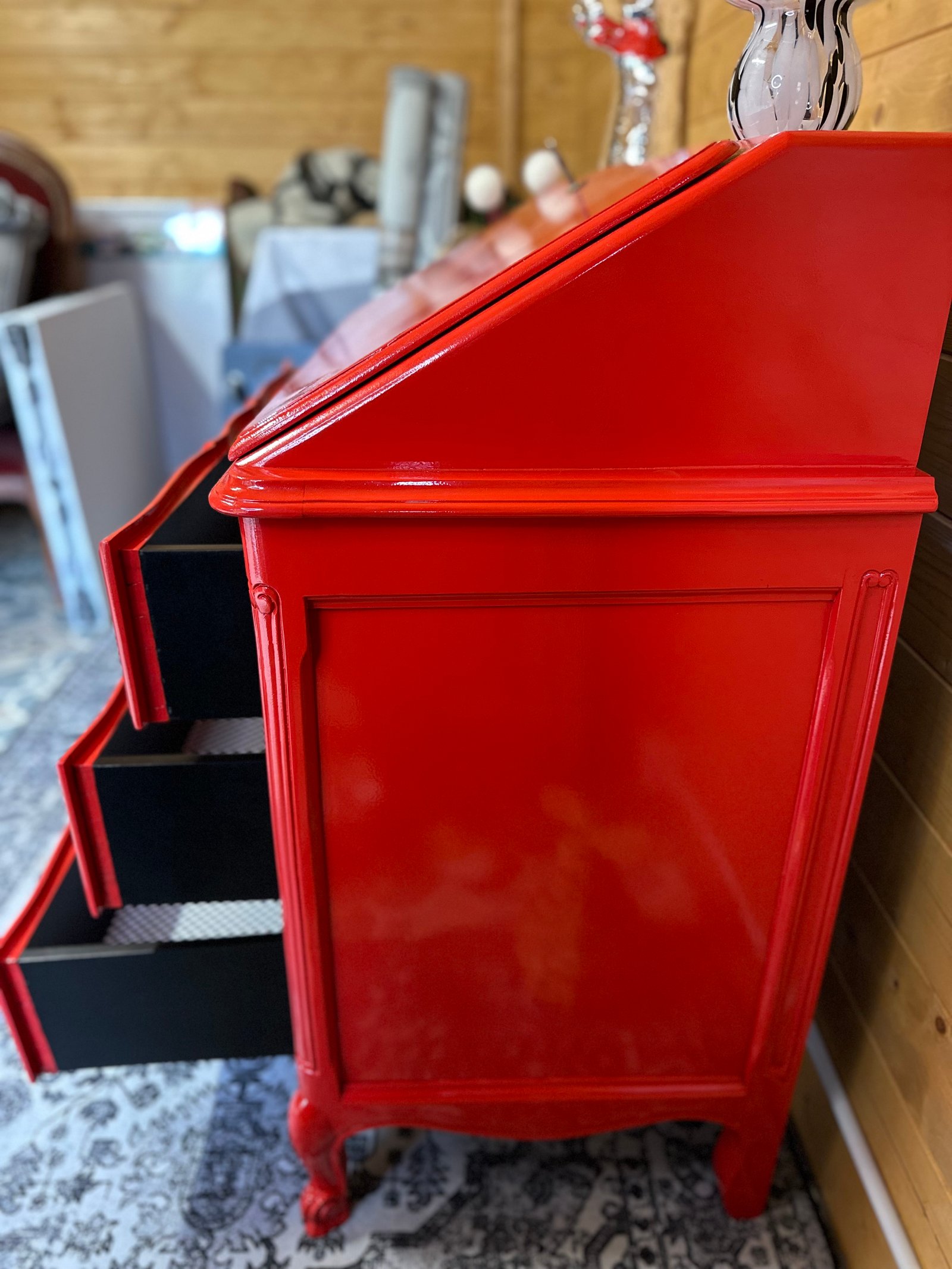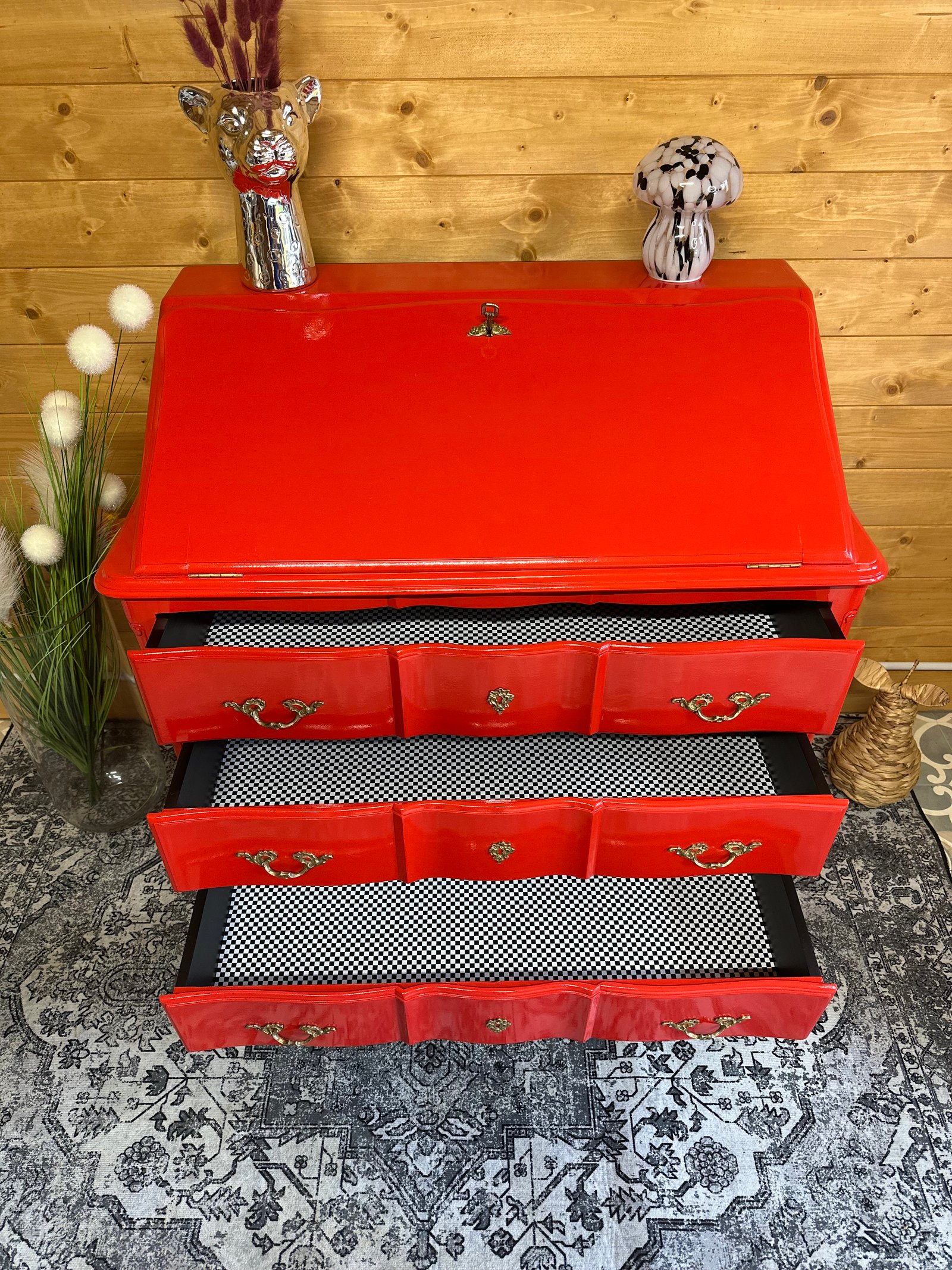 Magnifique commode secrétaire revisité avec sa couleur rouge vif qui lui assure un chic unique ❤️ les tiroirs sont en damier noir et blanc et leurs côtés en noir pour plus de profondeur Pièce unique revisitée ! Pour plus de renseignements n’hésitez pas à me contacter 😉