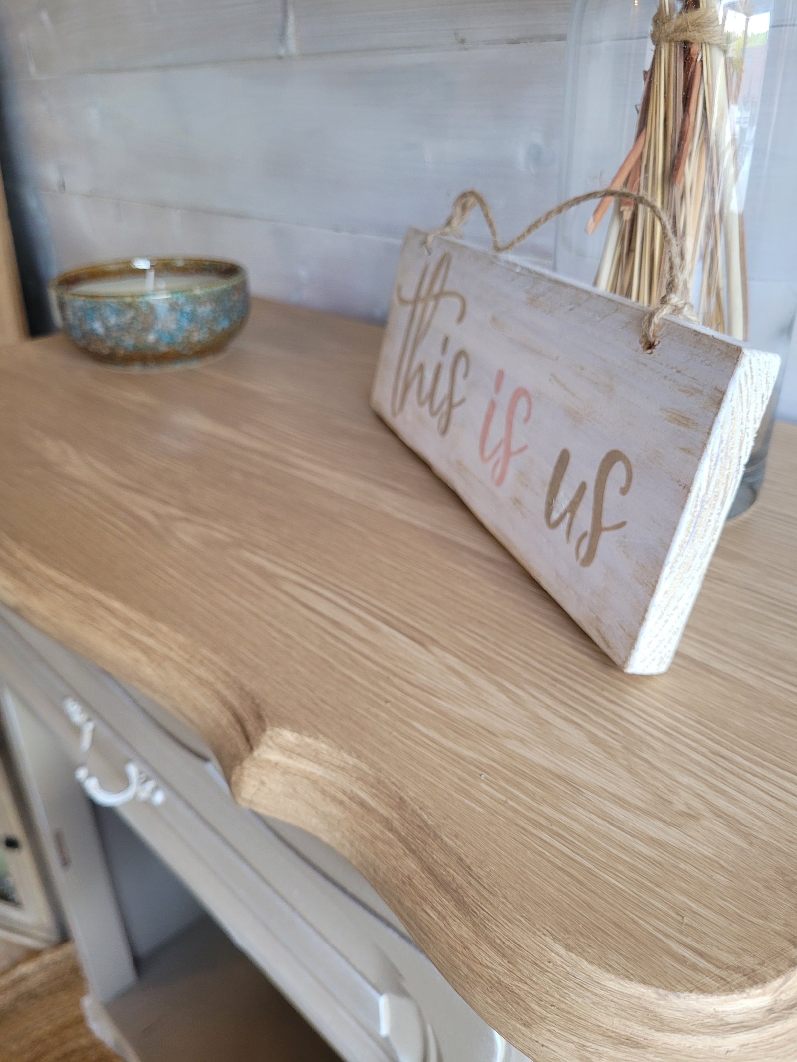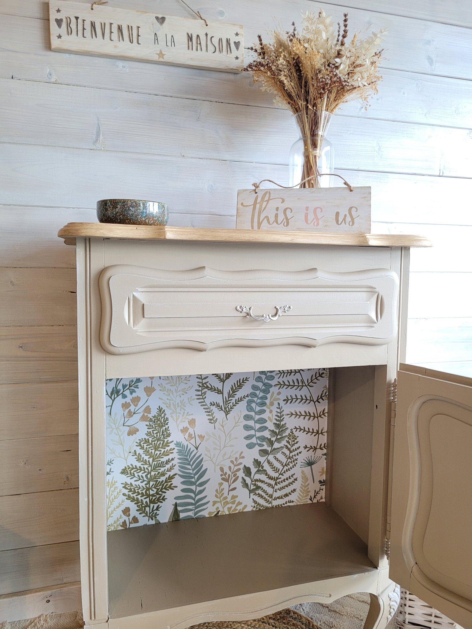 Joli confiturier en chêne massif relooké Dim : L65,5xP35xH85cm Un style campagne chic avec son plateau effet bois clair et sa teinte Corde très tendance. Un papier peint fleuri sur le fond du tiroir et l'intérieur de la niche et un effet brossé très léger renforce les arrêtes les moulures et les ferrures pour plus de cachet et de douceur. Une étagère supplémentaire à l'intérieur de la niche pourra aisément être ajoutée pour plus de capacité de rangement. Un pochoir sur la façade de la porte est également envisageable(avec supplément). A l'atelier, je l'ai entièrement nettoyé, mis en couleur, tapissé et vitrifié. Ce meuble est rénové avec des peintures françaises respectueuses de l'environnement. Sans solvant ni COV. Mon atelier est situé dans les Yvelines. Je donne une seconde vie aux meubles oubliés ou de seconde main, grâce à un savoir-faire certifié et ma passion pour le relooking. Mes tarifs sont calculés "main d'œuvre et produits compris" sans possibilité de négociation.