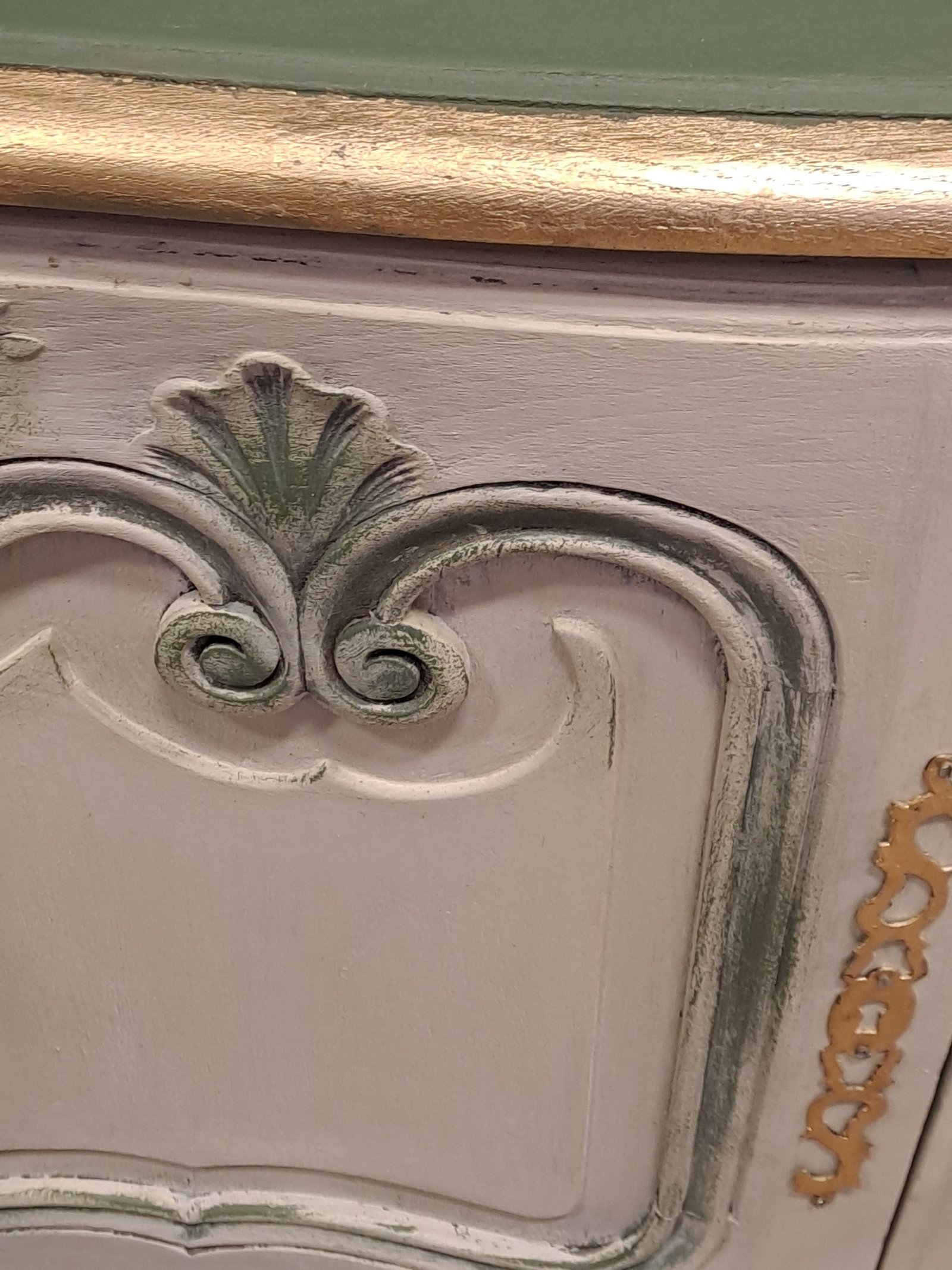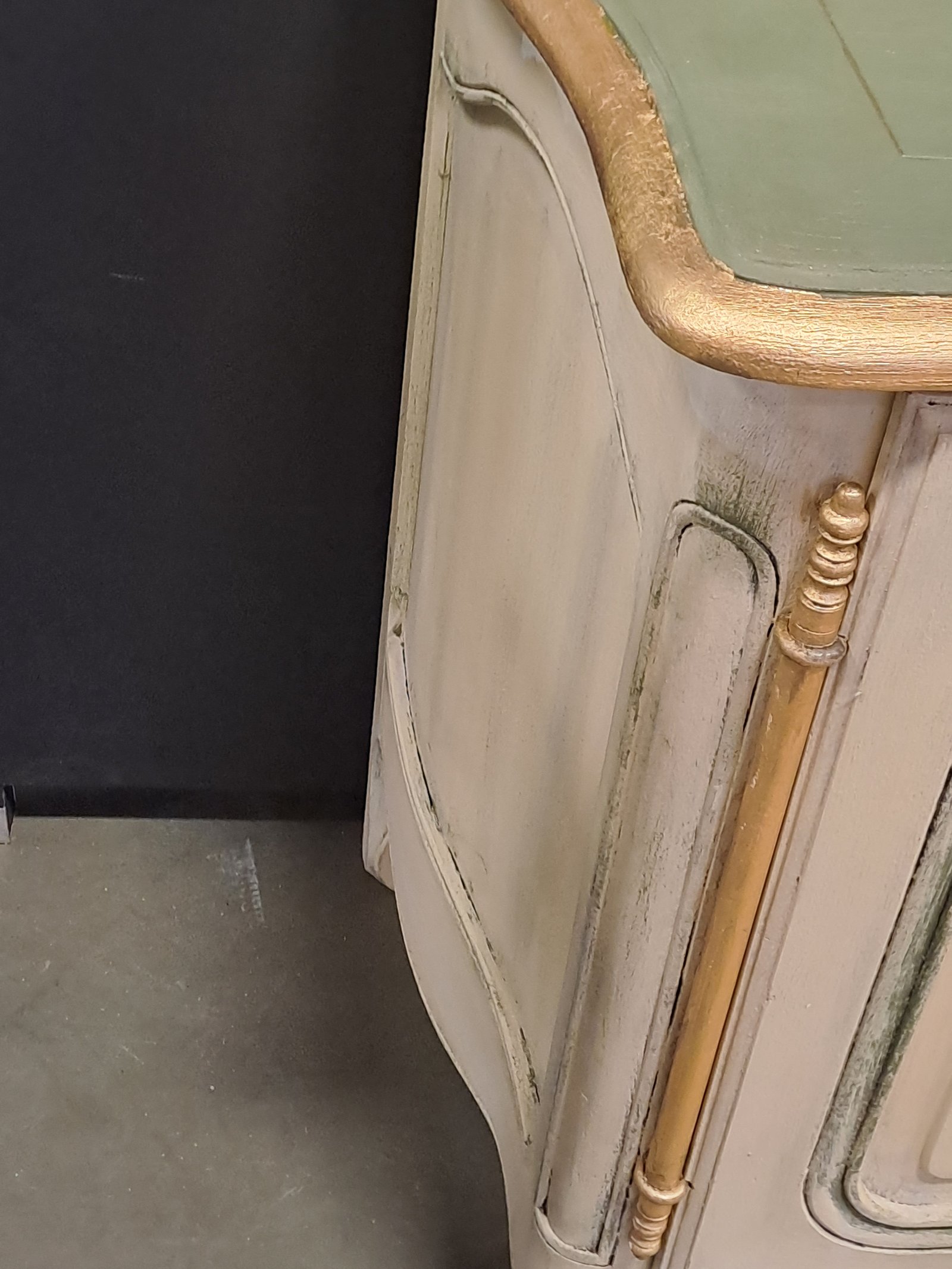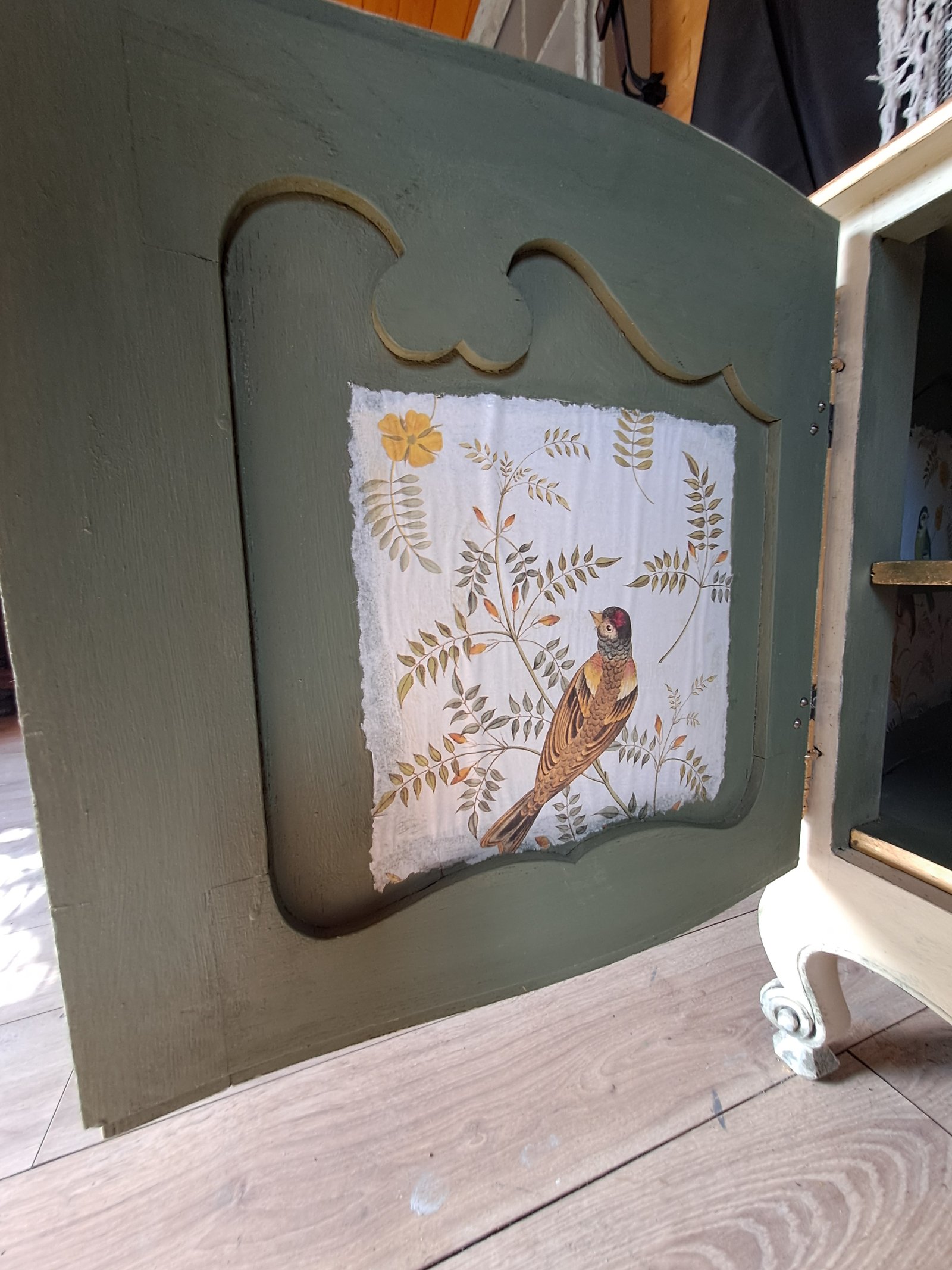 "Parfait pour apporter une note de charme et de lumonosite" Cet ancien buffet en chêne qui a vécu dehors plusieurs mois, combine à la fois l'élégance du blanc ocre et du vert olive (peinture à la craie) soulignée par de discrètes dorures (feuilles d'or). Sans oublier l'interieur qui a été peint en vert olive mis en valeur par un collage de papier de riz représentant des oiseaux colorés afin d'apporter un style campagne chic. Tout cet ensemble harmonieux met en avant ses lignes classiques tandis que les touches dorées ajoutent un éclat sophistiqué.