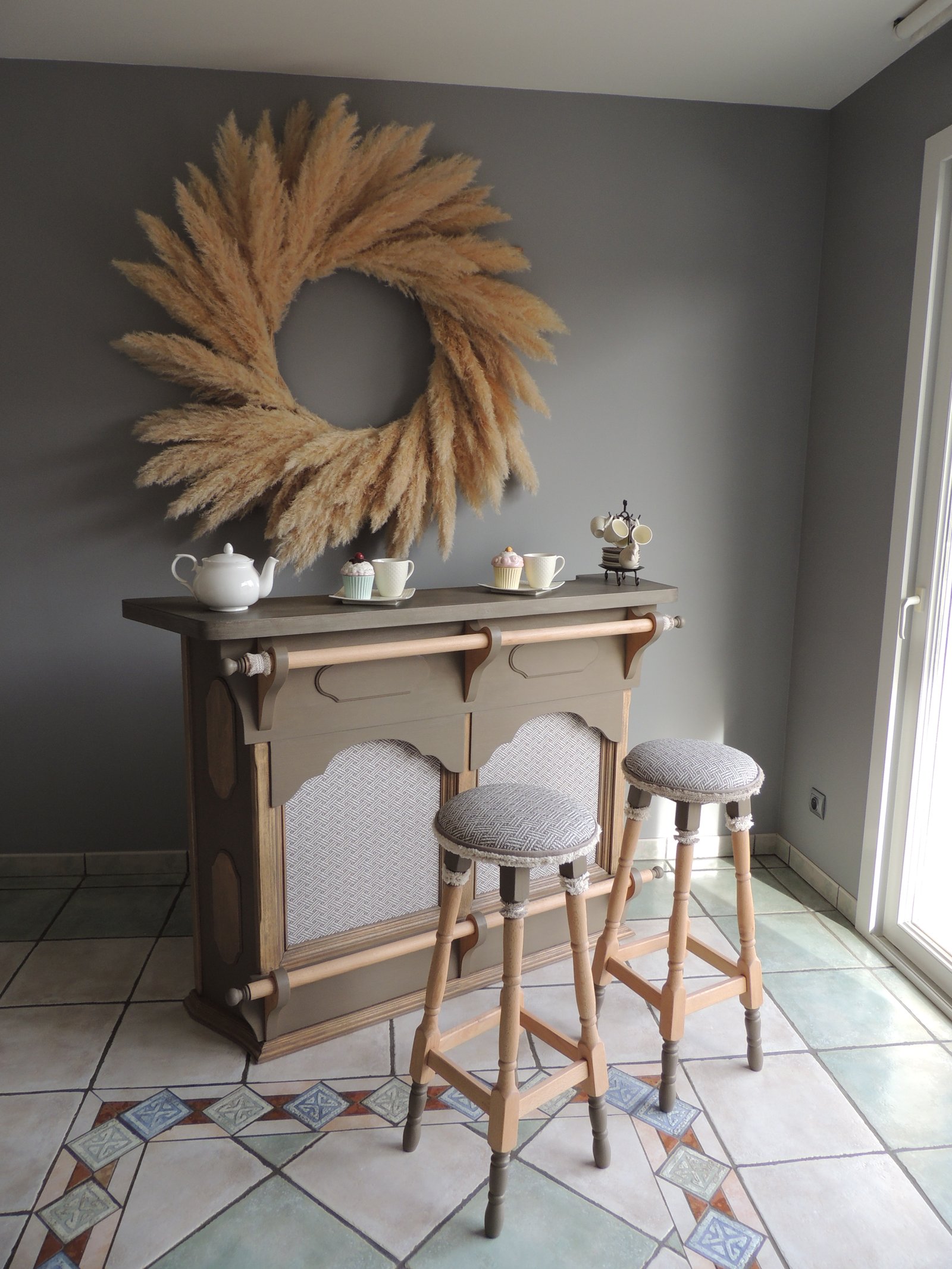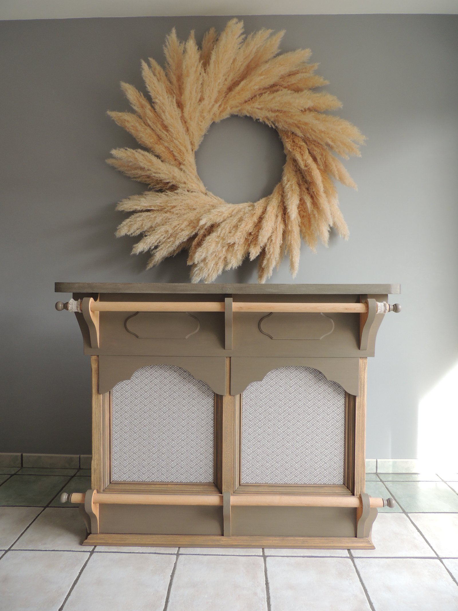 Plongez vos invités dans une ambiance unique avec ce bar exceptionnellement relooké, prêt à émerveiller vos convives au moment du thé et de l'apéro. Cet ensemble bar et tabourets va devenir le point central de votre espace de vie. Ce bijou unique marie le style bohème contemporain avec une touche artistique, créant ainsi une pièce véritablement captivante. Caractéristiques du bar : Le bar lui-même est une œuvre d'art fonctionnelle, mêlant habilement des textures riches, des couleurs naturelles et des détails artisanaux. Le comptoir arbore des motifs géométriques inspirés du style bohème. Les étagères, soigneusement intégrées, offrent un espace suffisant pour exposer vos spiritueux préférés, verres, tasses... La surface du bar est finement travaillée pour résister aux éclaboussures, facilitant ainsi son entretien tout en conservant son élégance bohème. Tabourets assortis vendu avec : Les deux tabourets accompagnant ce bar sont le complément parfait. Leur design ergonomique et leur assise confortable sont revêtus d'un tissu skaï aux motifs berbères, ajoutant une dimension chaleureuse et accueillante à l'ensemble. Les pieds en bois massif complètent le look bohème, assurant une stabilité optimale. Détails techniques : Matériaux : bois massif, tissus de qualité supérieure - skaï structuré lavable. Couleurs dominantes : gris, beige, bois naturel vernis ultra mat.