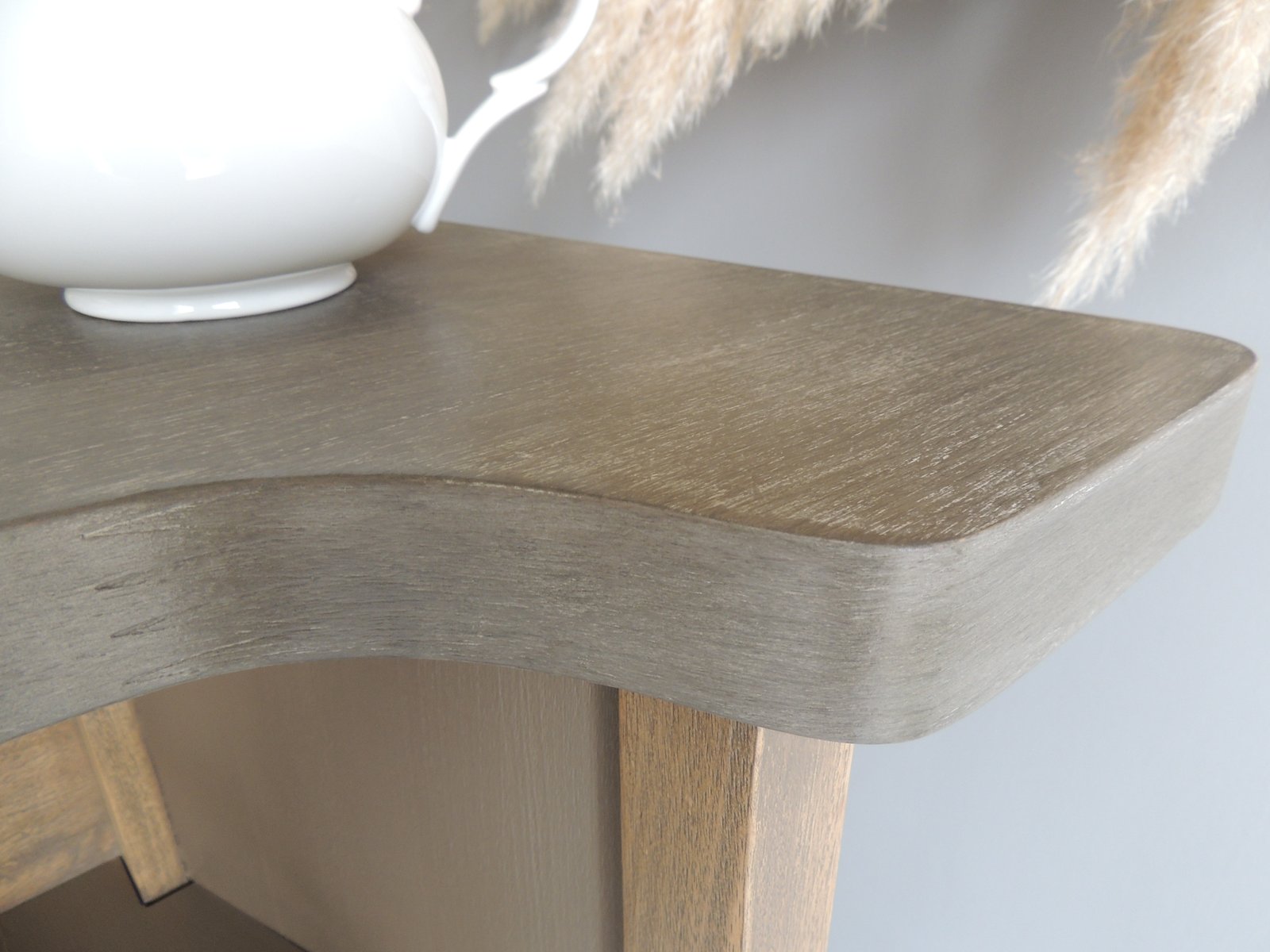 Ancienne table de toilette revisitée. En bois de noyer 100% massif pour le piètement et plateau en chêne. Bureau, console, coiffeuse, elle est multifonction mais loin d'être passe-partout ! Décapée, aérogommée, peinte, vernie et tapissée, finition du plateau avec des motifs peints à la main. D'une originalité folle, cette pièce unique va décorer une pièce en lui apportant son supplément d'âme. Le choix du motif du plateau évoque la tapisserie de la façade du tiroir, une note de poésie raffinée. Un contraste bois clair versus bleu intense pour un caractère dynamique. Cette pièce unique est pleine de gaieté. Son tiroir large, profond et compartimenté pourra accueillir plein de rangements utiles dans une entrée, un bureau ou une chambre. Dimension tiroir ext : prof 34 x l 69 cm -intérieur : 2x 34x34cm Tablette du bas l 27 x L 76 cm. Un fin liseré visible sur le dessus du meuble qui correspond à un assemblage de la planche en chêne, voir photo.