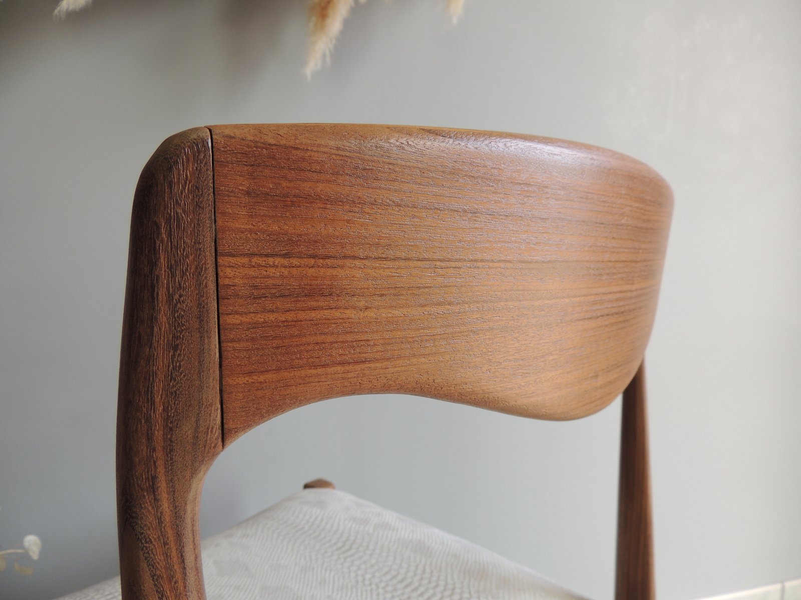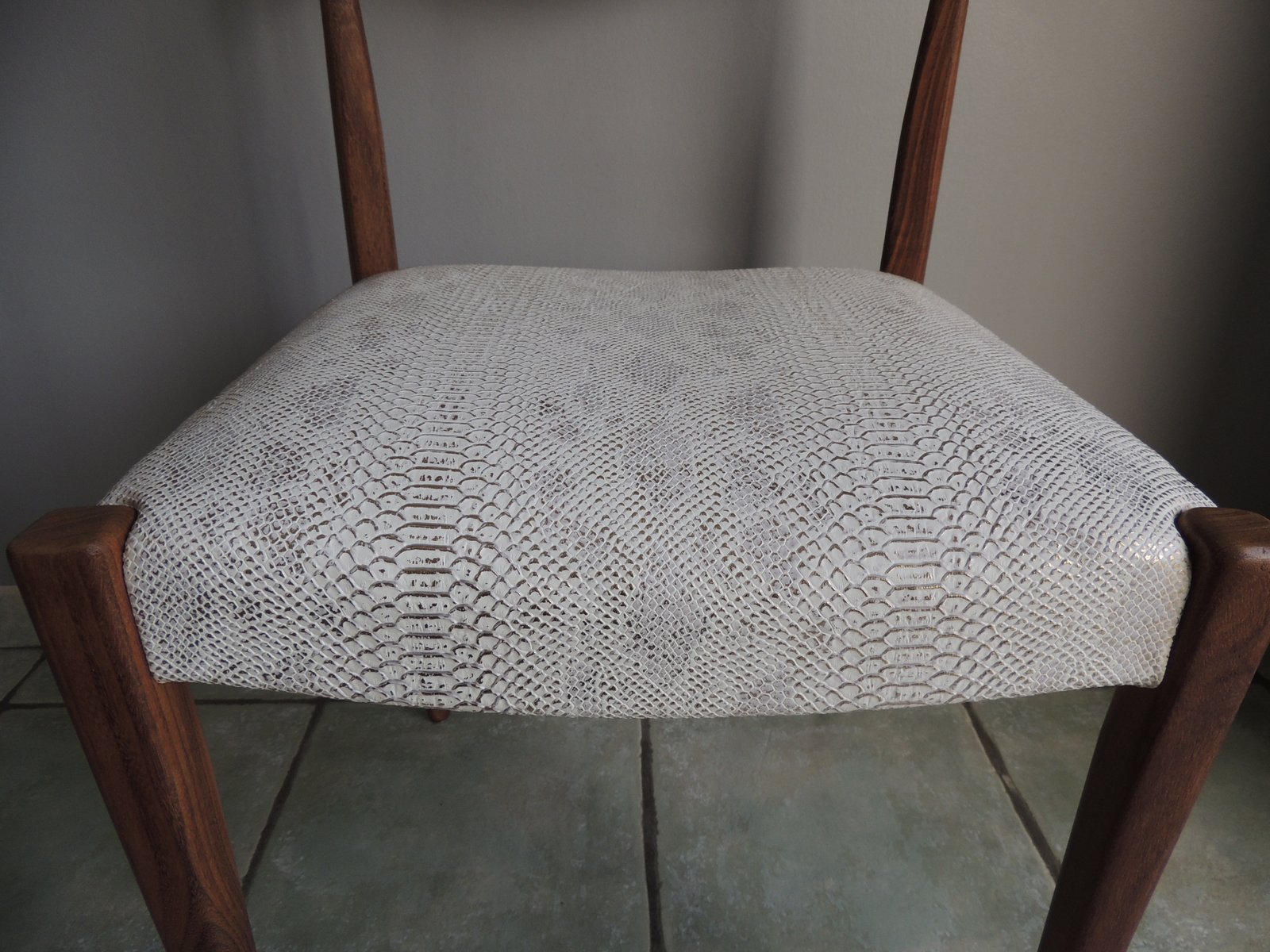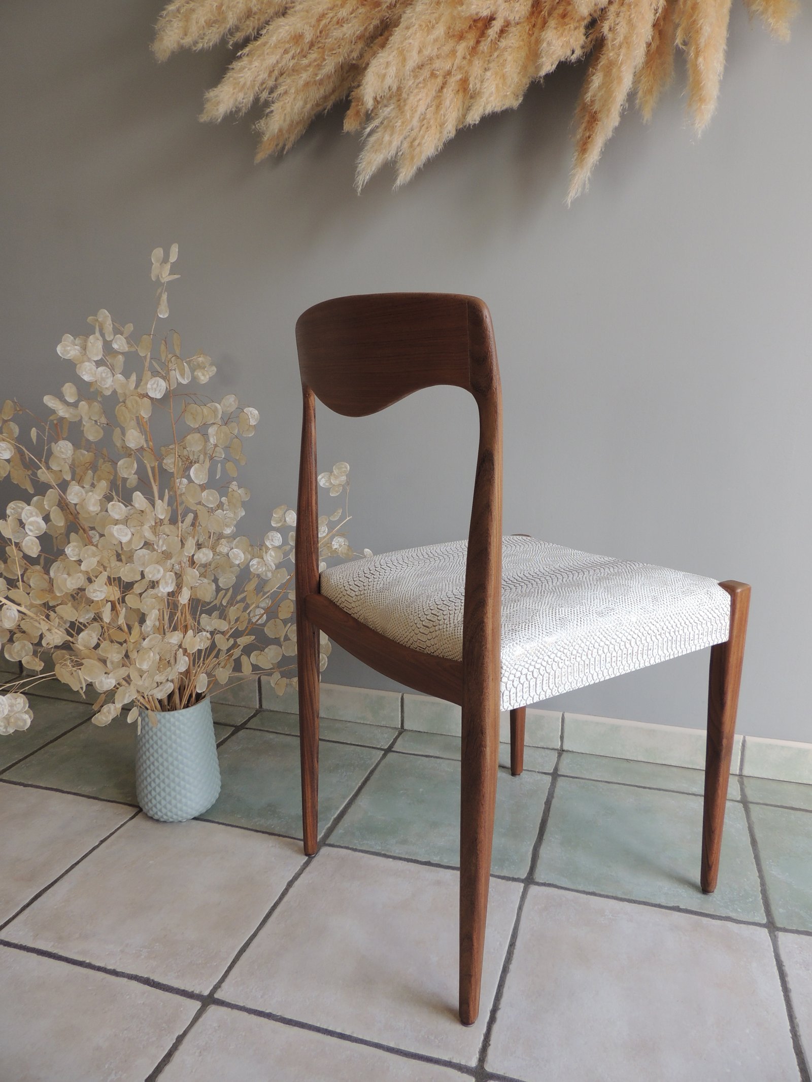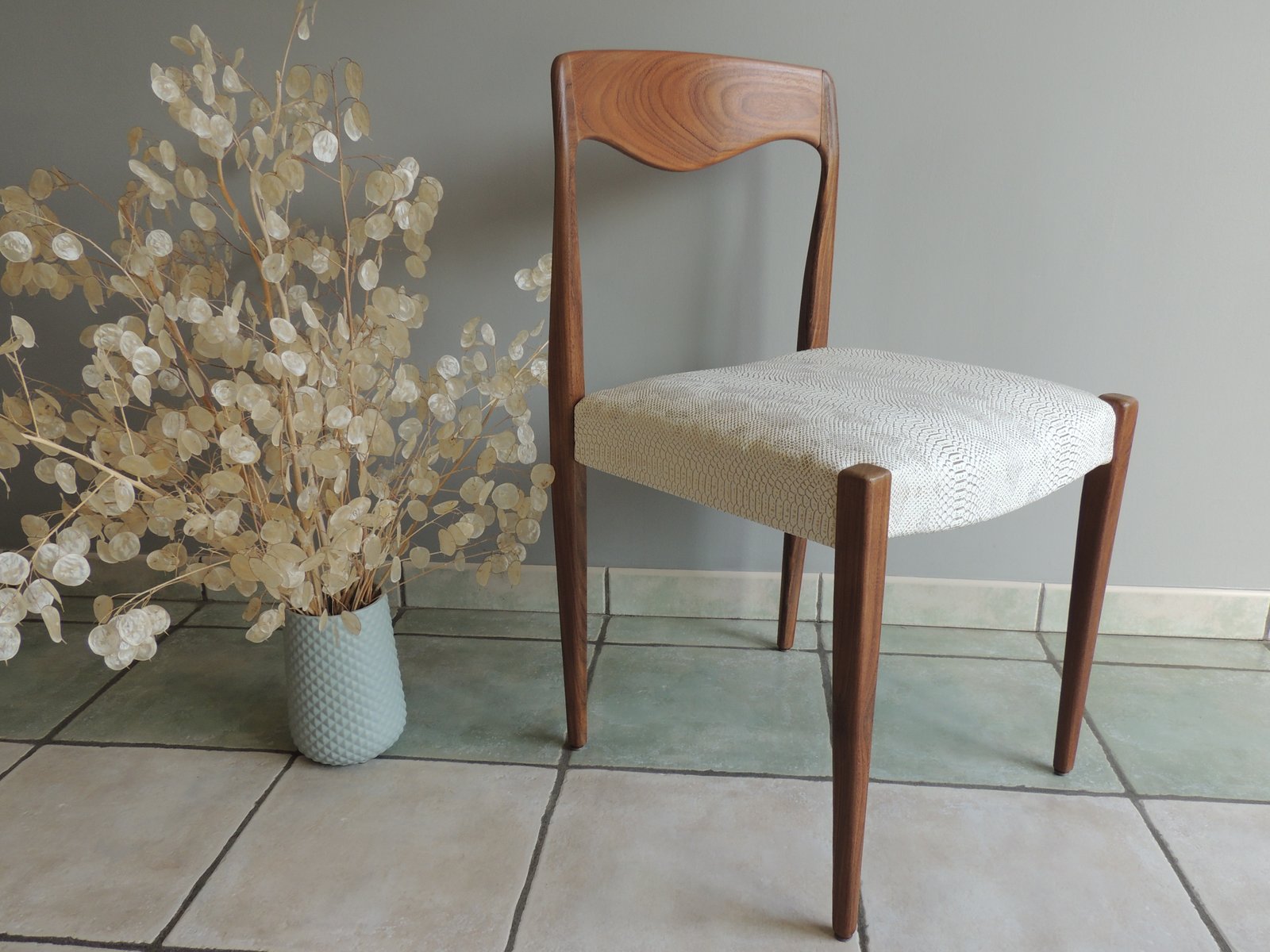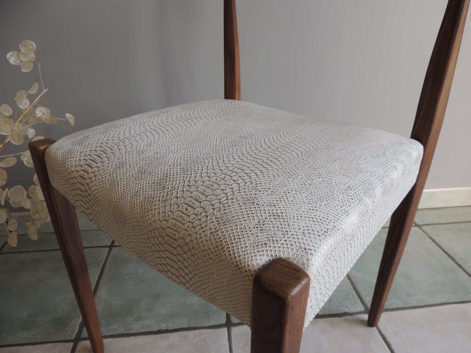 Chaise style scandinave vintage années 1950-60. Une revisite du classique en version croco, si chic ! Elle viendra apporter une touche design d'une grande élégance, fonctionnelle ou décorative : serviteur dans une chambre, dans une entrée, ou devant un bureau, laissez-la vous séduire par son caractère unique. Les points forts : - Un bois exotique aux magnifiques tonalités. - Une ligne pure avec des formes douces pour une silhouette pleine de sensualité. Le plus apporté : - Un tissu plus ludique, aussi agréable à l'œil qu'au toucher. - Structuré, il vient renforcer son caractère sensuel et contemporain. - Blanc, il vient contraster avec le bois. - Chatoyant, pour une finition chic irisée. Son + : - Un coloris blanc aux notes contemporaines mais lavable ! - Une assise carrée, très large, confort ++ avec le profilé incurvé avant. La finition et le soin mis en œuvre : - Cadre en teck massif rénové par aérogommage, ponçage et vernis ultra mat pour la longévité (3 couches). - La structure de la chaise a été entièrement démontée pour : - Renforcer la stabilité structurelle. - Refaire l'assise. - Changer les sangles de maintien. - Retapisser avec un simili cuir blanc et doré effet croco. chaise vintage, meuble scandinave, chaise en teck, design vintage, mobilier rénové, chaise design, meuble élégant, chaise confortable, meuble unique, décoration intérieure.