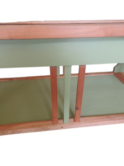 Pupitre-Écritoire-Bureau relooké. Article très décoratif et fonctionnel. Écritoire pouvant servir de bureau dans une chambre d’enfant, de table de dessin dans une salle de jeu, ou dans une chambre d’amis avec du courrier et une petite plume, il fera son petit effet. Il peut également servir de meuble d’entrée pour ranger les clés, le courrier, etc. Une forme compacte et des espaces de rangement structurés à l’intérieur. Accès par abattant relevable. Finition esthétique et robuste avec un assemblage par chevillage. La finition et le soin mis en œuvre : Aérogommage garnet 120. Ponçage de finition au papier de verre. Reprises à la pâte à bois des zones à corriger. Traitement fongicide et insecticide réalisé par application à la seringue. Coloris vert légèrement patiné à la cire dorée. Vernis cire 2 couches sur l'ensemble du meuble, mais plateau du dessus 3 couches. Son + : les pieds compas lui donnent une ligne très moderne ! Son trésor : un encrier en étain, véritable petit bijou !