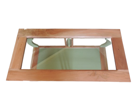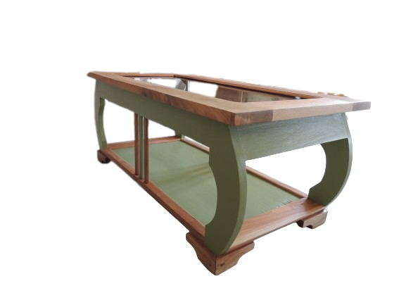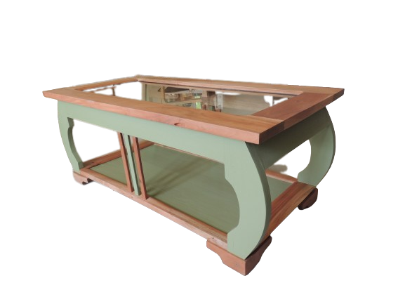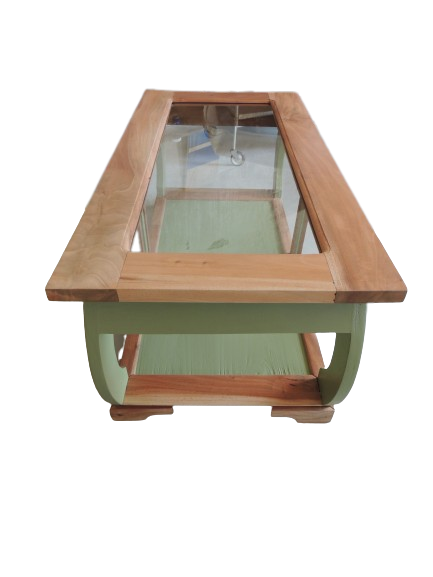 Table basse relookée par une artisane professionnelle du mobilier de seconde main. Meuble en bois massif entièrement décapé et revernis en ultra mat. La couleur vert mousse évoque la nature et vient juste sublimer la beauté du bois exotique. Les courbes donnent à cette pièce unique originalité et légèreté. Pièce vintage revalorisée, il faut donc signaler un verre d'origine avec de légères traces d'usage. table basse vintage, meuble relooké, bois exotique, vert mousse, mobilier durable, artisanat, pièce unique