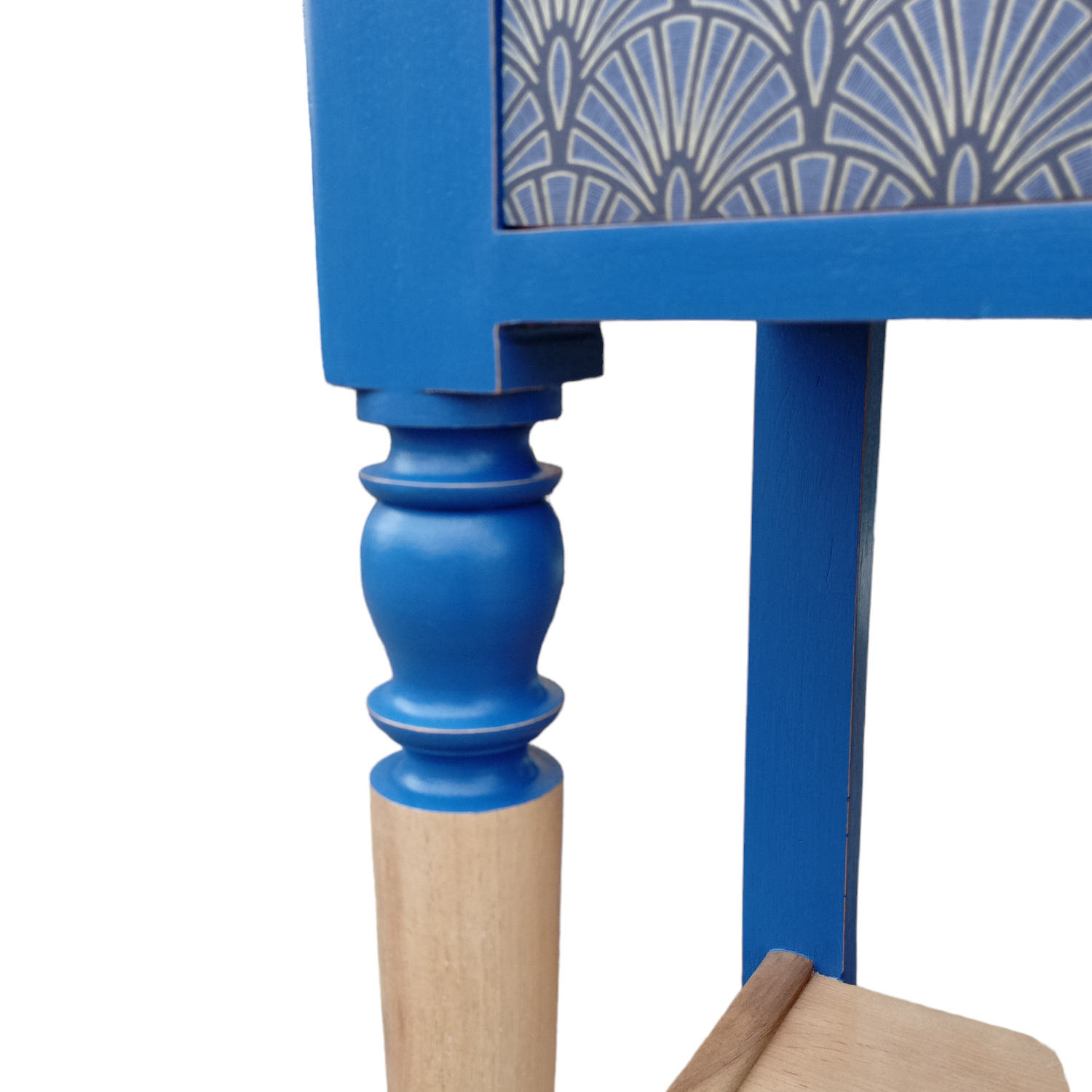 Meuble vintage entièrement rénové et revisité par une artisane professionnelle du mobilier de seconde main. Sa silhouette a été retravaillée afin d'éclaircir et d’alléger l’ensemble. Laquage bleu horizon pour son piètement compas et encadrement du tiroir et de la tablette en rappel. Pour finir, le fond est tapissé avec un motif contemporain et argenté pour apporter de la luminosité. C'est un beau mariage avec son placage chêne d'origine qui a été ravivé pour l'occasion. Il est équipé d’un casier ouvert et muni d’un tiroir. Il peut être placé dans son salon en bout de canapé, dans une chambre en table de chevet, dans une entrée comme console, ou encore dans une chambre d’enfants comme étagère de rangement. Ses atouts : pratique et élégant, de grandes dimensions pour plus de rangements, des lignes épurées, un beau contraste entre laque, tapisserie et placage bois. chevet vintage, meuble rénové, mobilier vintage, meuble pratique, meuble élégant, meuble multifonction, placage chêne, laquage bleu horizon, tapisserie contemporaine.