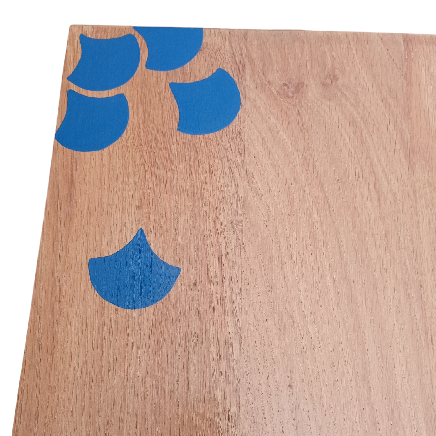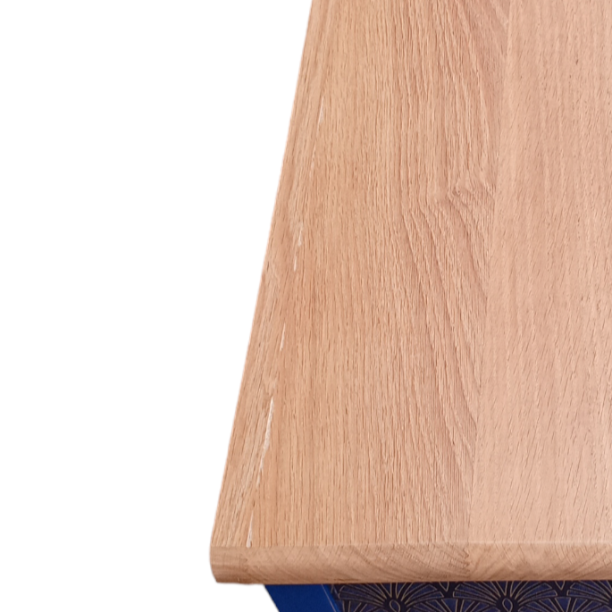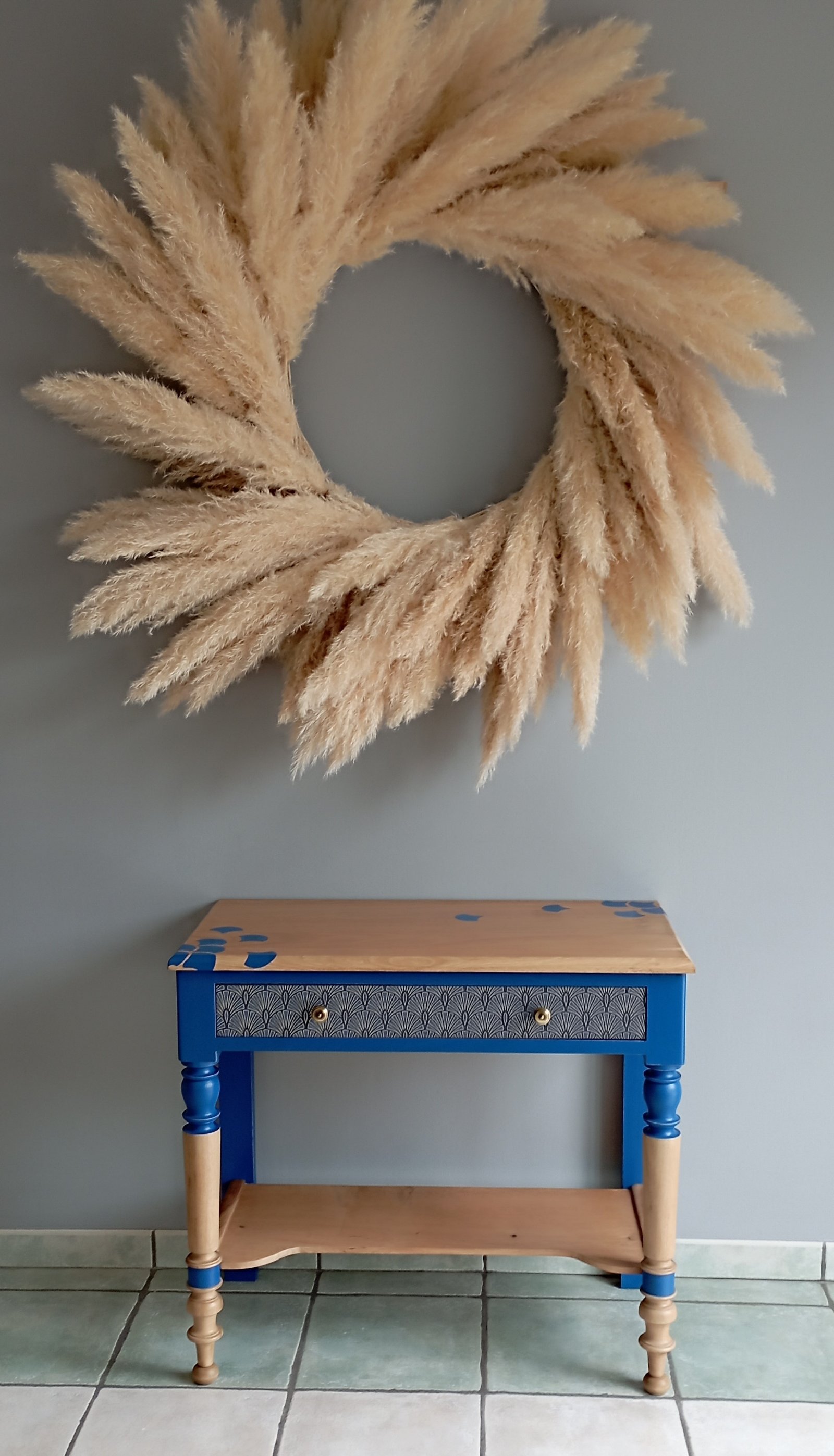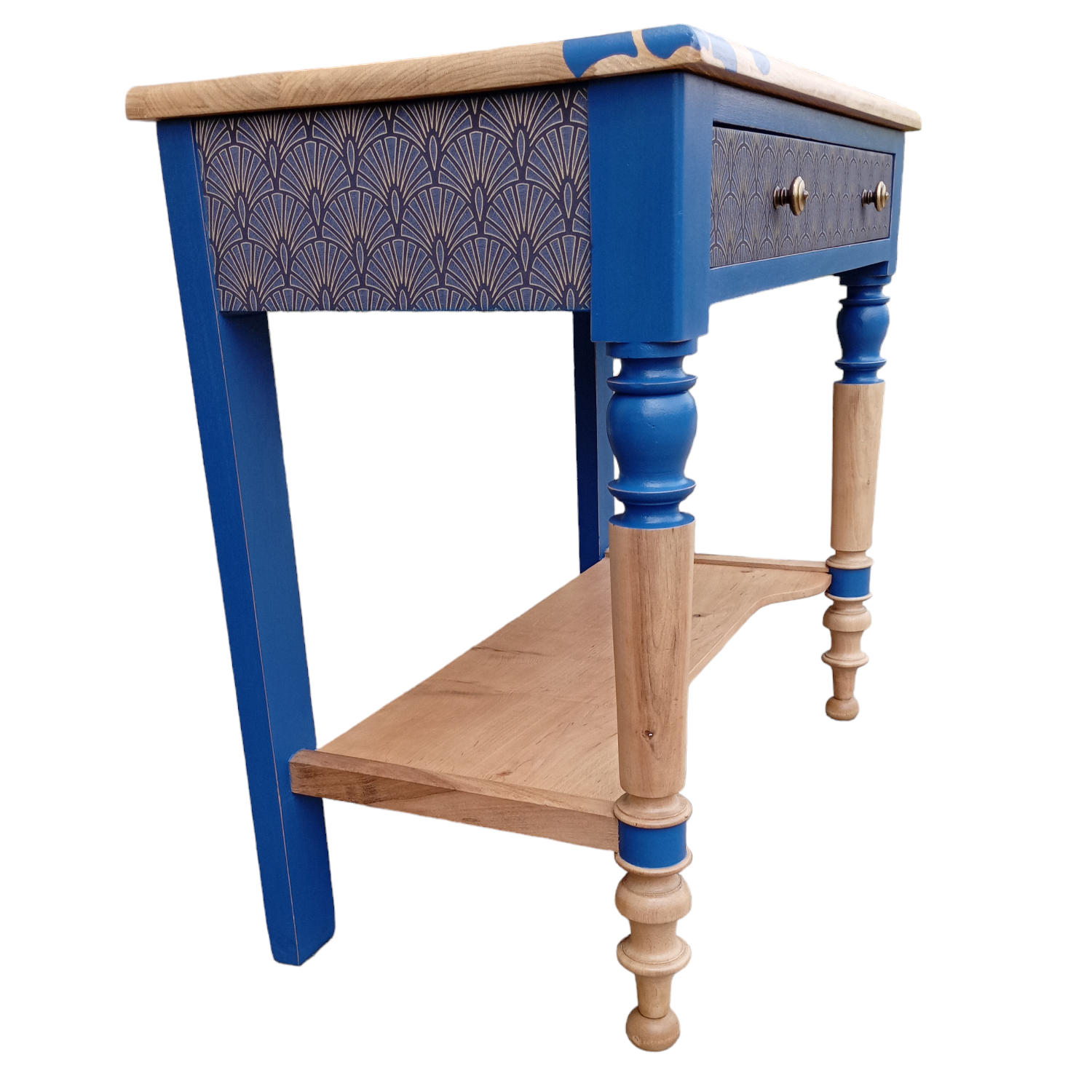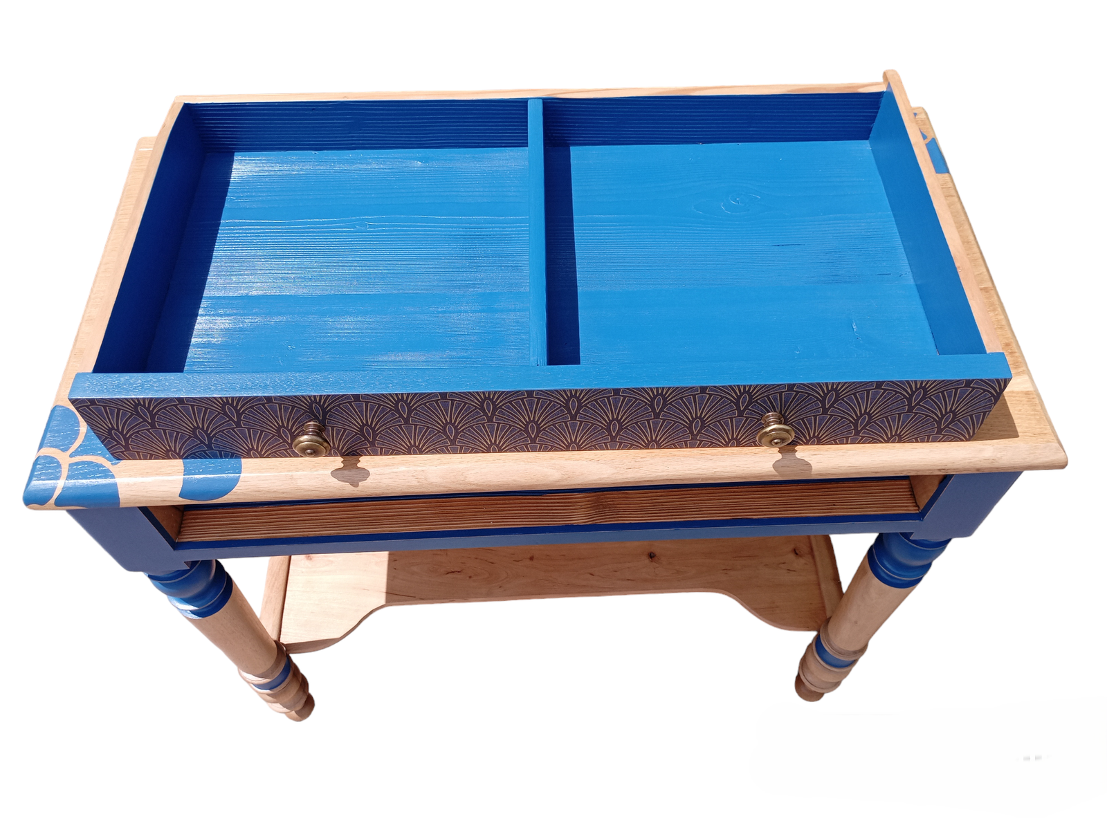 Ancienne table de toilette revisitée. En bois de noyer 100% massif pour le piètement et plateau en chêne. Bureau, console, coiffeuse, elle est multifonction mais loin d'être passe-partout ! Décapée, aérogommée, peinte, vernie et tapissée, finition du plateau avec des motifs peints à la main. D'une originalité folle, cette pièce unique va décorer une pièce en lui apportant son supplément d'âme. Le choix du motif du plateau évoque la tapisserie de la façade du tiroir, une note de poésie raffinée. Un contraste bois clair versus bleu intense pour un caractère dynamique. Cette pièce unique est pleine de gaieté. Son tiroir large, profond et compartimenté pourra accueillir plein de rangements utiles dans une entrée, un bureau ou une chambre. Dimension tiroir ext : prof 34 x l 69 cm -intérieur : 2x 34x34cm Tablette du bas l 27 x L 76 cm. Un fin liseré visible sur le dessus du meuble qui correspond à un assemblage de la planche en chêne, voir photo.