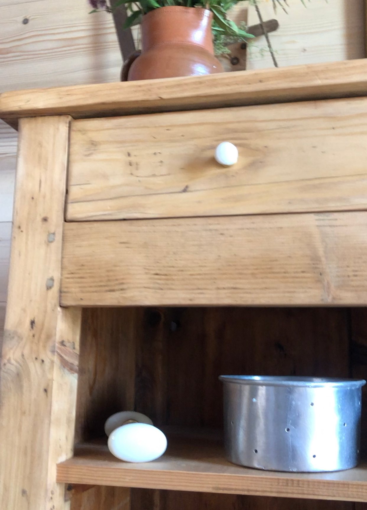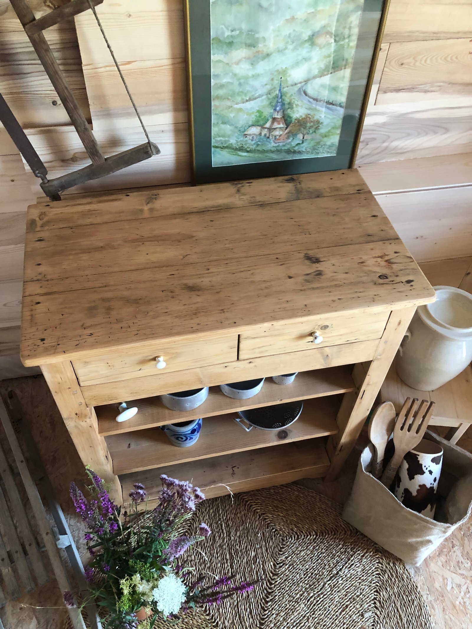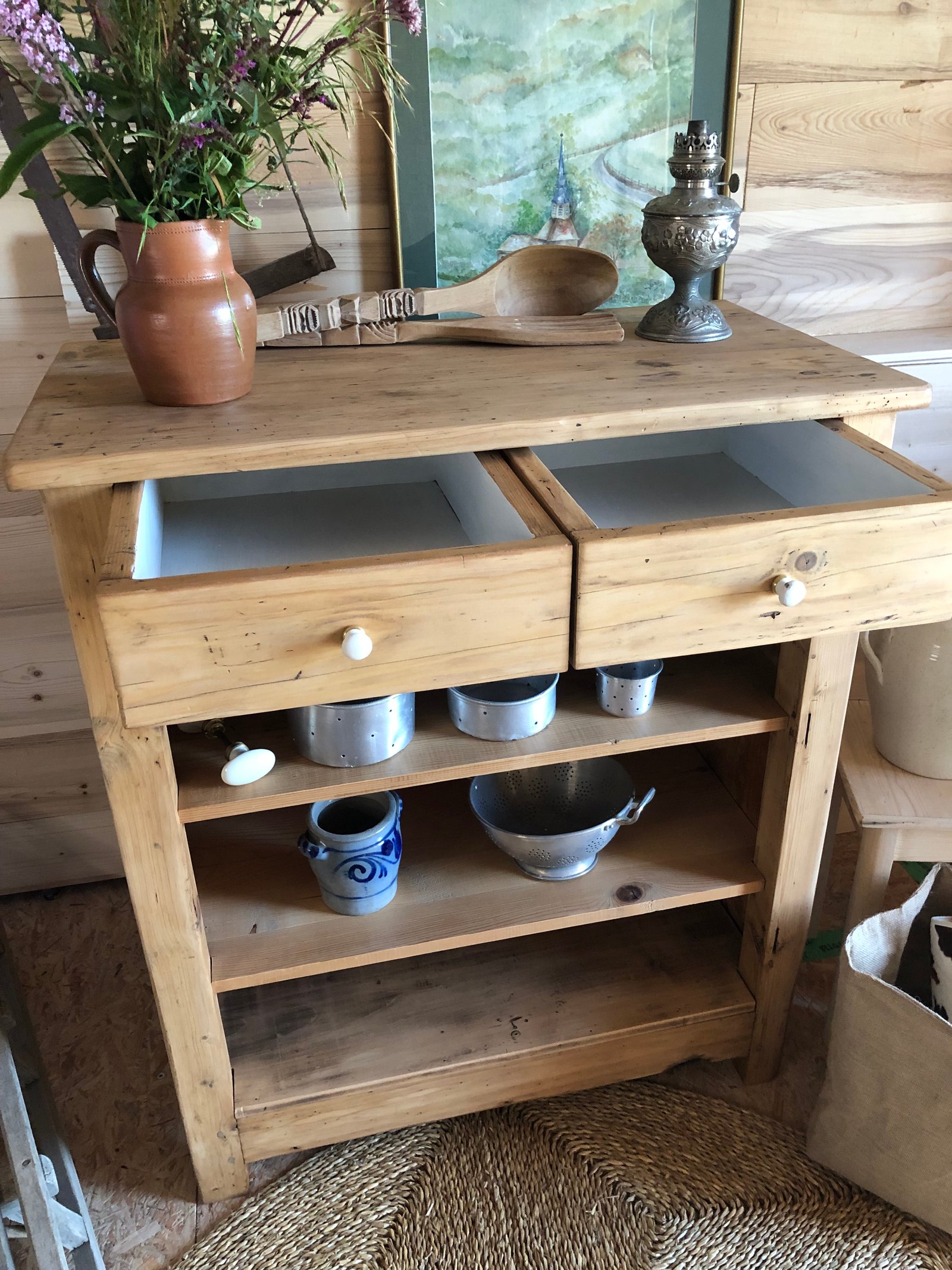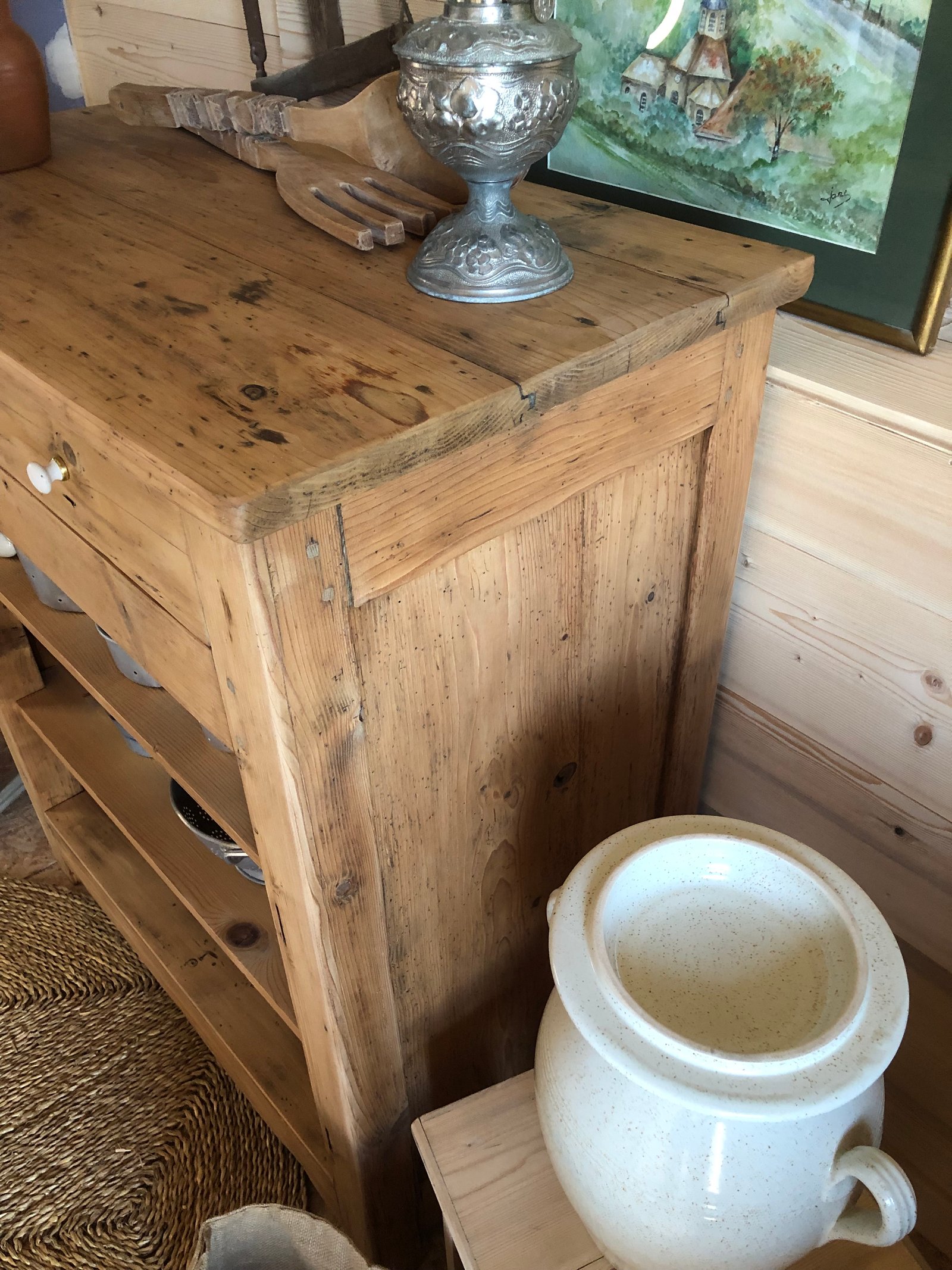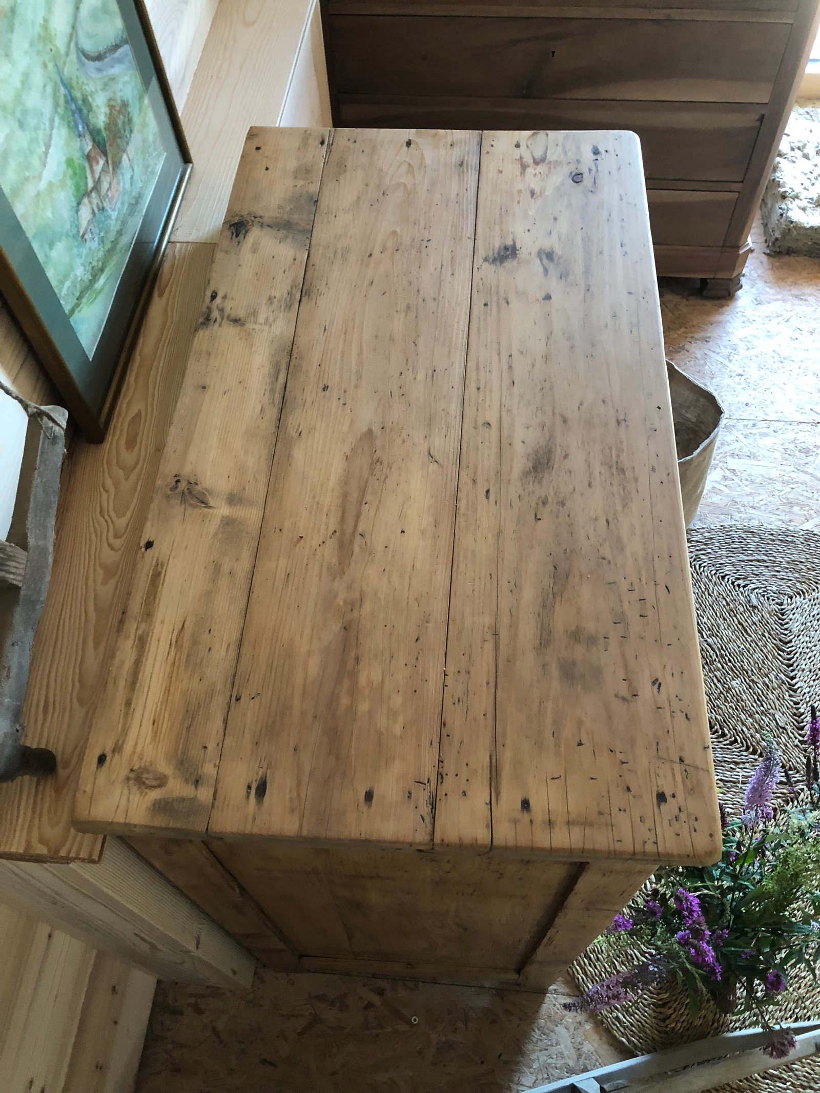Lignes simples et robustes, il est savoyard, y’a pas de doute. Authentique et très ancien comme en témoignent les vrillettes et les chevilles d’assemblage. Entièrement nettoyé, poncé, traité & verni. Tiroirs à queue d’aronde, boutons d’origine, intérieur peint en blanc «wimborne white » de Farrow and Ball. Meuble authentique avec quelques imperfections sans conséquence pour son utilisation et qui font tout son charme. Dimensions du plateau : 93*52