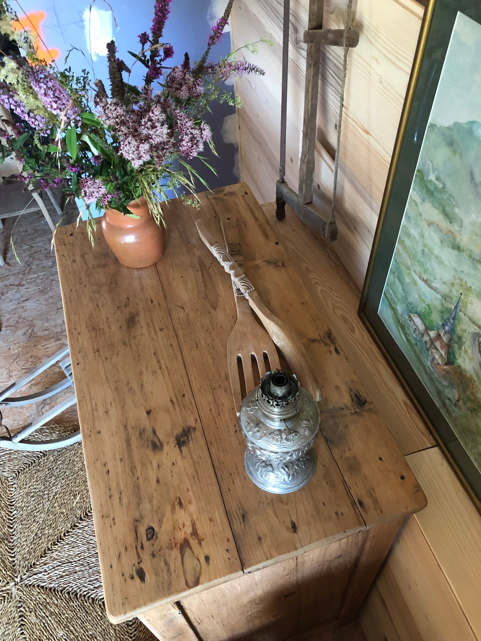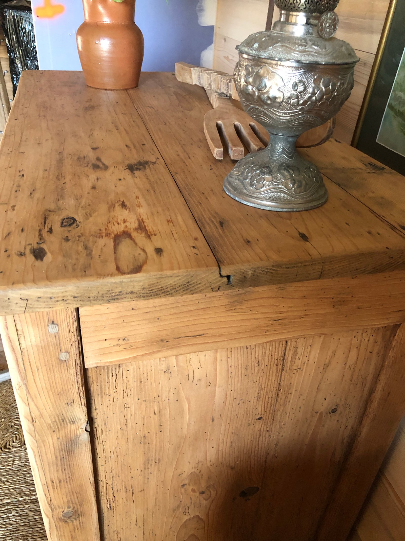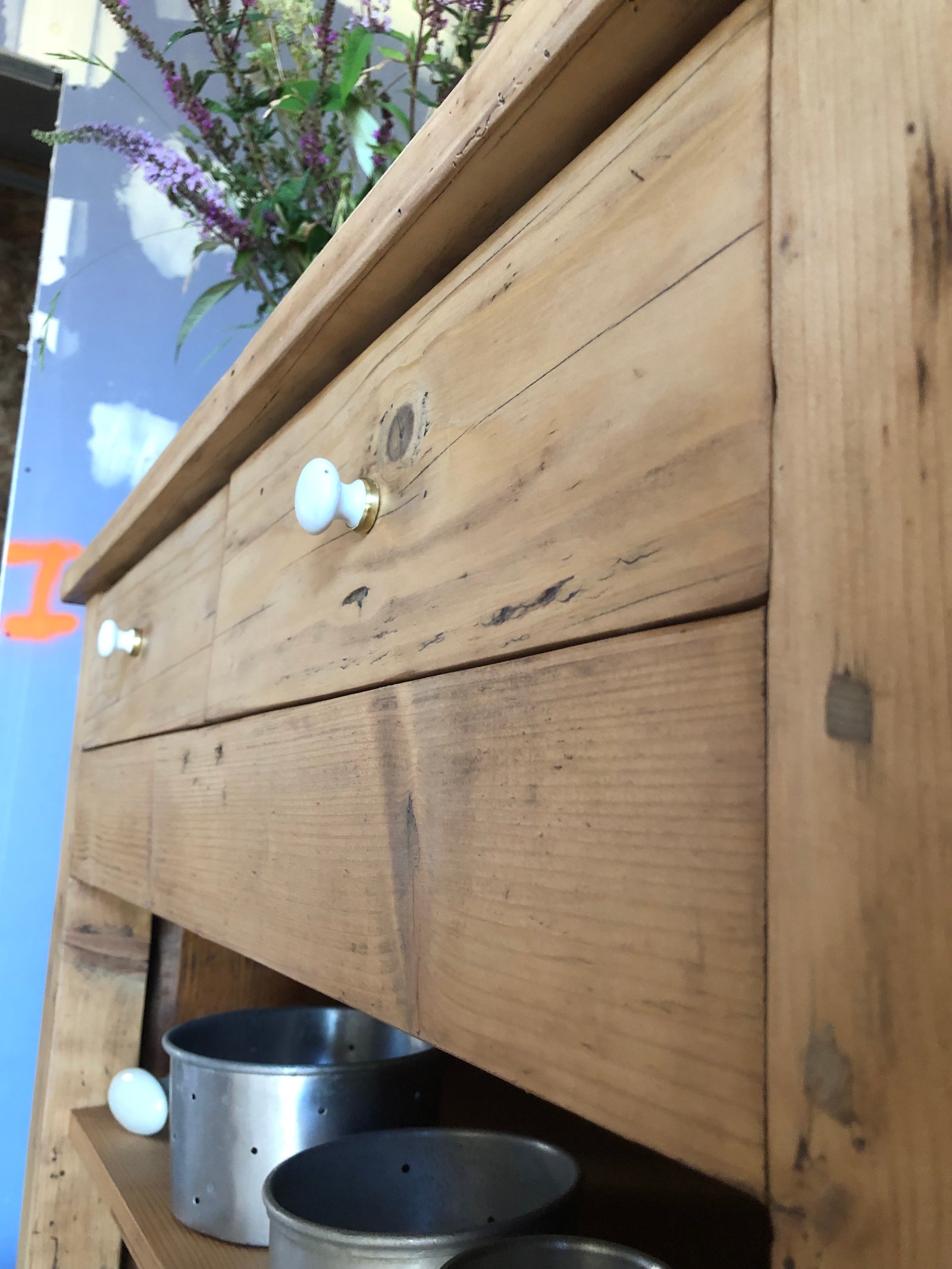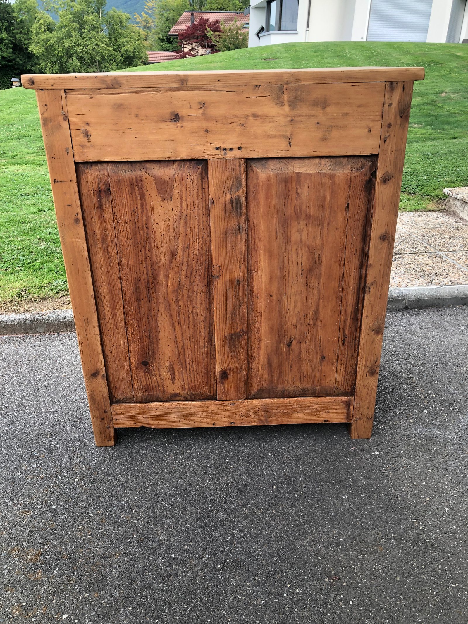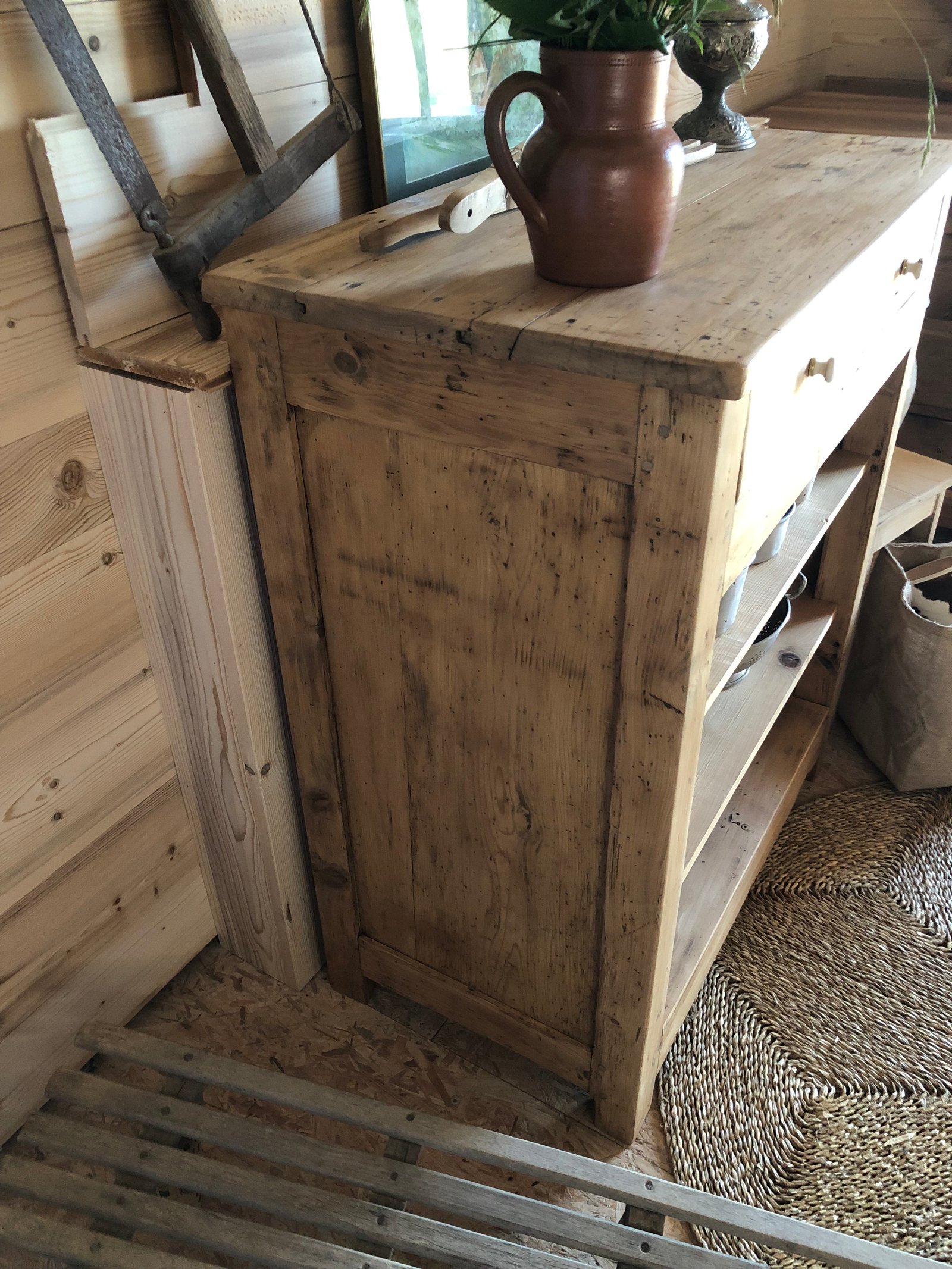 Lignes simples et robustes, il est savoyard, y’a pas de doute. Authentique et très ancien comme en témoignent les vrillettes et les chevilles d’assemblage. Entièrement nettoyé, poncé, traité & verni. Tiroirs à queue d’aronde, boutons d’origine, intérieur peint en blanc «wimborne white » de Farrow and Ball. Meuble authentique avec quelques imperfections sans conséquence pour son utilisation et qui font tout son charme. Dimensions du plateau : 93*52