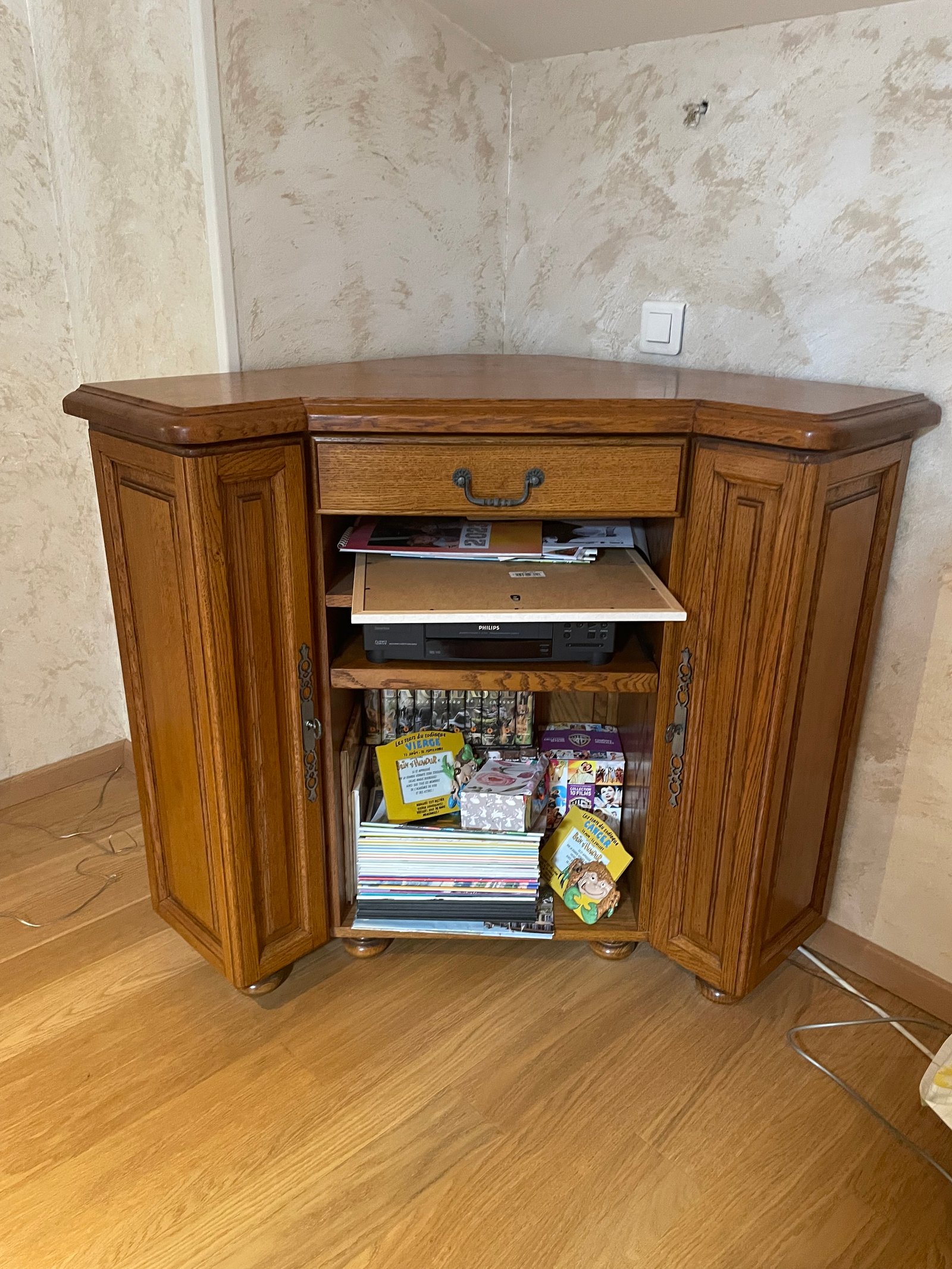 Meuble télé à angle en bois de chêne, composé de 3 rangement, 1 tiroirs et 2 rangement à porte battante, un peu abimé sur le plateau mais avec la télévision posée dessus cela ne se voit plus.
