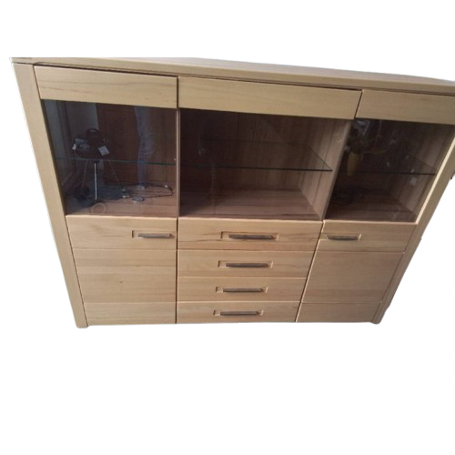 Ce buffet haut Ars Natura – série NatureStar allie design naturel et qualité de fabrication. La façade est réalisée en verre et duramen de hêtre massif verni, tandis que le corps est en panneau aggloméré plaxé, garantissant robustesse et durabilité. Le bois massif provient de Slovaquie et présente une veinure naturelle. Le meuble dispose de 3 portes vitrées et 4 tiroirs équipés d’un système de fermeture amortie, offrant un rangement pratique et sécurisé. Les poignées métalliques solides assurent un usage durable et fonctionnel. Avec ses lignes claires, sa forme géométrique et son harmonie de design, ce buffet s’intègre facilement dans tout type d’intérieur. Il est conçu pour être monté à la livraison et convient à un usage quotidien en salon ou salle à manger.