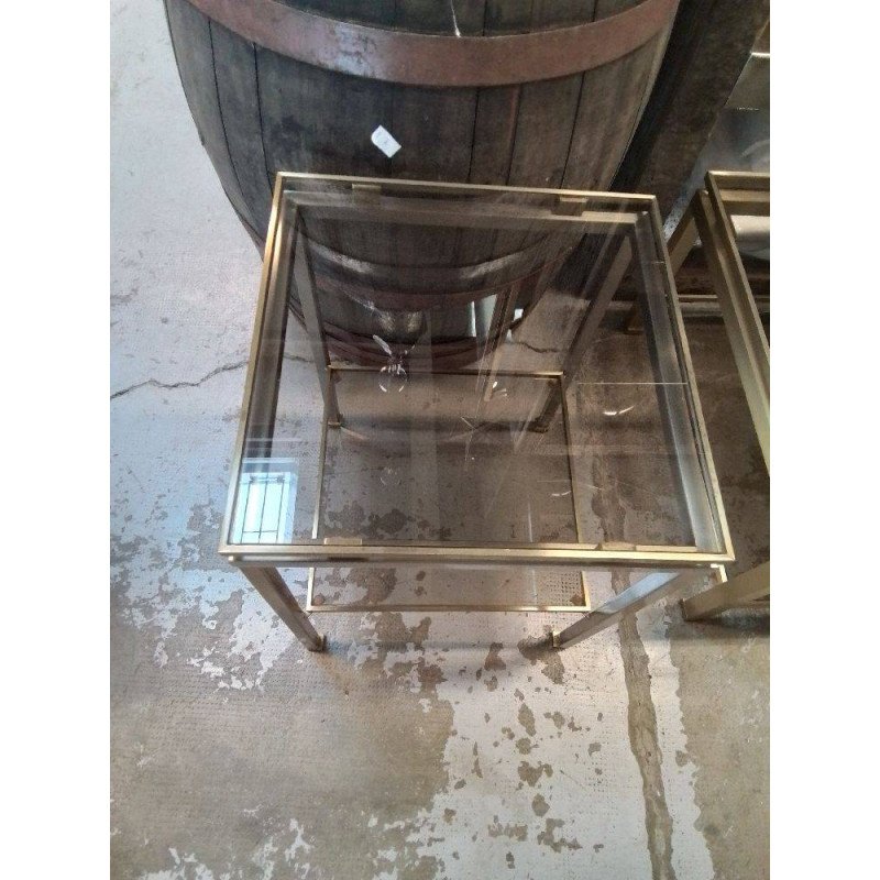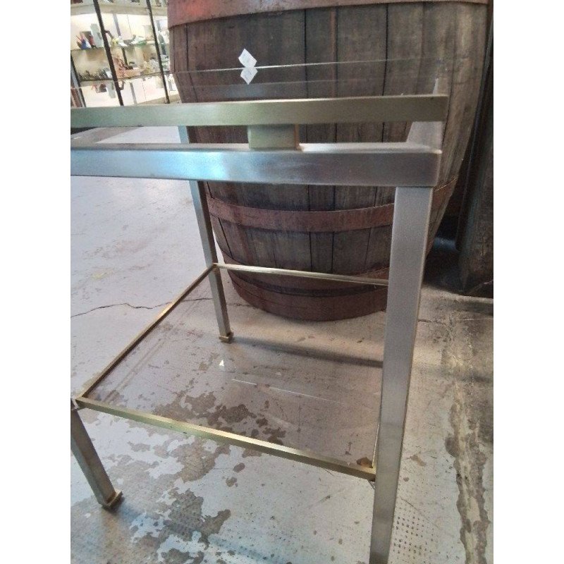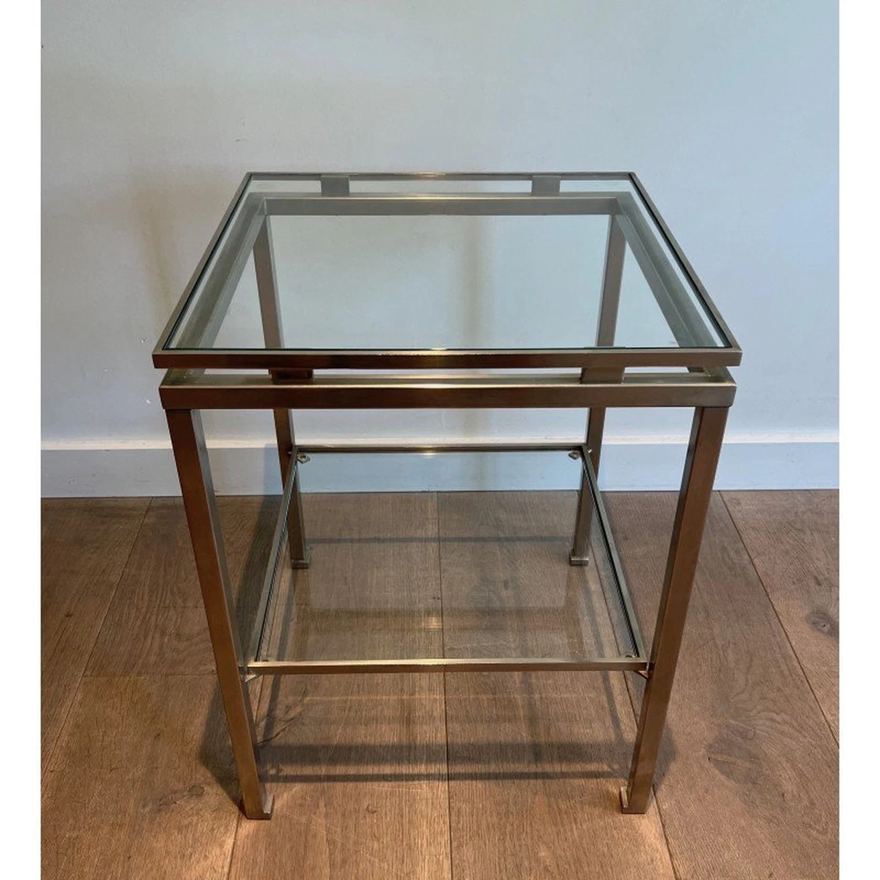 Élégant et minimaliste, ce guéridon signé Guy Lefèvre illustre le style raffiné du designer français, alliant acier brossé et plateaux en verre fumé. Édité par la prestigieuse Maison Jansen dans les années 70, il se distingue par ses lignes sobres, ses proportions équilibrées et l’effet de lévitation créé par l’espace sous le plateau. Polyvalent, ce petit meuble peut servir de bout de canapé, table d’appoint ou chevet, apportant une touche d’élégance et de design vintage à votre intérieur. Il présente de légères traces d’usage, sans altérer son esthétisme ni sa solidité.