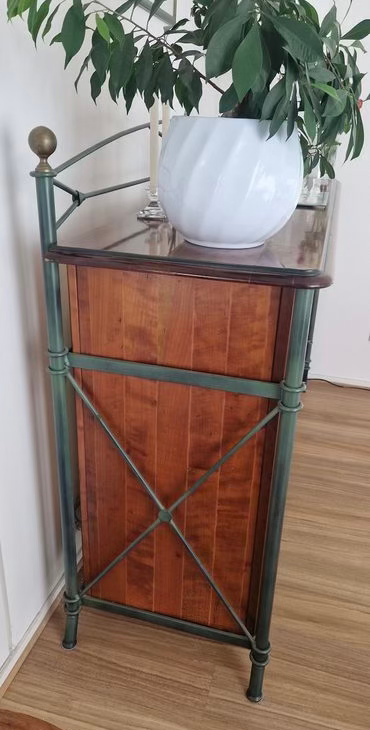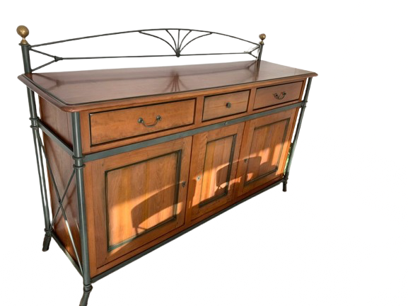Buffet en merisier massif et fer forgé, alliant élégance et solidité, parfait pour une salle à manger ou un séjour. Il est composé de deux grands tiroirs latéraux, d’un tiroir central plus petit, ainsi que de trois portes battantes offrant un large espace de rangement pour vaisselle, linge de table ou divers objets. La structure associe le bois de merisier aux teintes chaudes et le fer forgé noir mat, apportant une touche à la fois classique et industrielle. Le plateau supérieur en bois massif est soigneusement fini et rehaussé d’un élément décoratif en fer forgé avec embouts dorés. Ce meuble de qualité s’intègre facilement dans une décoration mêlant bois et métal.