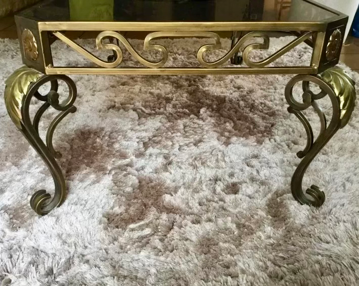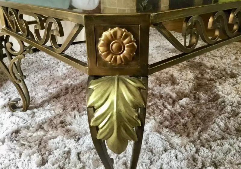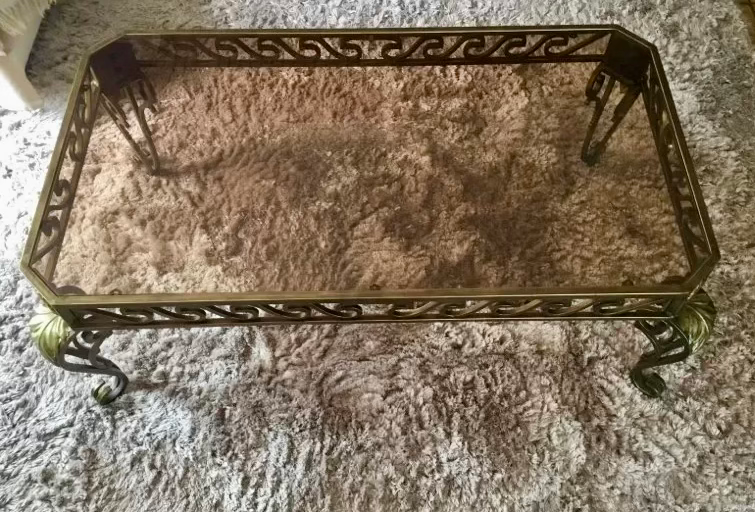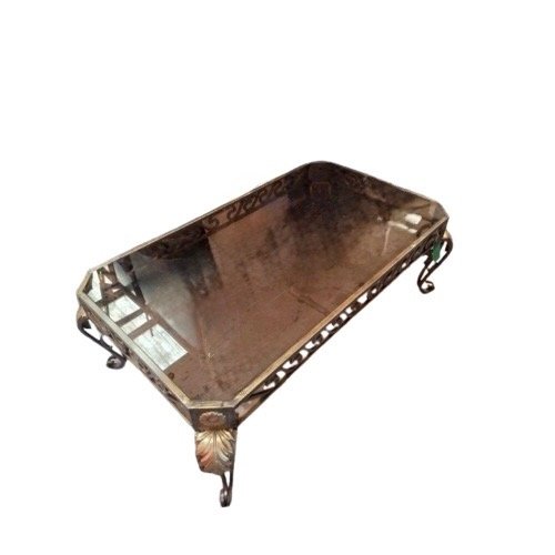 Table basse rectangulaire avec structure en fer forgé à finition dorée, ornée de motifs décoratifs sur les côtés et les pieds. Le plateau est en verre fumé épais, encastré dans la structure métallique. Les pieds courbés et les détails en relief (motifs de feuilles et volutes) lui donnent un charme vintage et élégant.
