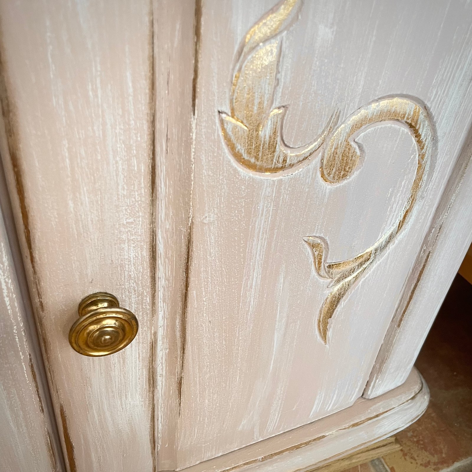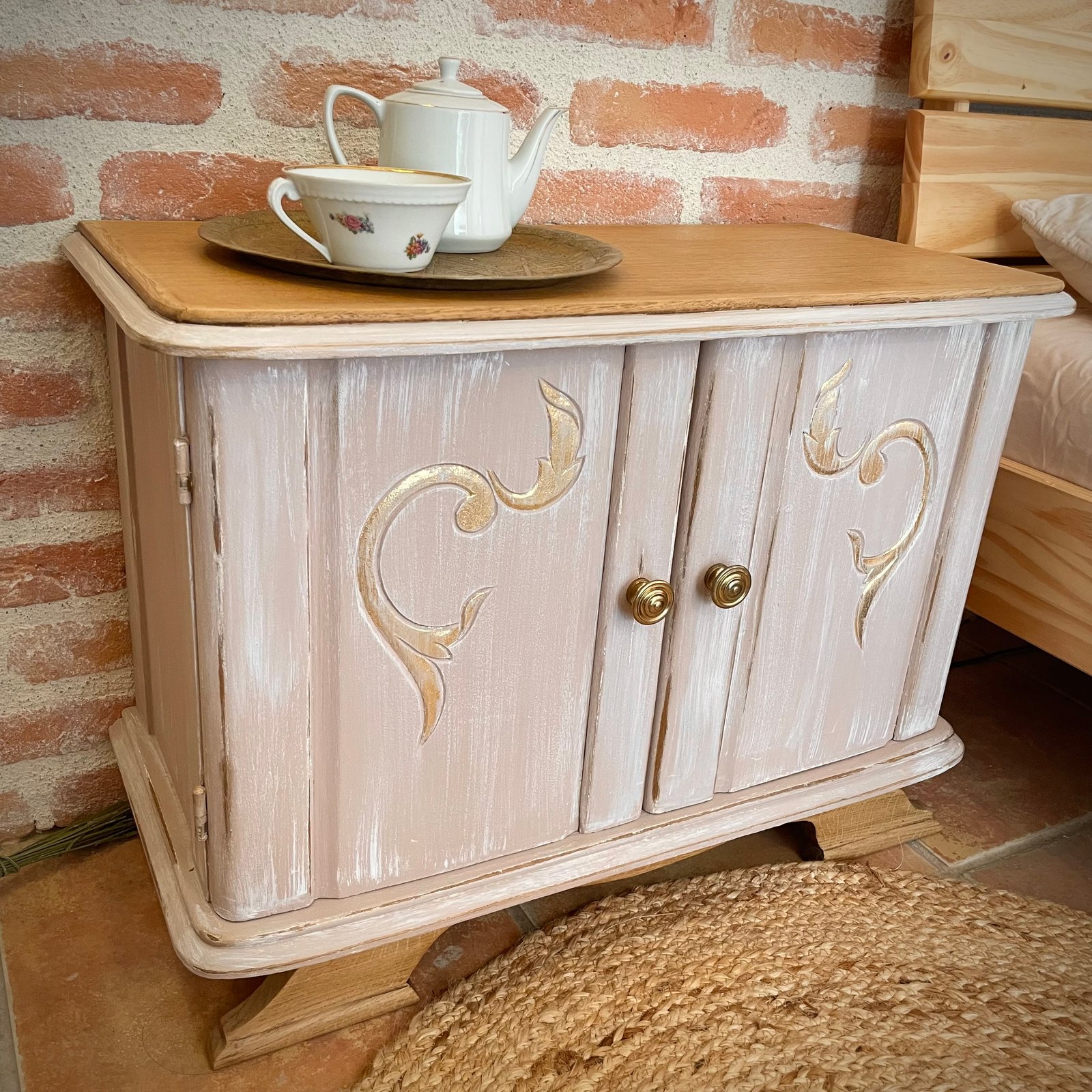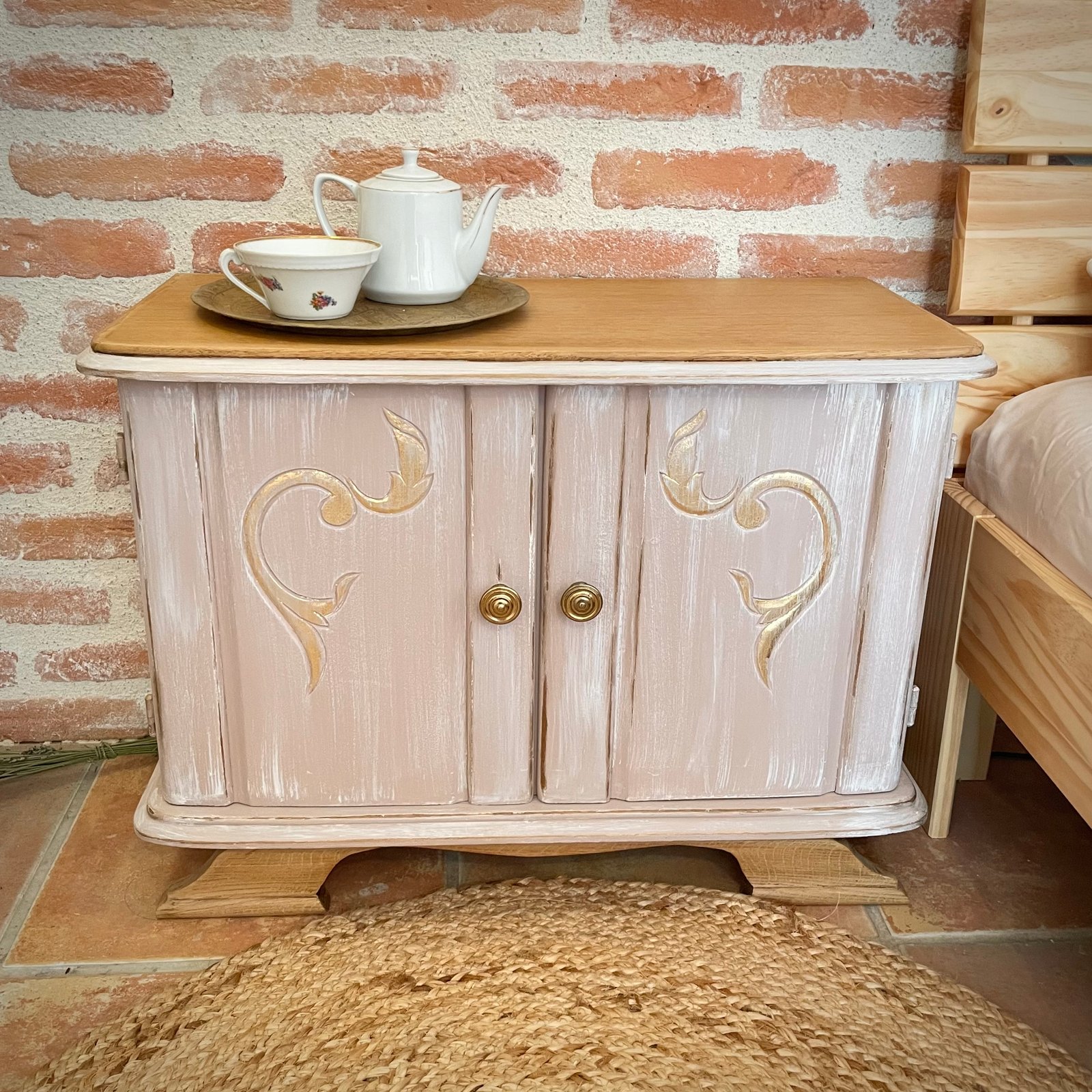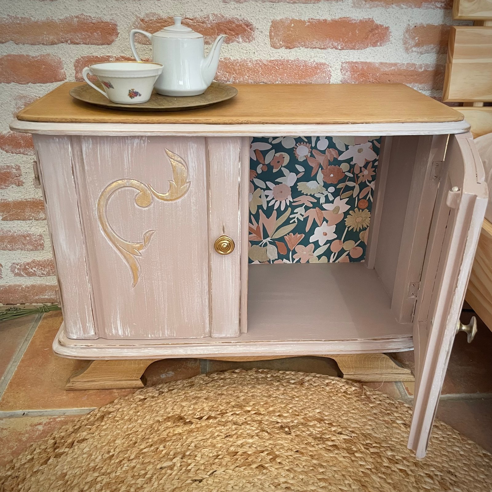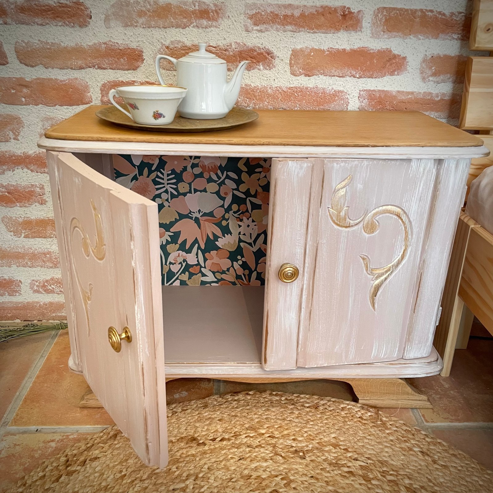 Petit chevet Art Déco revisité Ce joli chevet des années 40/50 a retrouvé tout son charme grâce à un relooking doux et lumineux. - Sa structure a été patinée dans un rose poudré délicatement brossé de blanc, pour un effet légèrement vieilli. - Les motifs sculptés ont été soulignés de doré, apportant une touche élégante et raffinée. - L’intérieur a été tapissé d’un papier fleuri aux tons frais et joyeux. - Le plateau a été laissé en bois naturel et protégé par un vernis mat incolore. Ce petit meuble trouvera facilement sa place en chevet ou petit rangement décoratif. Son format compact et son style unique en font une pièce pleine de caractère.