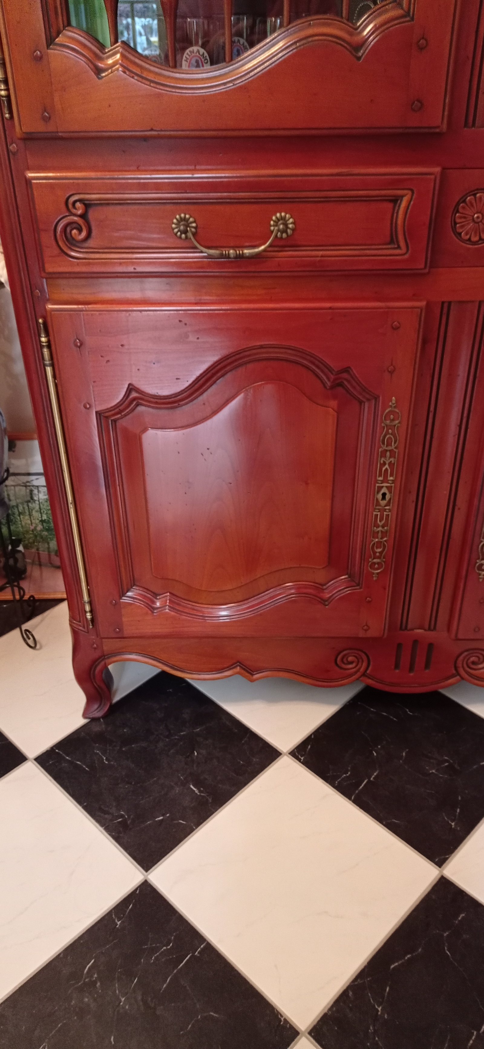 Buffet en merisier massif, de style Cheverny, en très bon état. Ce meuble combine charme classique et praticité, parfait pour une salle à manger ou un salon raffiné. Caractéristiques principales : - Matériau noble : bois de merisier massif, robuste et chaleureux - Élégance du design : moulures sculptées, motifs floraux décoratifs et piètement galbé - Vitrine supérieure : 2 portes vitrées avec barreaux tournés, idéales pour exposer verres, vaisselle ou objets décoratifs Rangements pratiques : 2 tiroirs + 2 placards bas fermés pour une grande capacité de stockage Ce buffet allie authenticité, robustesse et esthétisme intemporel. Il s’intègre aussi bien dans un intérieur classique que dans une décoration plus contemporaine en jouant sur le contraste bois et modernité.