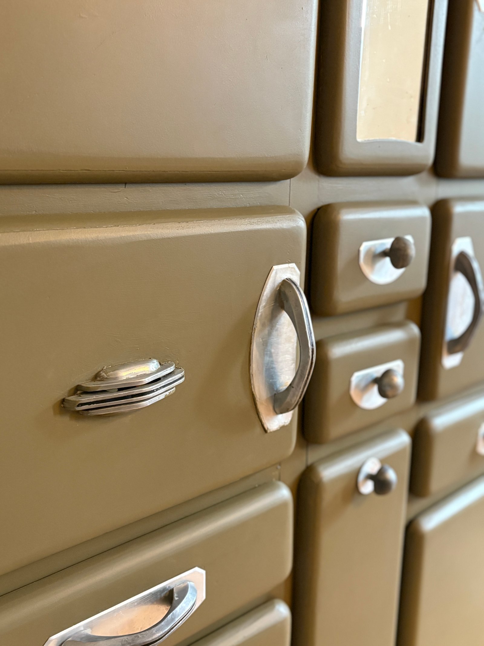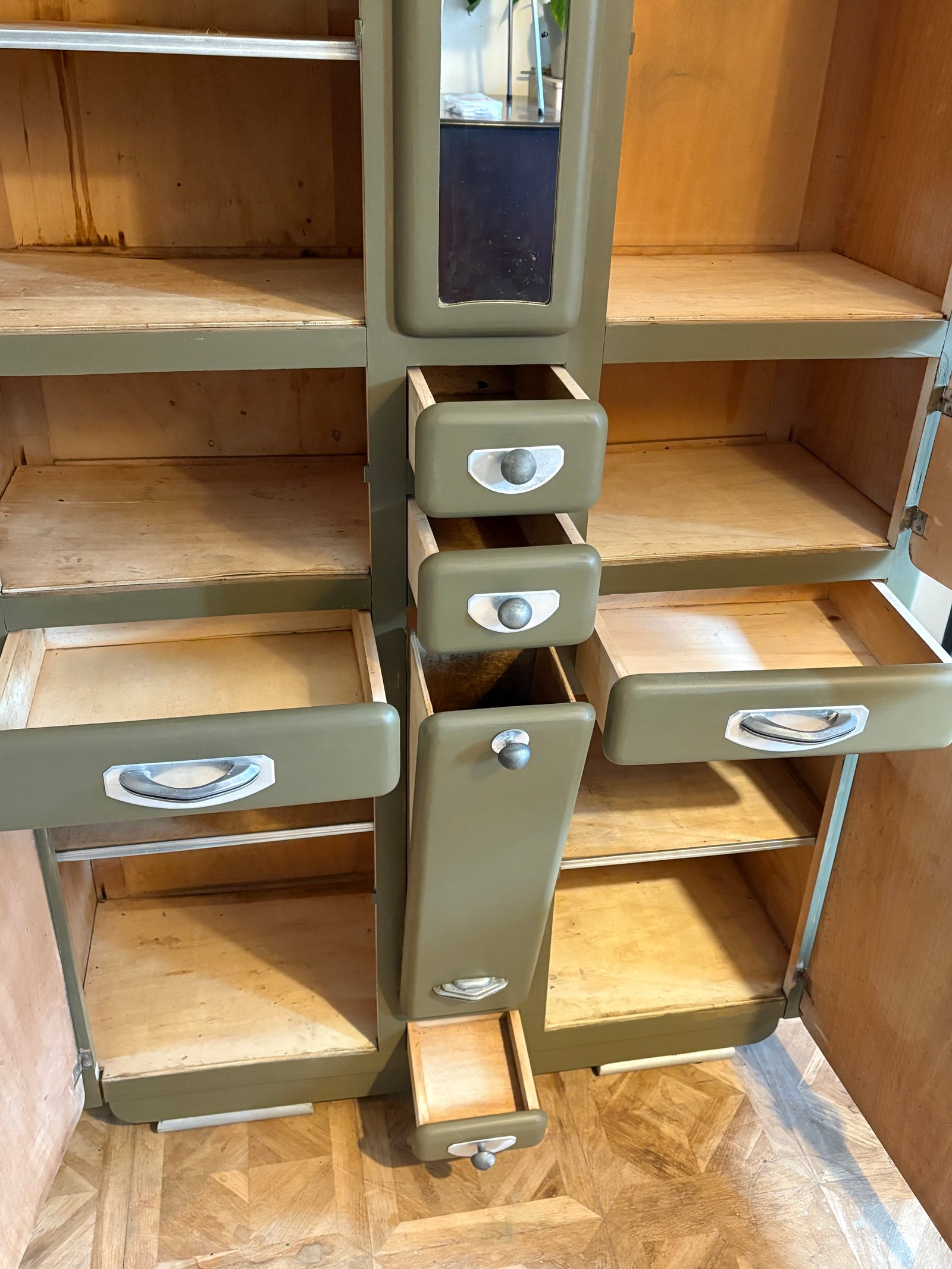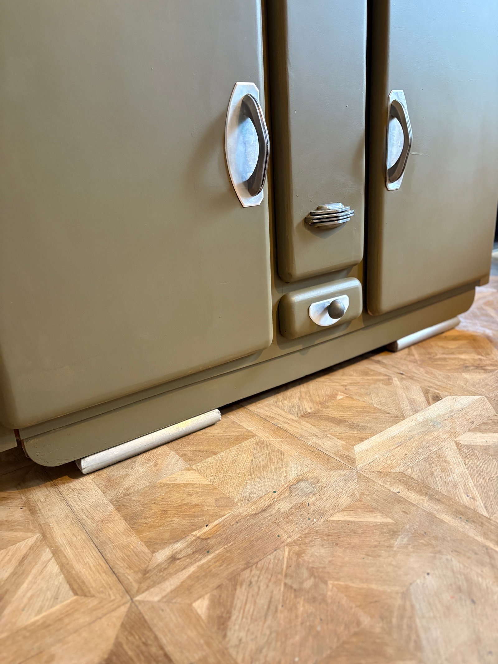 Buffet Mado vintage des années 50 entièrement rénové, ce meuble rétro combine authenticité et fonctionnalité. Sa finition élégante en peinture à la caséine vert feuillage mat lui confère un style unique, rehaussé par des poignées et parements en chrome lustré. Compact mais spacieux, il offre un grand volume de rangement grâce à sa composition pratique : six portes ouvrant sur étagères, deux grands tiroirs, trois tiroirs centraux et une huche à pain. Idéal pour une cuisine, une salle à manger ou tout intérieur au style vintage ou contemporain, ce buffet Mado des années 50 rénové apporte caractère, élégance et praticité à votre décoration.
